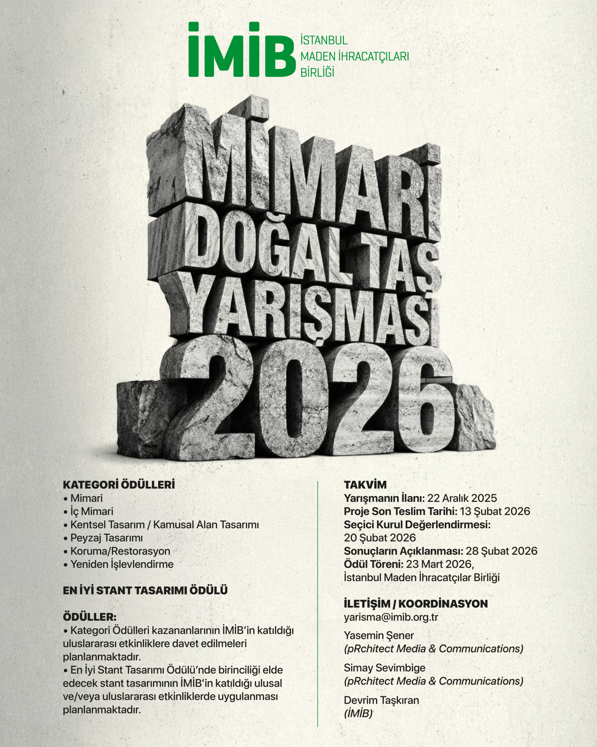 İstanbul Maden İhracatçıları Birliği (İMİB), T.C. Ticaret Bakanlığı desteğiyle düzenlenen 13. Mimari Doğal Taş Yarışması ile Türk doğal taşlarının mimarlık ve tasarım alanlarındaki çağdaş, nitelikli ve yenilikçi kullanımını desteklemeyi sürdürüyor. Yarışma, doğal taşın estetik, yapısal ve kültürel potansiyelini farklı ölçeklerde üretilmiş projeler aracılığıyla görünür kılmayı amaçlıyor.