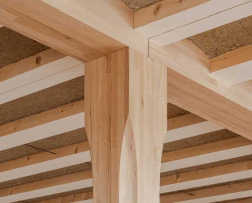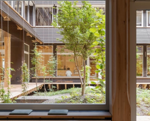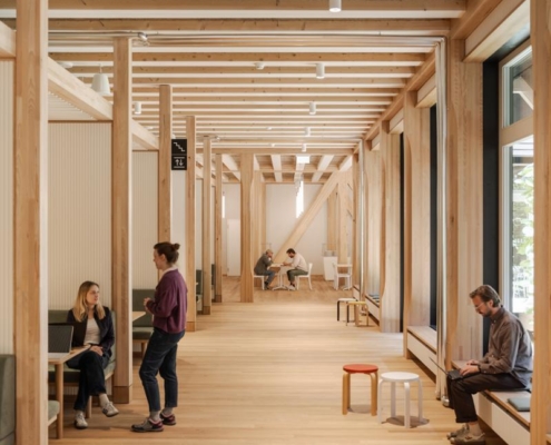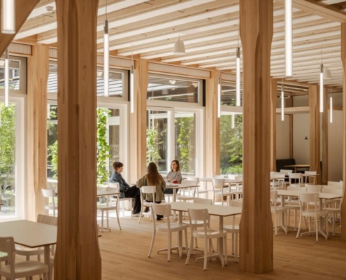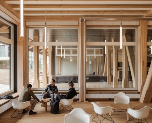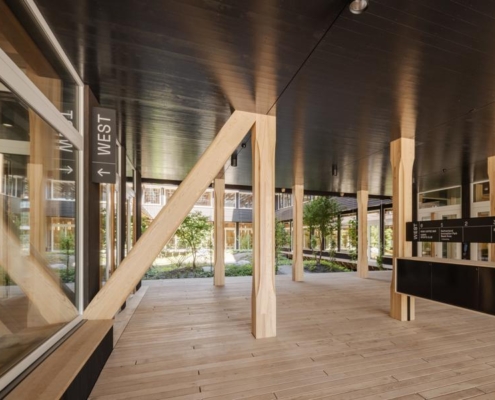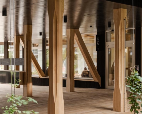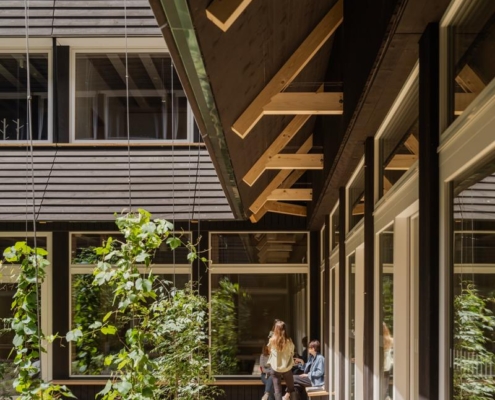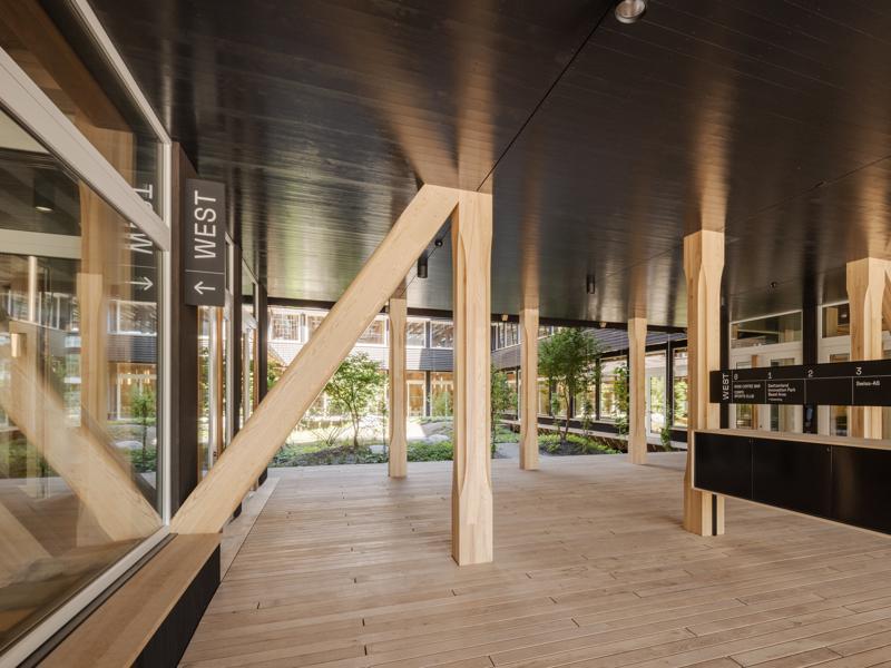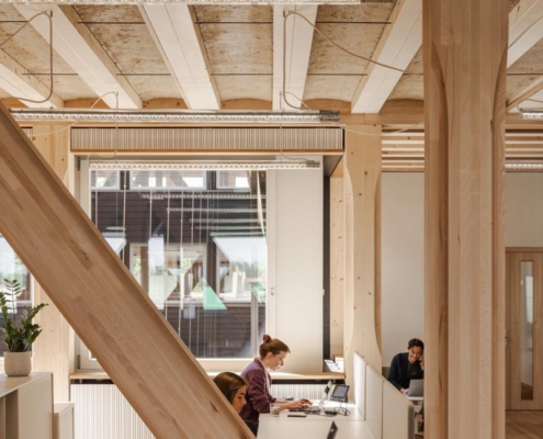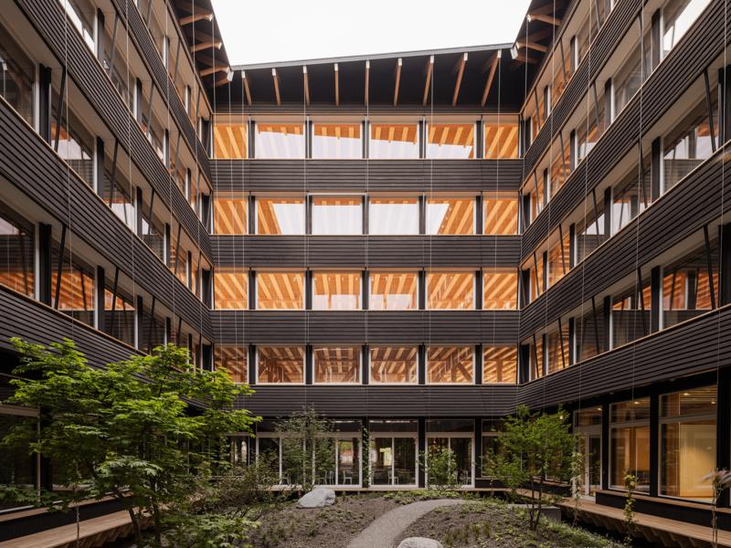 Yapı, yeşil bir avlunun etrafında konumlanan dört katlı ahşap iskelet sistemine sahip. Binanın altında beton bodrum bulunmuyor; yapının hafifçe yükseltilmiş formu havalandırmayı destekleyerek yazın serin, kışın sıcak bir mikroiklim sağlıyor. Güneydeki geniş bir geçit, peyzaj mimarı Piet Oudolf tarafından tasarlanan bahçeye açılıyor. Avlu cephelerinde yükselen sarmaşıklar, çiçekli otsu bitkiler ve yoğun bitki dokusu yer alıyor. Bahçenin altında bitkileri ve sanitasyon ihtiyaçlarını karşılamak için yağmur suyu deposu bulunuyor. Avludaki ahşap veranda çalışanlar ve ziyaretçiler için bir dinlenme alanı sunuyor.