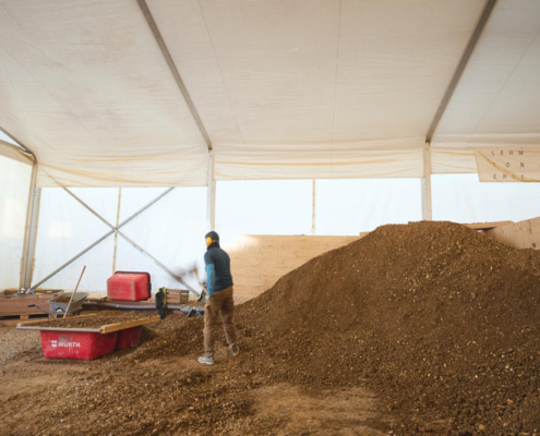 Hortus ismi Research, Technology, Utopia ve Sustainability kavramlarını temsil ediyor. Tasarım süreci malzemelerin bilimsel analizleri ile başlamış; doğal, yenilenebilir ve yeniden kullanılabilir malzemeler seçilmiş. Ahşap, sıkıştırılmış kil ve selüloz kullanılarak oluşturulan ahşap ve kil hibrit taban sistemi yerinde üretilmiş. Bu sistem geleneksel beton tabanlara göre on kat daha düşük karbon salımı sağlıyor. Tüm yapı elemanları gelecekte tekrar kullanılmak üzere kataloglandı.