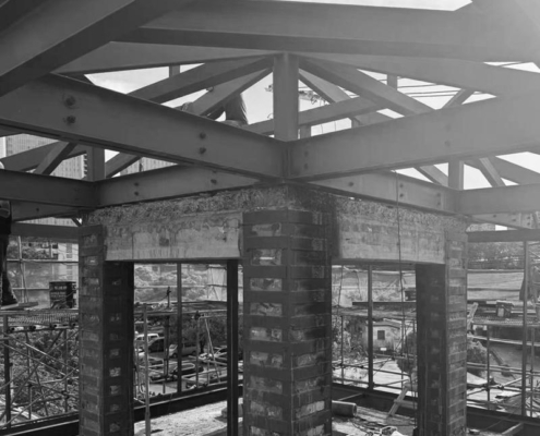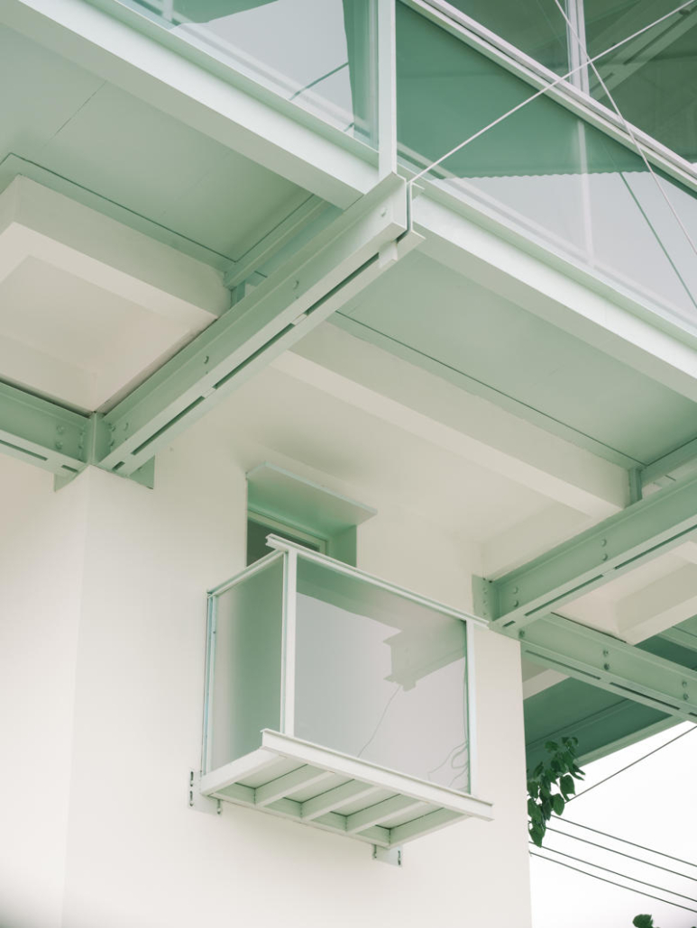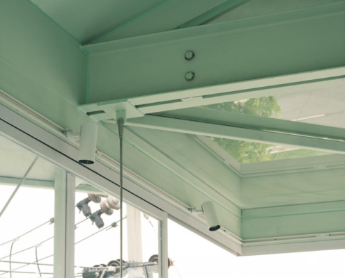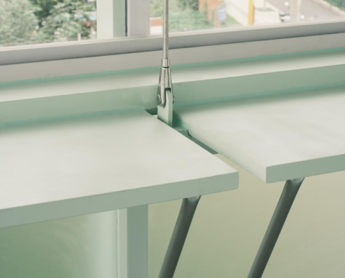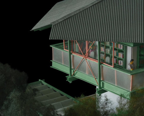 Yeni işlevi karşılayabilmek ve ek yükü minimumda tutmak amacıyla, yapı için askılı bir çelik taşıyıcı sistem geliştirilmiş. Güçlendirilmiş çatı beton kirişleri üzerine yerleştirilen C profiller, ikinci kat platformunun dışa doğru genişletilmesini sağlamış. Bu sistem, iki kişinin yan yana dolaşmasına ve oturarak okuma alanlarının oluşturulmasına olanak tanıyor. Askı çubukları ve çelik profillerle oluşturulan yeni döşeme, çatıdan asılarak bütüncül ve dengeli bir taşıyıcı çerçeve oluşturulmuş. Mevcut pencere boşlukları kullanılarak iç ve dış mekanı ilişkilendiren bir konsol eklenmiş.