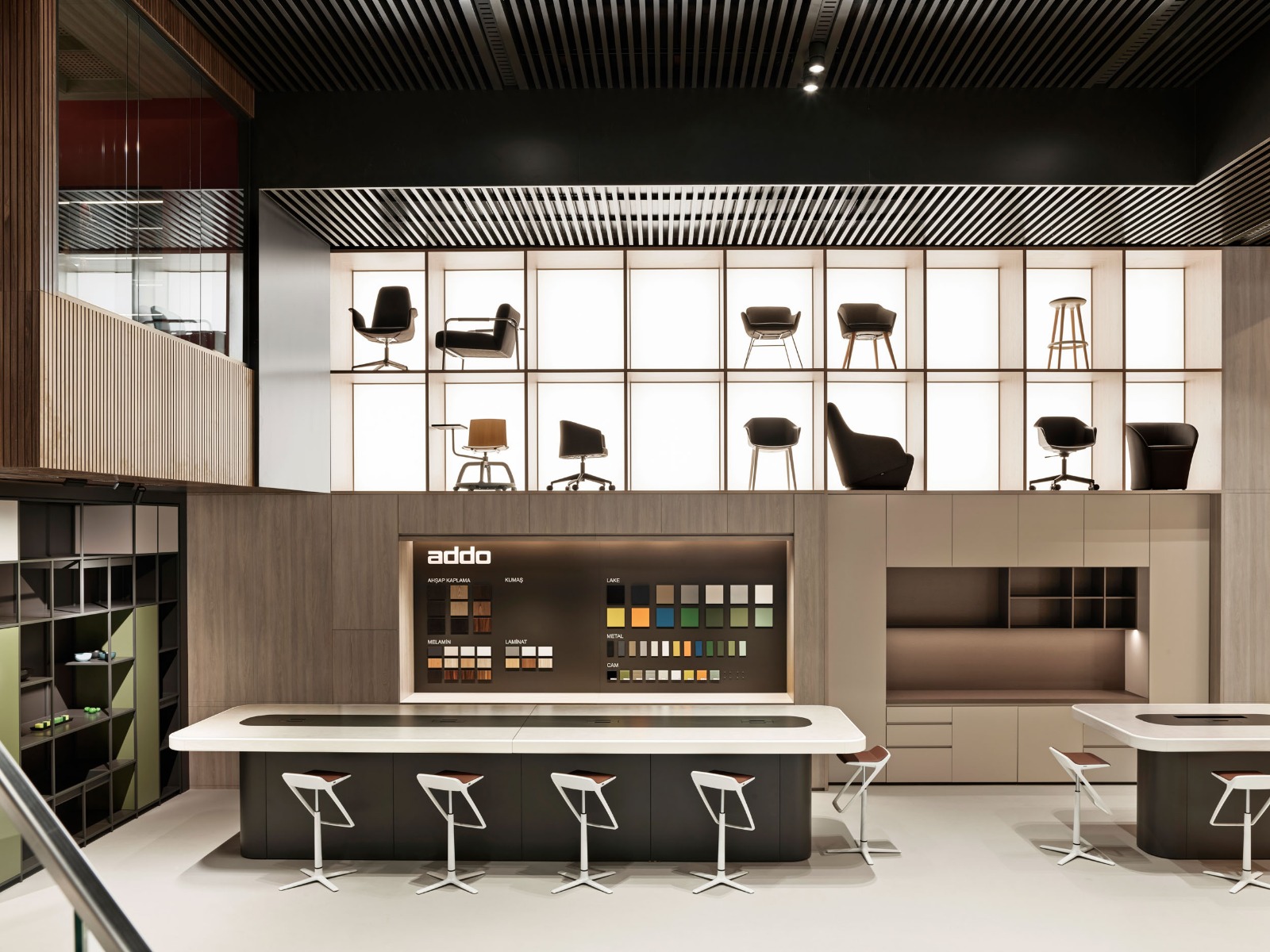 Addo’nun 1992 yılından bu yana sürdürdüğü tasarım anlayışı, üretim kalitesi ve iş birliğine dayalı büyüme vizyonunun bir yansıması olan yeni showroom; yalnızca bir ürün sergileme alanı değil, ofisler ve çalışma kültürü üzerine kapsamlı bir deneyim merkezi olarak tasarlandı.