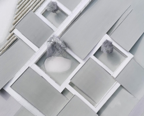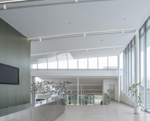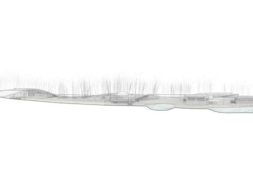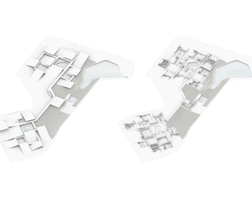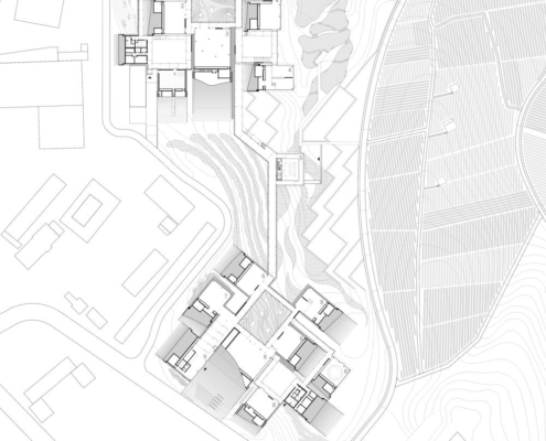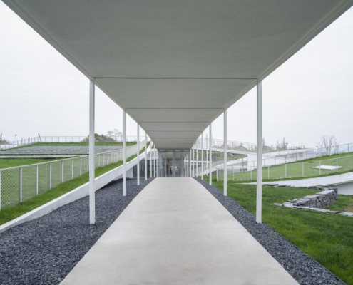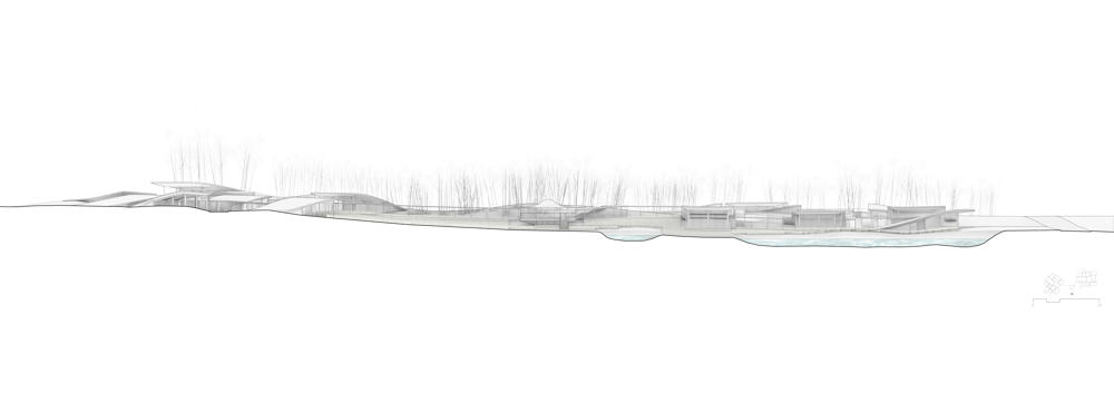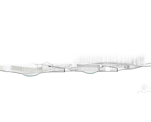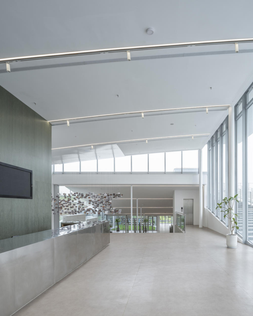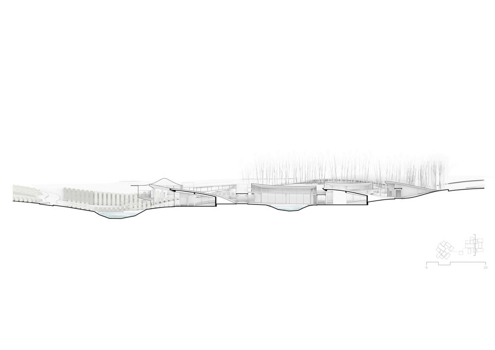 Anji’nin dalgalı çay tarlaları, doğal topoğrafyanın insan eliyle yapılmış bir soyutlamasını temsil ediyor; çay ekiminin ritmiyle şekillenen eşsiz bir ekili peyzaj türü sunuyor. Projede tercih edilen mimari dil de benzer bir strateji benimsiyor. Planda, kentsel bir uzantıyı anımsatan ortogonal bir ızgarayı takip ediyor; ancak kesitte, alanın doğal dalgalanmalarını yansıtıyor ve güçlendiriyor. Bu ikili jest sadece binanın işlevsel ihtiyaçlarına hizmet etmekle kalmıyor, aynı zamanda orijinal arazinin gizli düzeniyle rezonansa girerek peyzajın kendisinin yeniden oluşumuna dönüşüyor. Mimari, kıvrımlı çay tarlalarıyla birlikte bu arazide yeni bir melez peyzajın oluşmasına yardımcı oluyor.