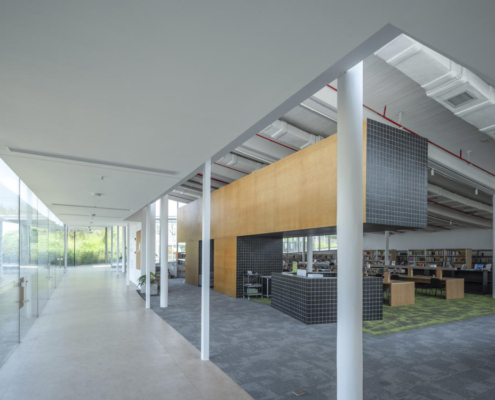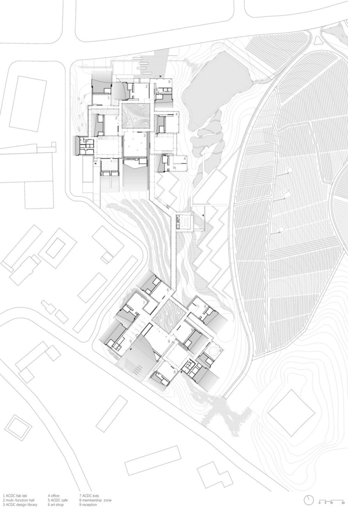 ACDC’nin yerleşim planı, esnek mekansal dağılımın özgün mimari stratejisinden faydalanıyor. Çeşitli büyüklüklerdeki sergi salonları dalgalı araziye dağılmış ve kapalı yürüyüş yollarıyla birbirine bağlanmış. Bu yaklaşım, sergi salonları, çalışma alanları, eğitim alanları, perakende satış alanları ve çay salonlarından oluşan dağınık ancak birbiriyle bağlantılı kümelerin birden fazla amaca hizmet etmesini sağlıyor: Farklı yaratıcı çalışma biçimlerini barındırmak, farklı kullanıcı gruplarına hitap etmek ve hem bağımsız hem de ortak programlar aracılığıyla bir dizi tematik kültürel etkinliği desteklemek.