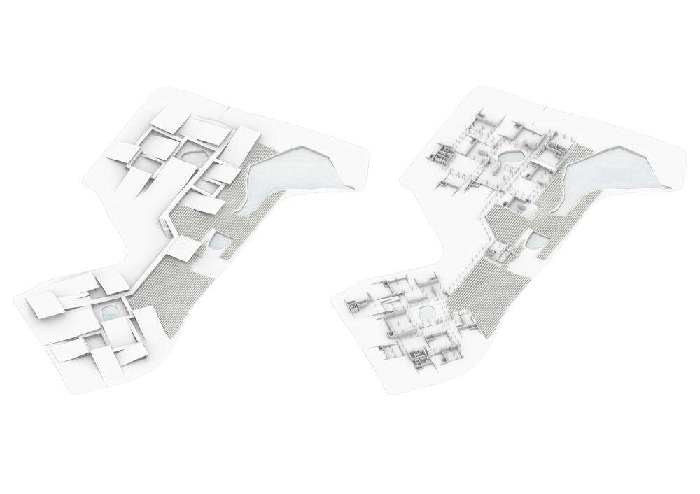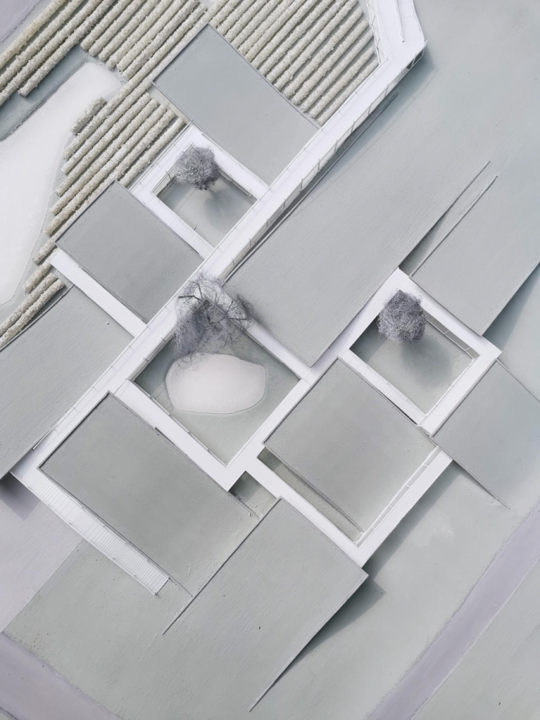 Bu manzara sadece görsel bir etki yaratmıyor. Tasarım geleneksel avlu ve koridor tipolojisini kullanırken, aynı zamanda avluları yürünebilir topoğrafyalar haline getiriyor. Merkez ister açık ister kapalı olsun, ziyaretçiler avluların ve koridorların üst yüzeyleri boyunca serbestçe dolaşabiliyorlar, mimariyi sanki alanların içinde hareket ediyormuş gibi deneyimleyebiliyorlar.
