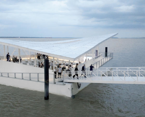 Yaklaşık 400 metrekarelik alanı kapsayan yapı, su üzerinde dengede kalma, yer değiştirme ve kaldırma kuvveti ilkelerine dayanan batabilir bir sistemle çalışıyor. Yapı, suyu tutup bırakarak deniz seviyesi ve kullanıcı yoğunluğundaki değişimlere sürekli olarak uyum sağlıyor ve çevresindeki su seviyesine minimum bir kot farkıyla eşlik ediyor. Bu sayede ziyaretçiler, deniz seviyesindeki dalgalanmaları göz hizasında deneyimleyerek doğal sistemler ile yapılı çevre arasındaki ilişkiyi doğrudan algılayabiliyor.