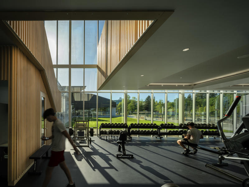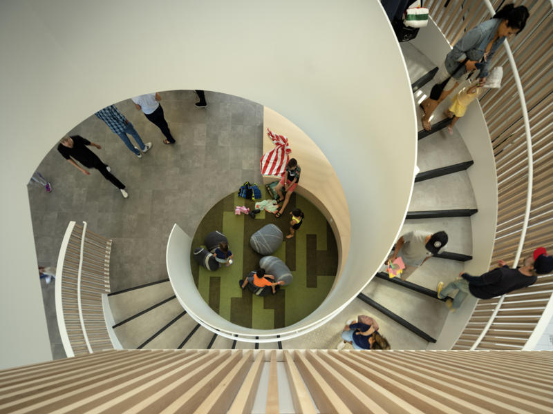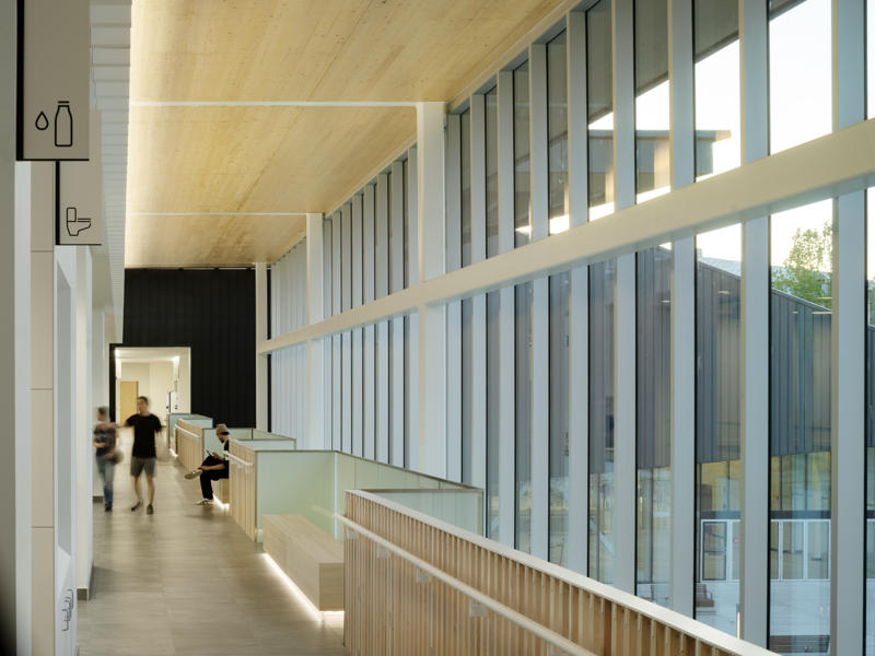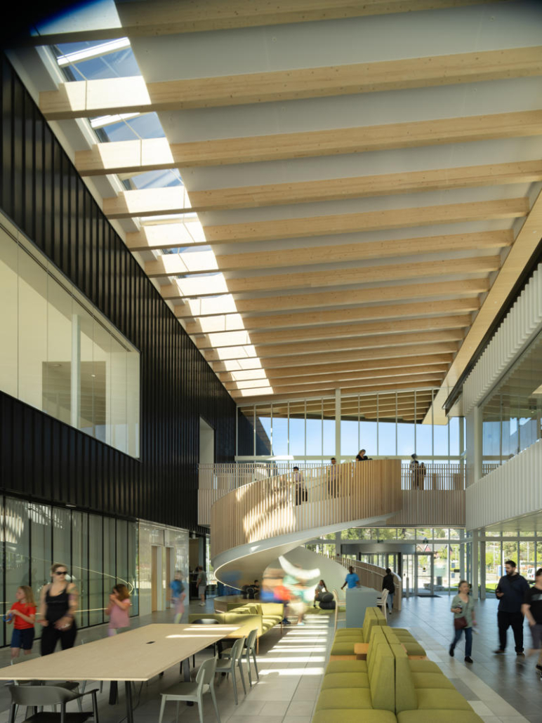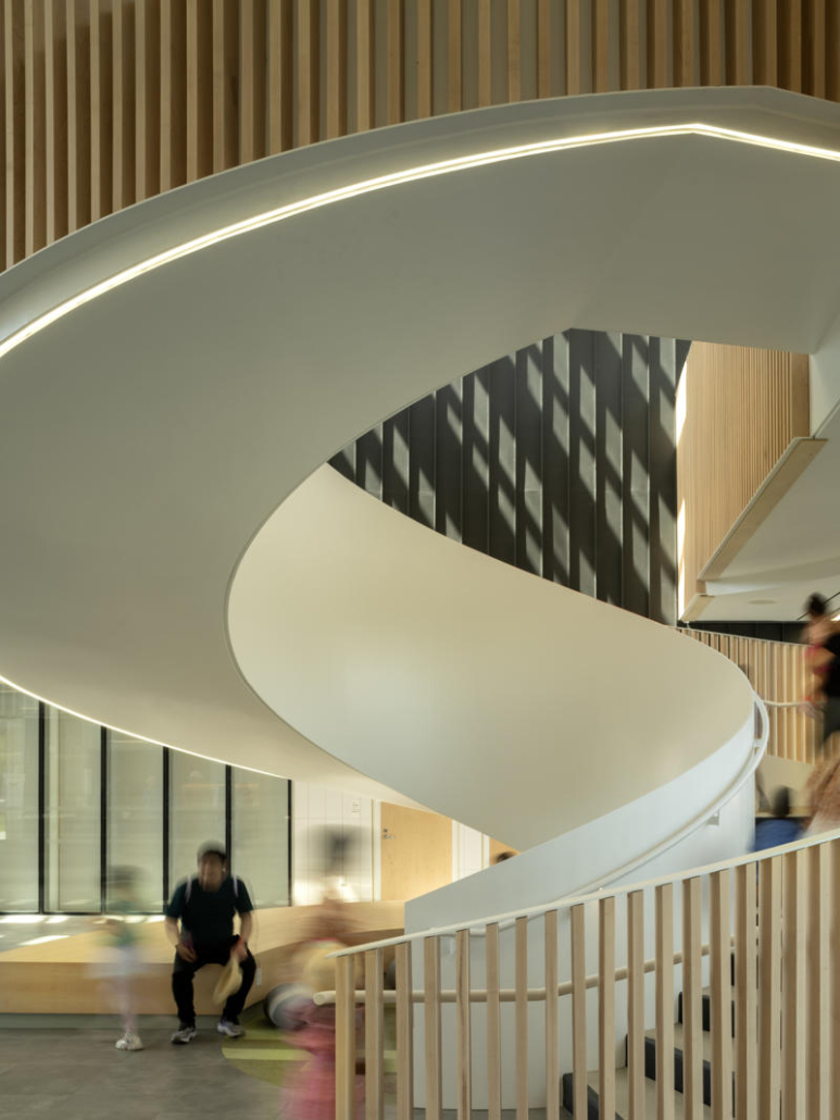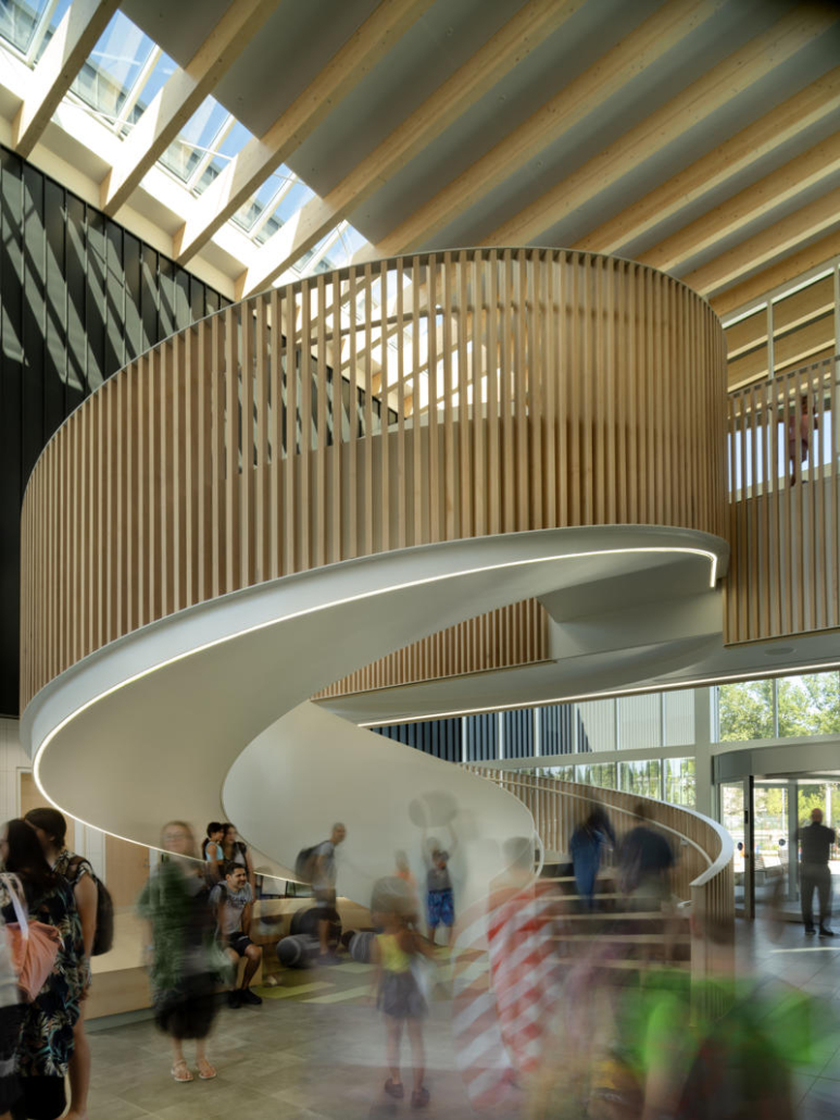 İç mekanın kalbinde yer alan çift yükseklikli lobi, büyük bir topluluk holü olarak çalışıyor. Ahşap glulam kirişler, ışık bantları ve heykelsi spiral merdivenle tanımlanan bu alan, binanın doğu ve batı kanatlarını birbirine bağlıyor. Geniş cam yüzeyler, farklı etkinliklerin lobiye taşmasını sağlayarak iç mekanın kamusal doğasını güçlendiriyor.