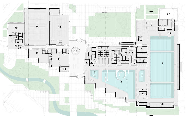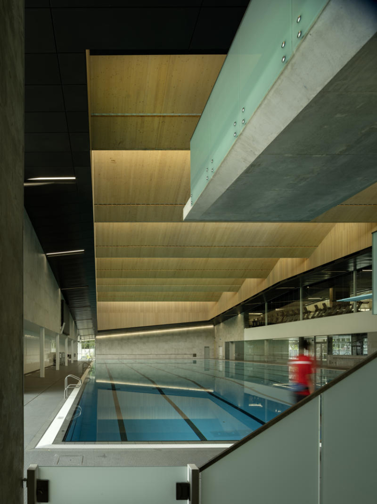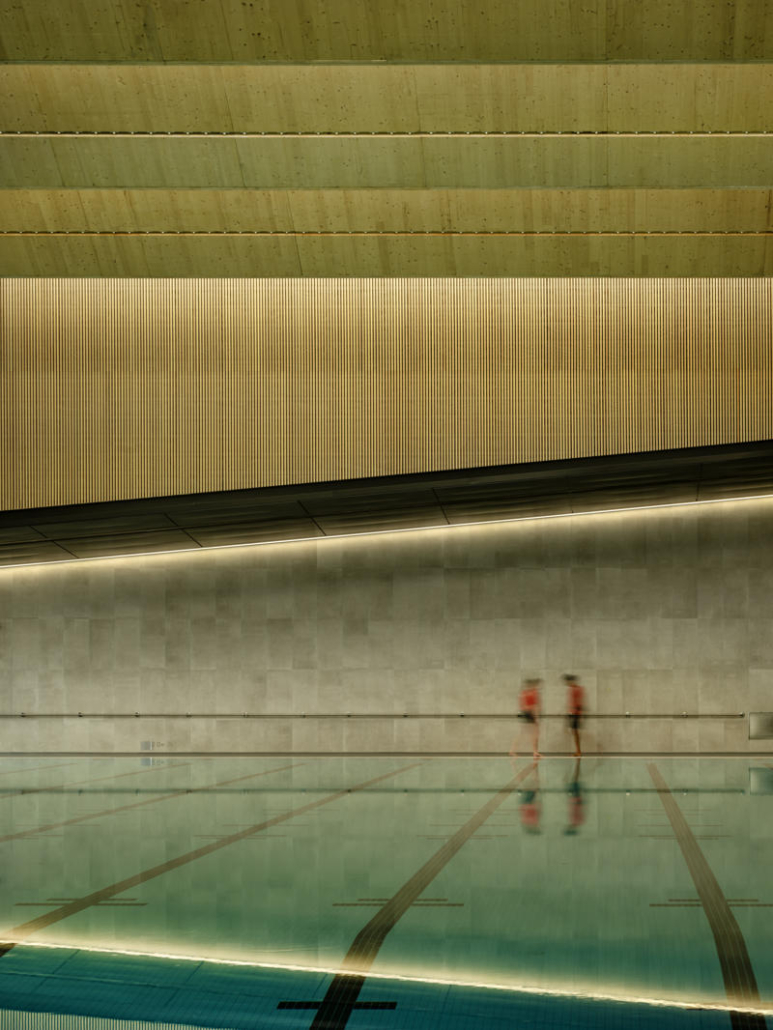 Yapının doğu kanadında elli metrelik yarış havuzu, dalış platformları ve hareketli zemin sistemi bulunuyor. Bu alan, kuzeyden alınan dolaylı gün ışığıyla aydınlatılan dişbudak formundaki çatı altında yer alıyor. Eğik çatı formu hem enerji verimliliğini hem de kullanıcı konforunu artırıyor. Komşu kanatta yer alan eğlence havuzu, yirmi beş metrelik yüzme kulvarları, tembel nehir ve çocuk oyun alanlarını bir arada barındırıyor. Geniş açılır cam duvarlar, bu alanı dış mekan güneş terasına bağlayarak iç-dış sürekliliği sağlıyor.