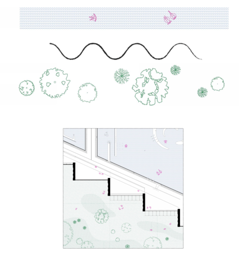 Zemin katta yer alan South Plaza, yoğun bitkilendirme ve yağmur bahçeleriyle doğaya açılan törensel bir giriş oluştururken; North Plaza, spor salonu duvarlarının açılabildiği daha kentsel, etkinlik odaklı bir meydan olarak düzenlenmiş.