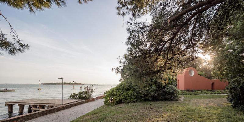 Bir adada olmak ve ardından bir bahçenin içinde bulunmak, insanın zihninin dinginlik ve tefekküre yöneldiği huzurlu bir hal yaratır. Venedik, San Giorgio’daki bahçe, Palladio’nun Manastırı’ndan Lagün’e doğru uzanan yollardan oluşan yelpaze biçiminde bir yapıya sahip. Sabah Şapeli bu uzun patikalardan birinin üzerinde yer alıyor ve bu yürüyüş güzergahının suyla buluştuğu noktanın hemen öncesine konumlanıyor.