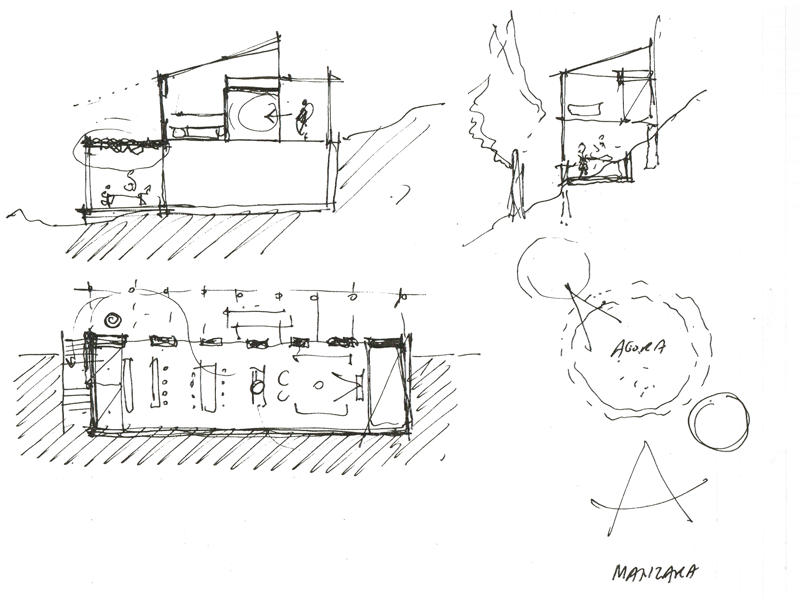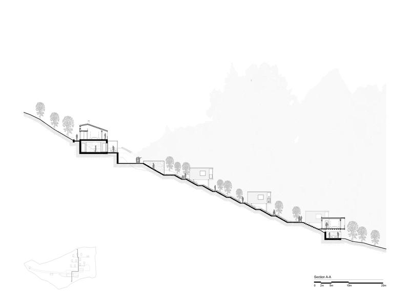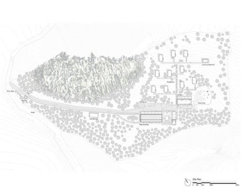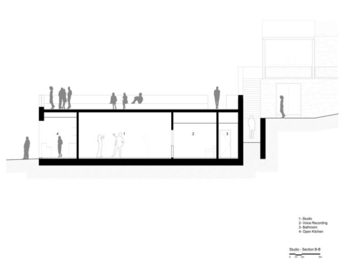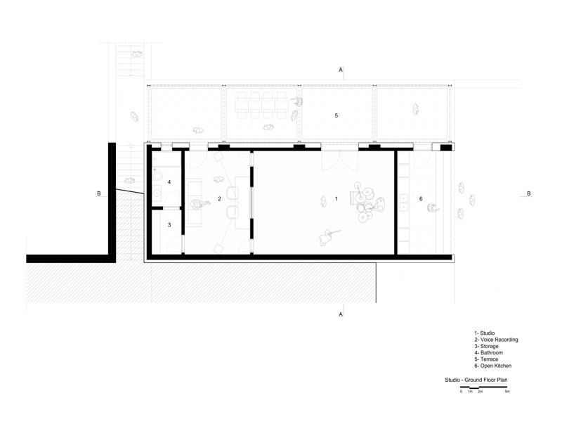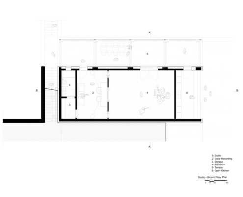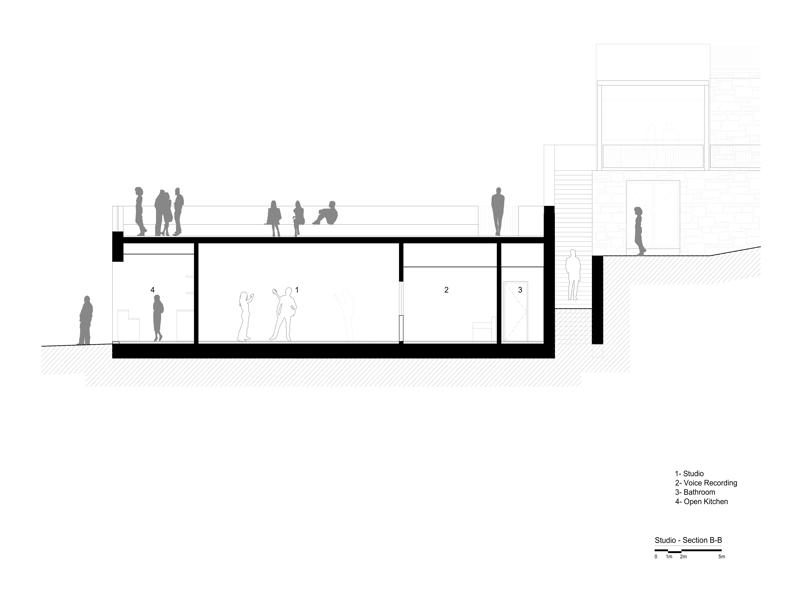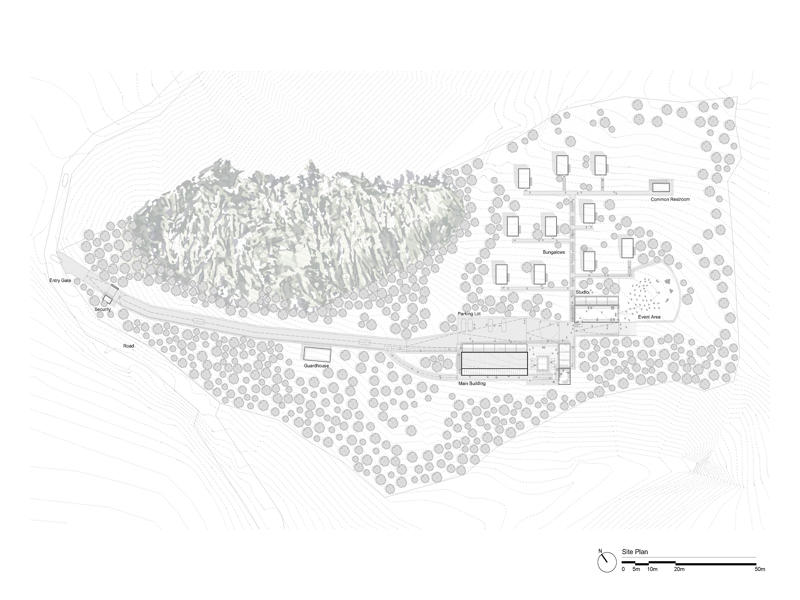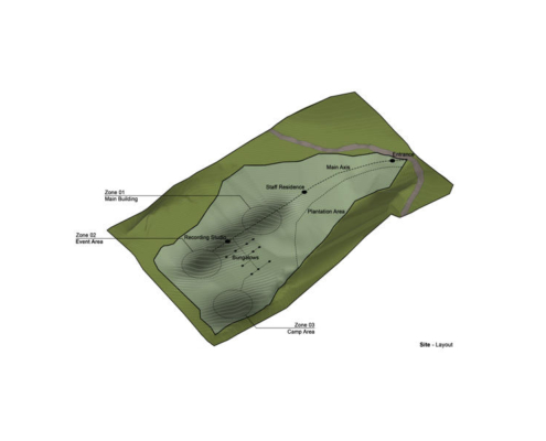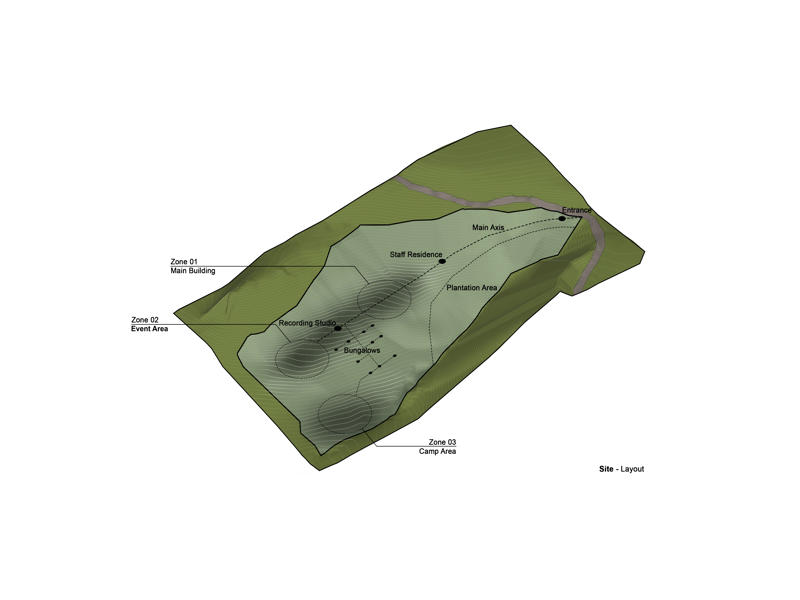 Arazi topoğrafyasının ve mevcut bitki örtüsünün belirleyici olduğu yerleşim kararlarında, az eğimli ve seyrek bitki örtüsüne sahip üç bölge tanımlanmış, bu bölgeleri birbirlerine ve ana girişe bağlayan bir ana aks belirlenmiş. Girişe yakın olan ilk bölge otel yapısına ayrılmış. Aksın sonlandığı ikinci bölgede deniz manzarasına yönelen etkinlik alanı yer alıyor. Aks üzerindeki kayıt stüdyosu ise bu iki alanı birbirine bağlıyor. Üçüncü ve en alt kottaki kamp alanı, merdivenlerle ana aksa bağlanmış.