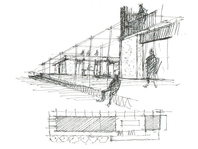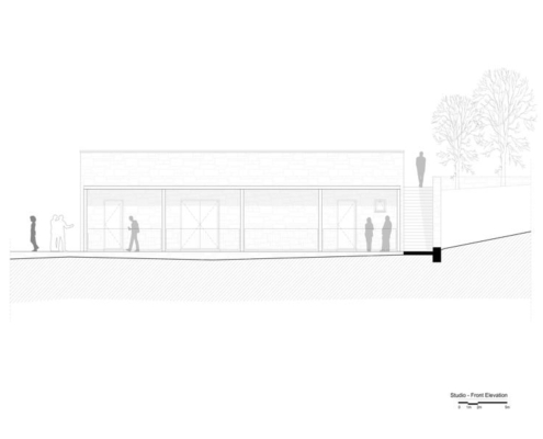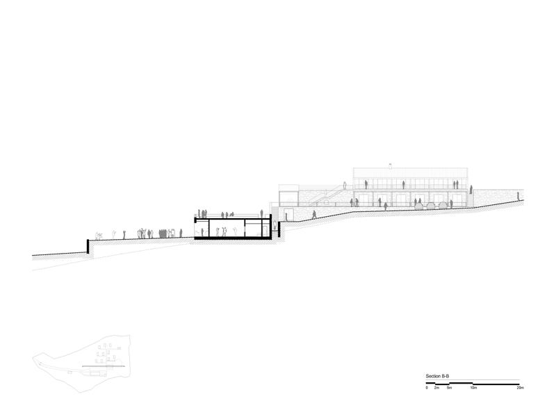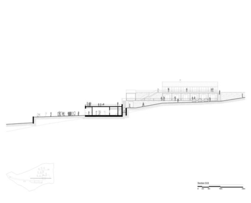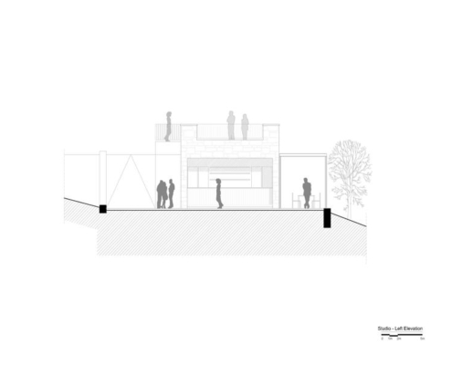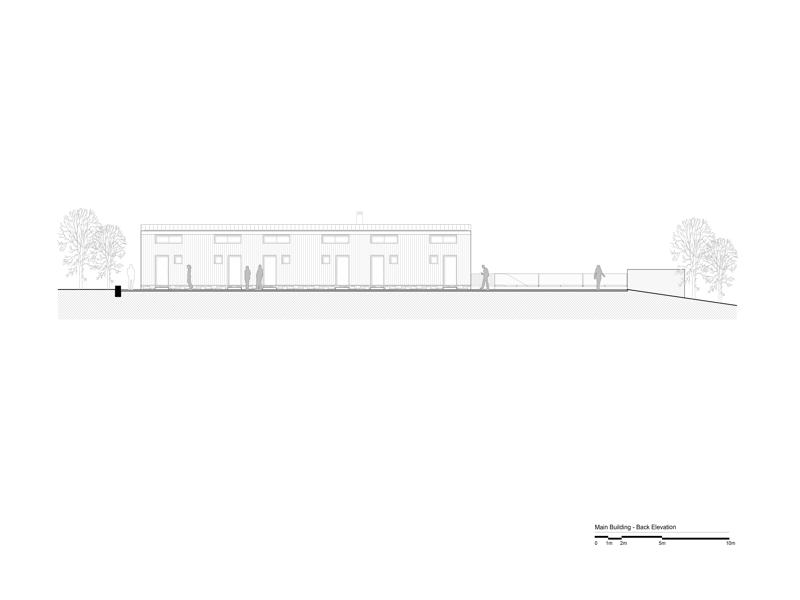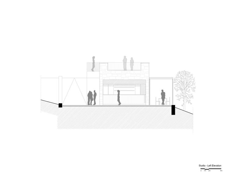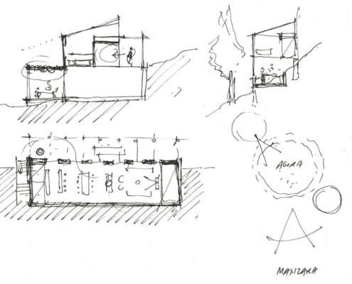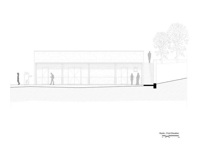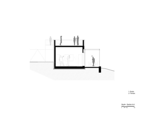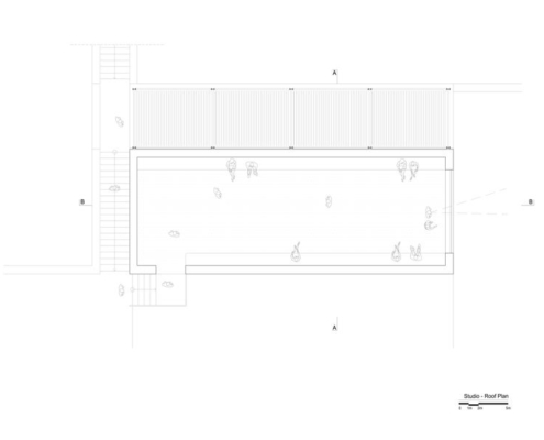 Arazi topoğrafyasının ve mevcut bitki örtüsünün belirleyici olduğu yerleşim kararlarında, az eğimli ve seyrek bitki örtüsüne sahip üç bölge tanımlanmış, bu bölgeleri birbirlerine ve ana girişe bağlayan bir ana aks belirlenmiş. Girişe yakın olan ilk bölge otel yapısına ayrılmış. Aksın sonlandığı ikinci bölgede deniz manzarasına yönelen etkinlik alanı yer alıyor. Aks üzerindeki kayıt stüdyosu ise bu iki alanı birbirine bağlıyor. Üçüncü ve en alt kottaki kamp alanı, merdivenlerle ana aksa bağlanmış.