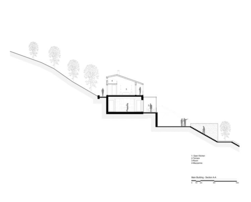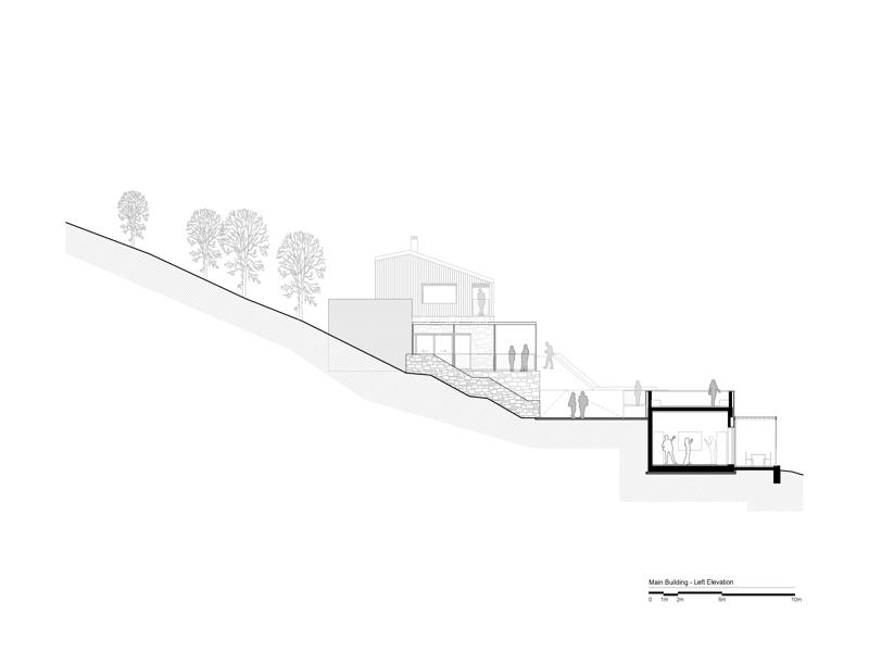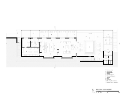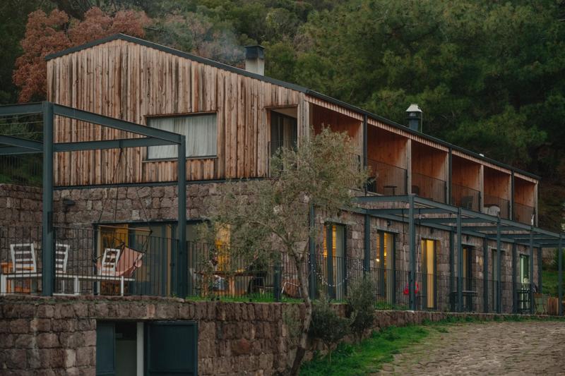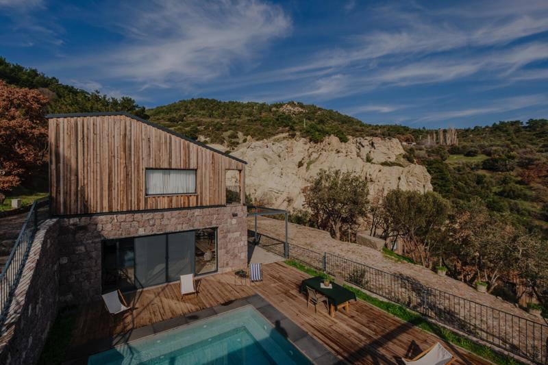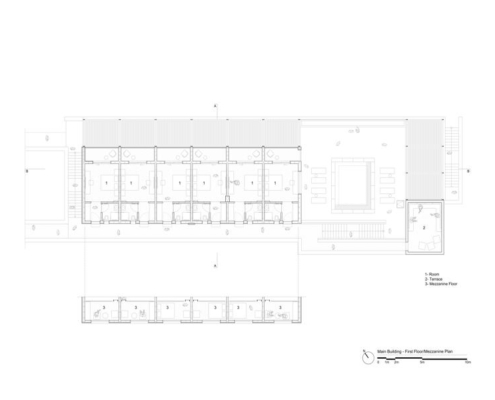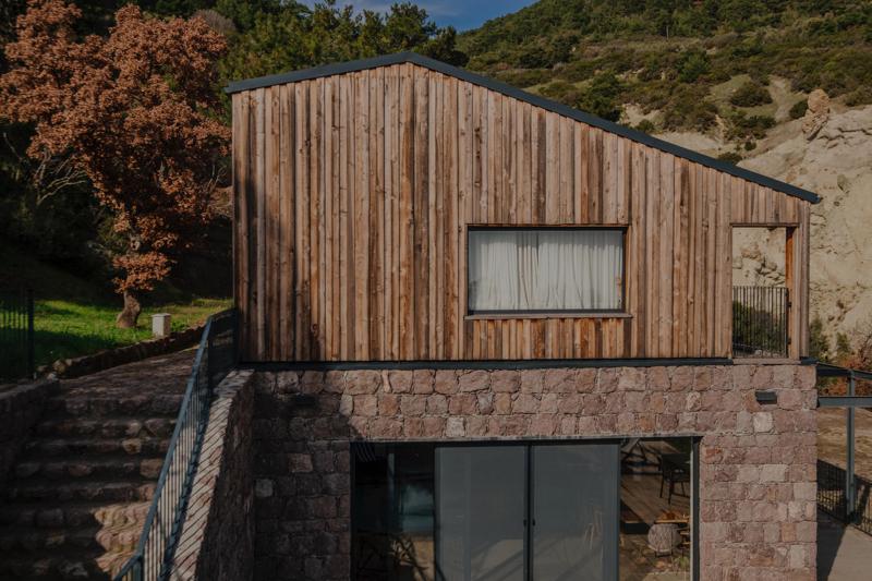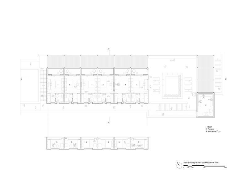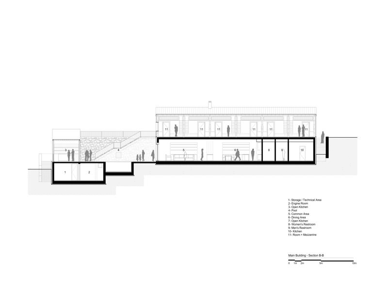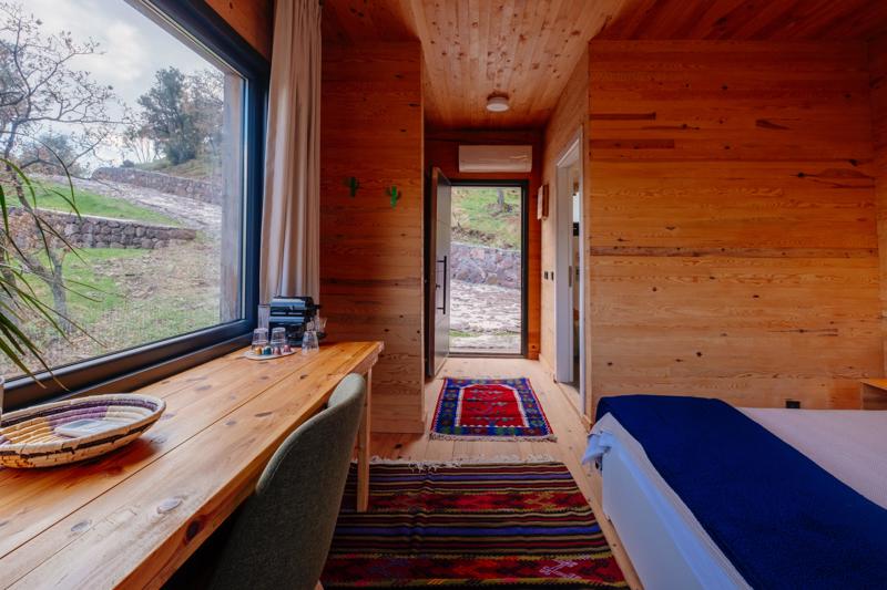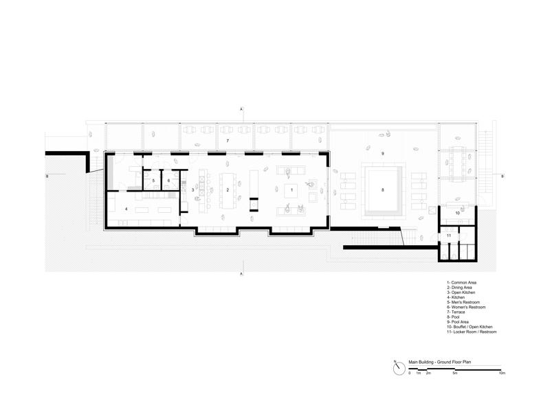 Otel yapısı, hem bireysel hem de kolektif kullanımları barındıracak şekilde tasarlanmış. Topoğrafyaya oturan taş/beton zemin kat ile ahşap strüktürlü birinci kattan oluşuyor. Zemin katta ortak yaşam alanları, açık mutfak ve servis birimleri yer alırken; üst katta dışarıdan erişilen, her biri bağımsız kullanım imkanı sunan, balkonlu ve asma katlı altı oda bulunuyor. Havuz otelin yanında, manzara tarafında konumlanıyor; hem bu alandaki hem de konut terasındaki gölgelikler çelik strüktür ve saz örtülerle çözülmüş.