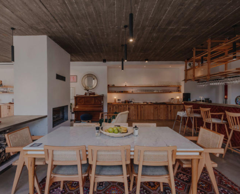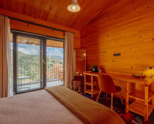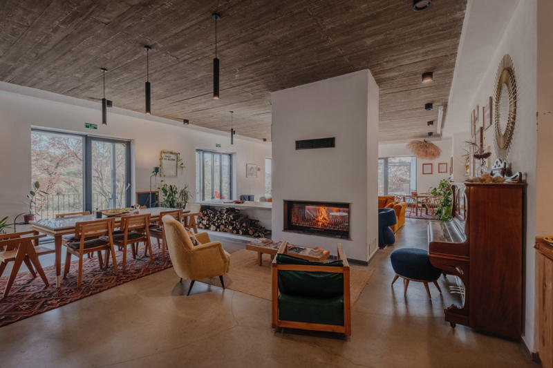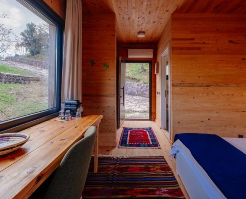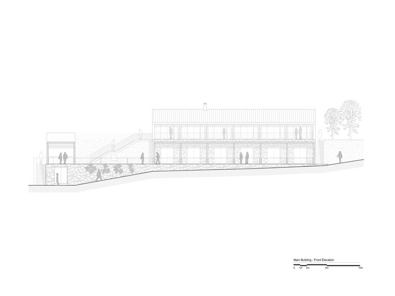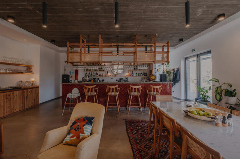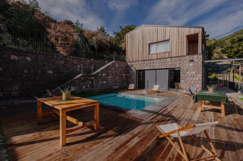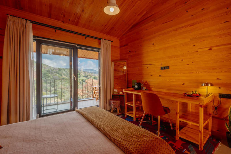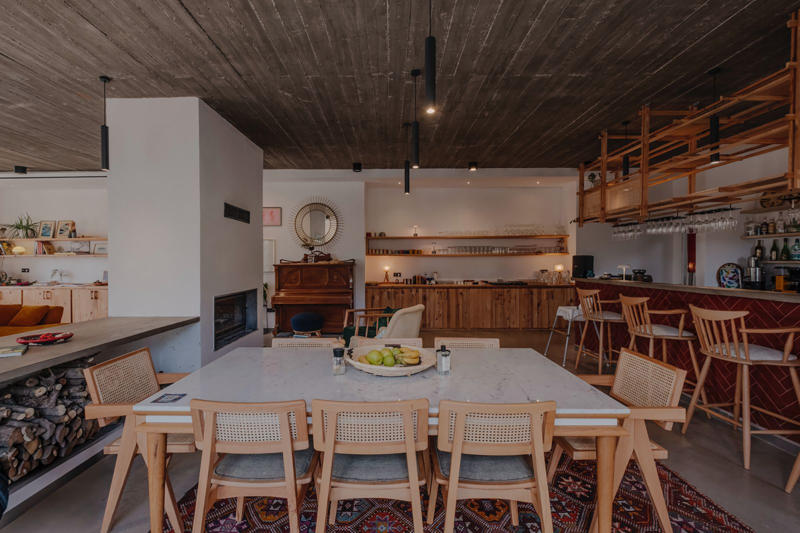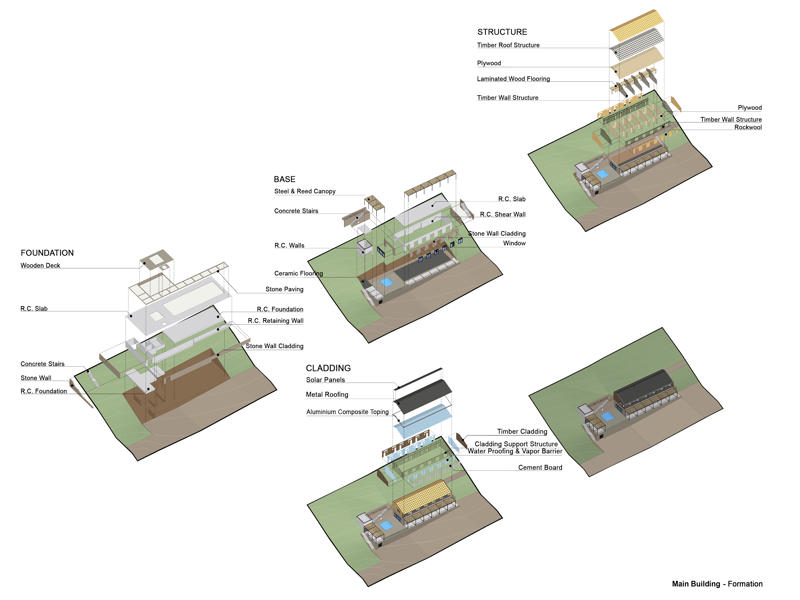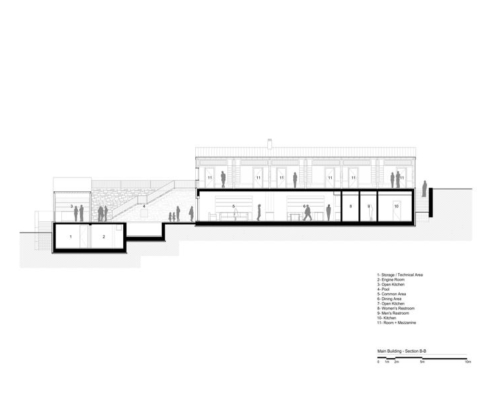 Otel yapısı, hem bireysel hem de kolektif kullanımları barındıracak şekilde tasarlanmış. Topoğrafyaya oturan taş/beton zemin kat ile ahşap strüktürlü birinci kattan oluşuyor. Zemin katta ortak yaşam alanları, açık mutfak ve servis birimleri yer alırken; üst katta dışarıdan erişilen, her biri bağımsız kullanım imkanı sunan, balkonlu ve asma katlı altı oda bulunuyor. Havuz otelin yanında, manzara tarafında konumlanıyor; hem bu alandaki hem de konut terasındaki gölgelikler çelik strüktür ve saz örtülerle çözülmüş.