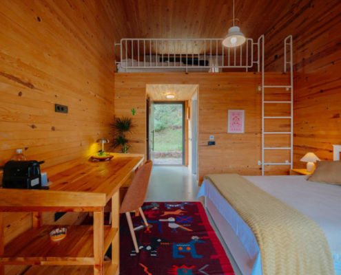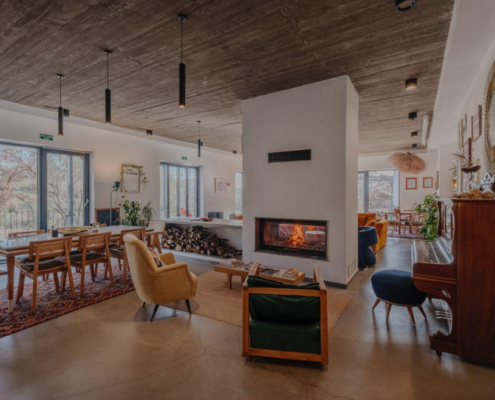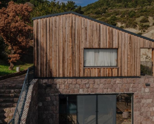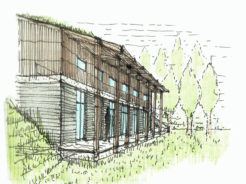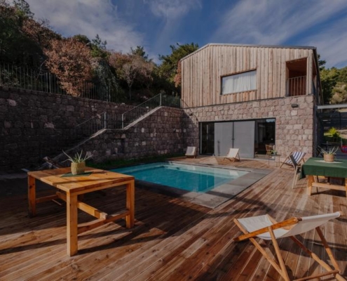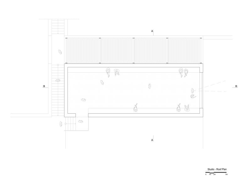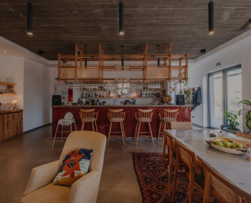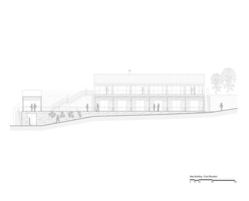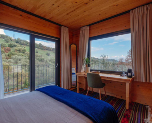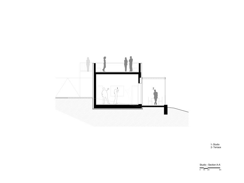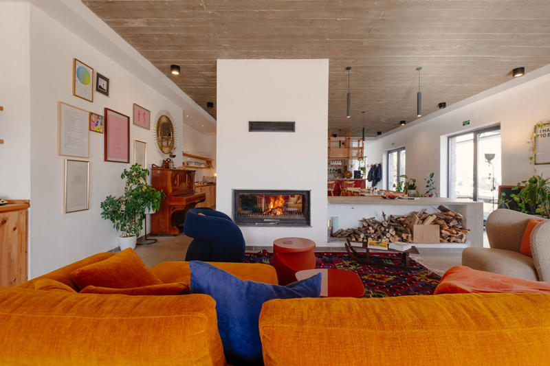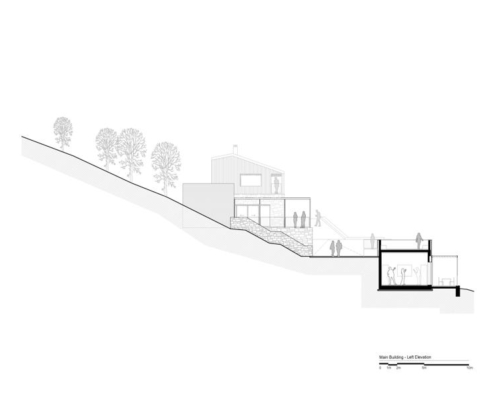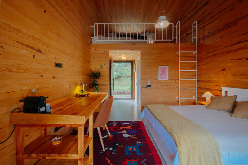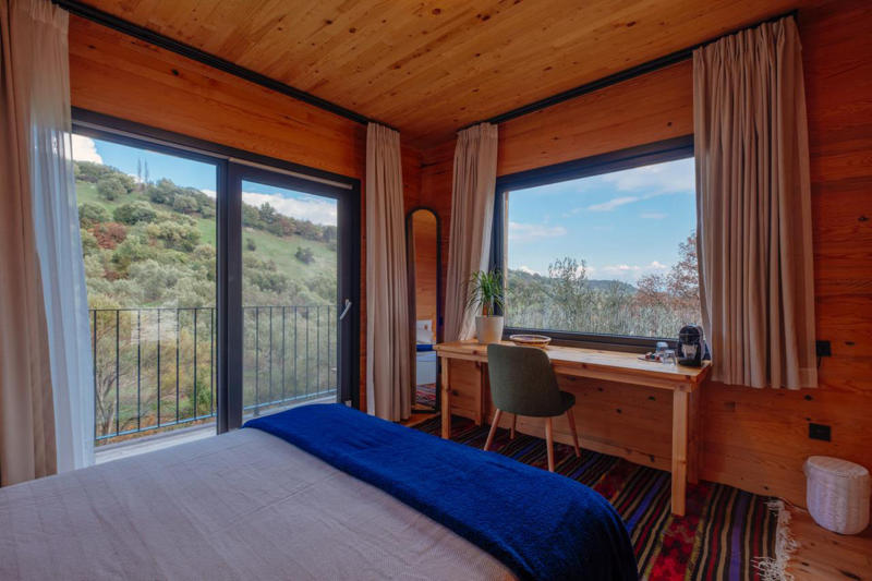 Otel yapısı, hem bireysel hem de kolektif kullanımları barındıracak şekilde tasarlanmış. Topoğrafyaya oturan taş/beton zemin kat ile ahşap strüktürlü birinci kattan oluşuyor. Zemin katta ortak yaşam alanları, açık mutfak ve servis birimleri yer alırken; üst katta dışarıdan erişilen, her biri bağımsız kullanım imkanı sunan, balkonlu ve asma katlı altı oda bulunuyor. Havuz otelin yanında, manzara tarafında konumlanıyor; hem bu alandaki hem de konut terasındaki gölgelikler çelik strüktür ve saz örtülerle çözülmüş.