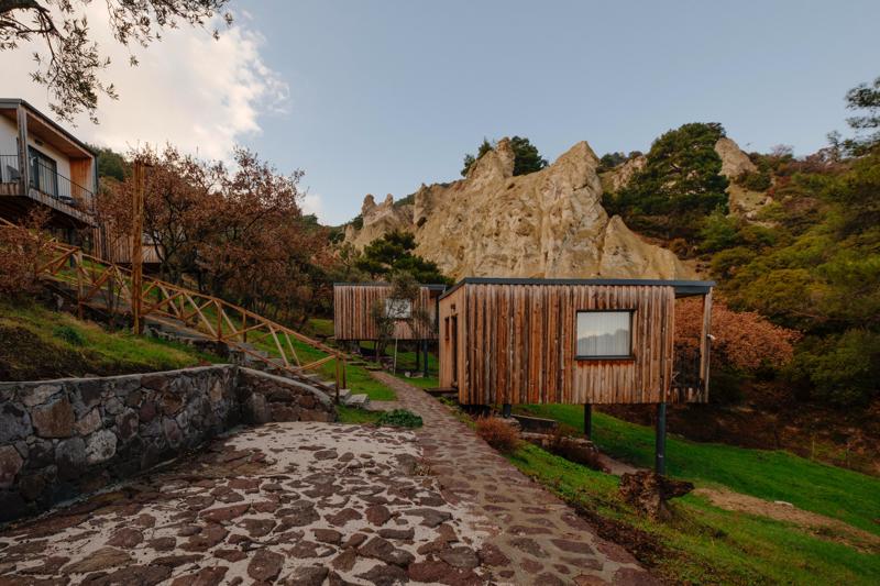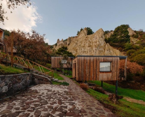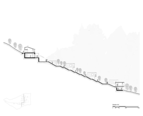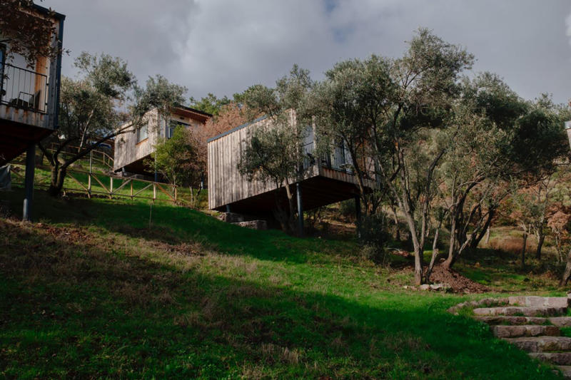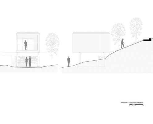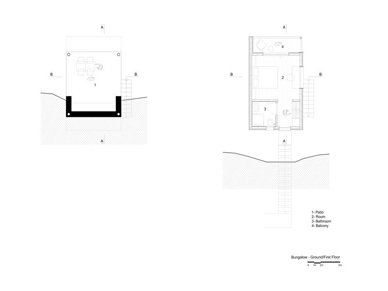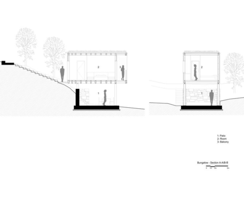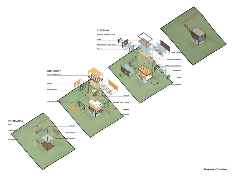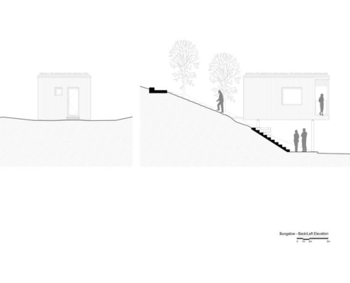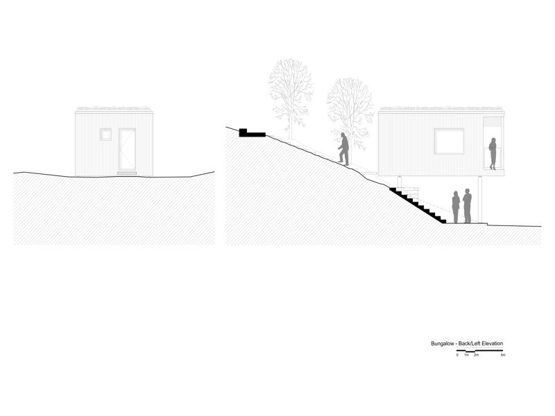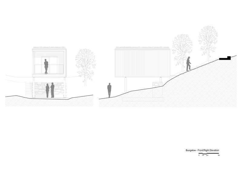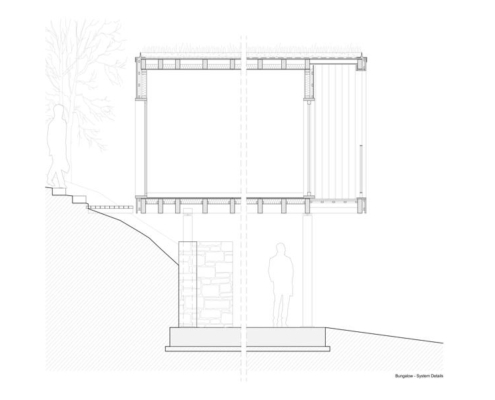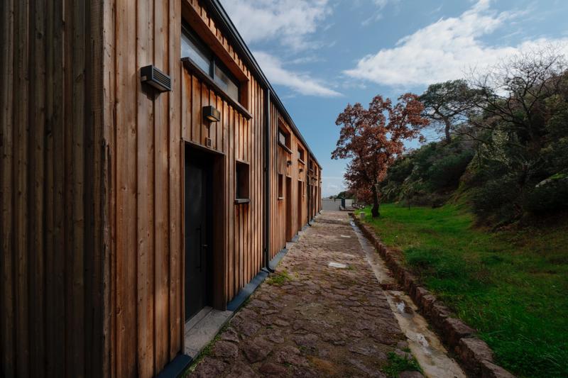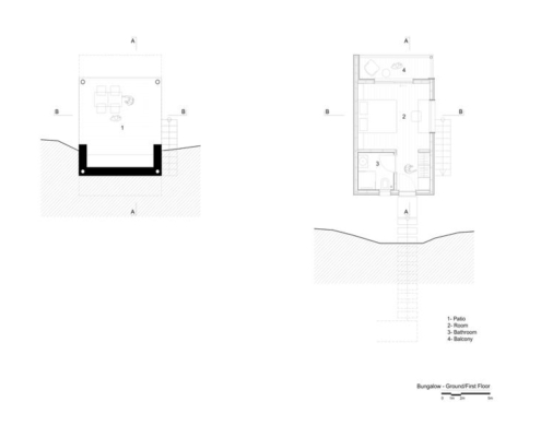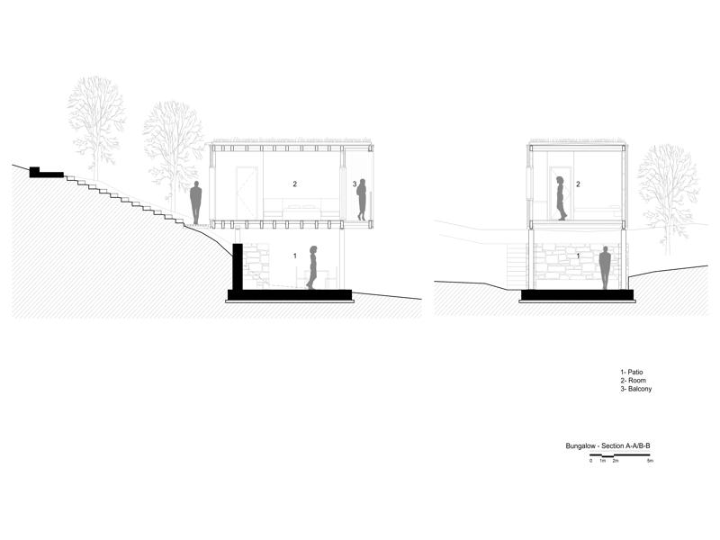 Bungalovlar, kamp alanını ana aksa bağlayan merdiven hattı boyunca, ağaçlara zarar vermeden ve deniz manzarası maksimize edilerek konumlandırılmış. Yamaca dik yerleştirilen bu birimler, betonarme temellere oturan çelik ayaklar üzerinde yükseltilmiş ahşap yapılar olarak tasarlanmış.