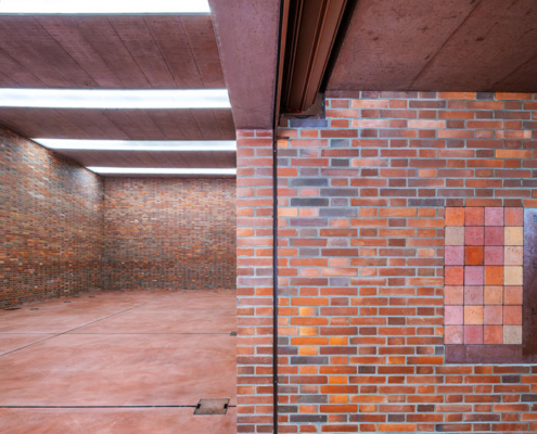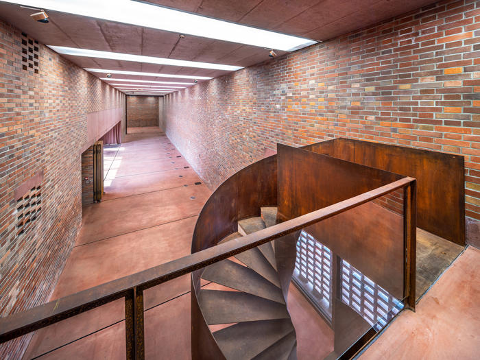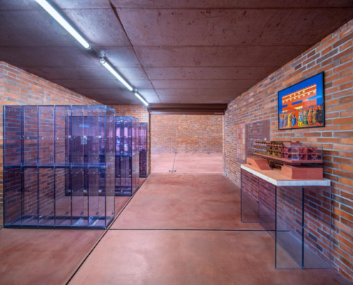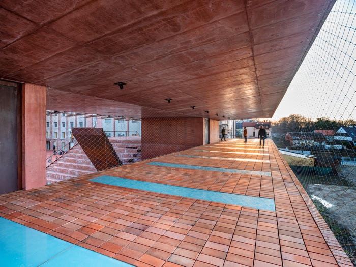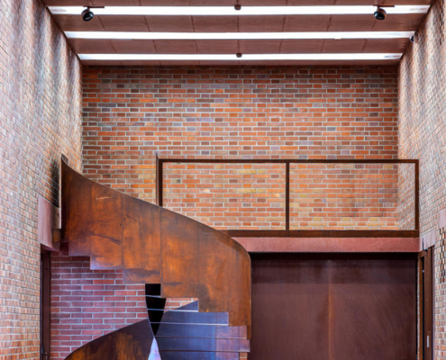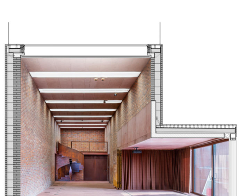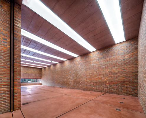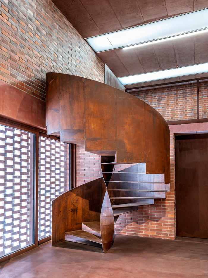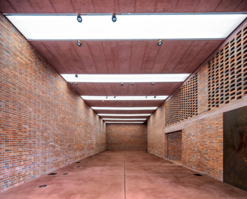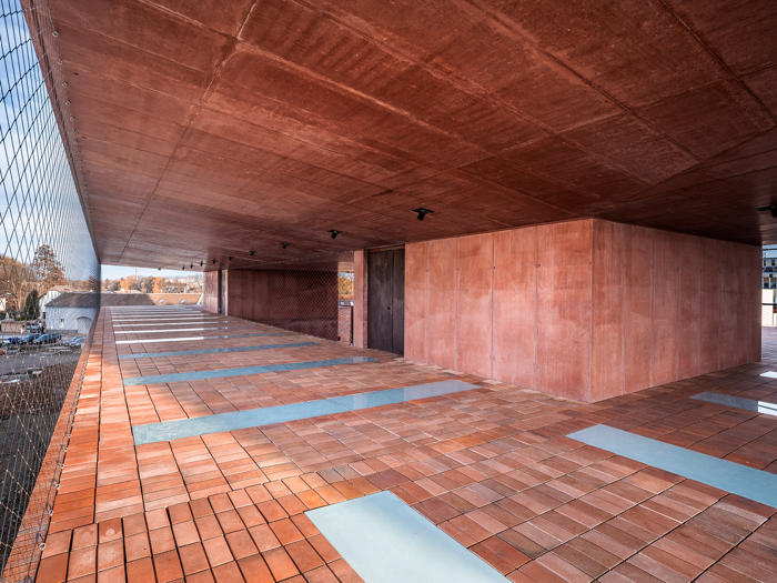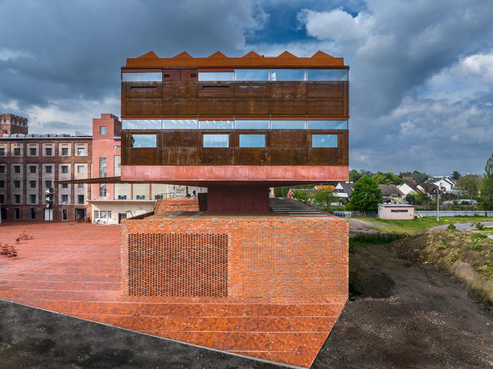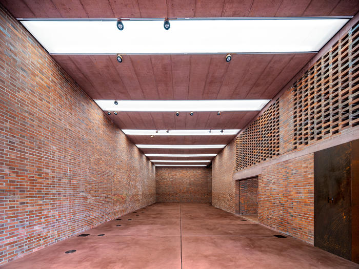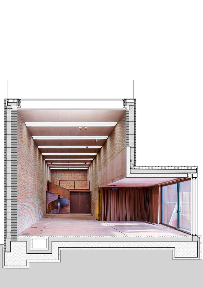 Tamamen tuğladan oluşan galeri, bir tür kaideyi temsil ediyor; çatısı ise kamuya açık bir alan sunuyor. Bu alan, yaz aylarında birçok açık hava etkinliğinin düzenlenebileceği 250 kişilik bir amfi tiyatro ile başka bir boyut kazanıyor. Açık hava sahnesi, atölyenin desteklenen kısmı tarafından örtülüyor ve geri çekilebilir bir panjurla tamamen kapatılabiliyor. Ziyaretçiler, kamusal alandan geçerek doğrudan resepsiyon, vestiyer ve tuvaletlerin bulunduğu fuayeye girebiliyor. Ayrıca, söz konusu alanın tüm çevresini dolaşan ve iki kat üzerinde tasarlanan galeriye doğrudan devam edilebiliyor. Tüm sergi salonlarında öncelikli olarak üstten aydınlatma tercih edilmiş, yalnızca ana alanda bilinçli olarak değirmen kompleksinin ana girişine doğru bakan bir açıklık tasarlanmış.
