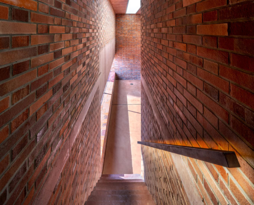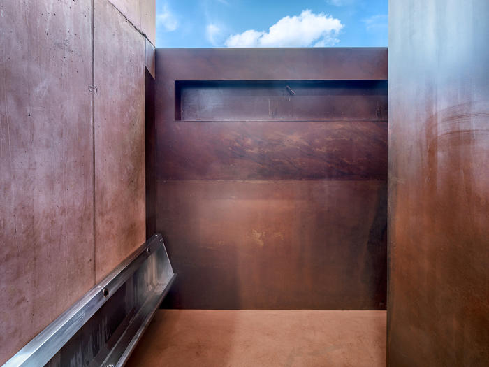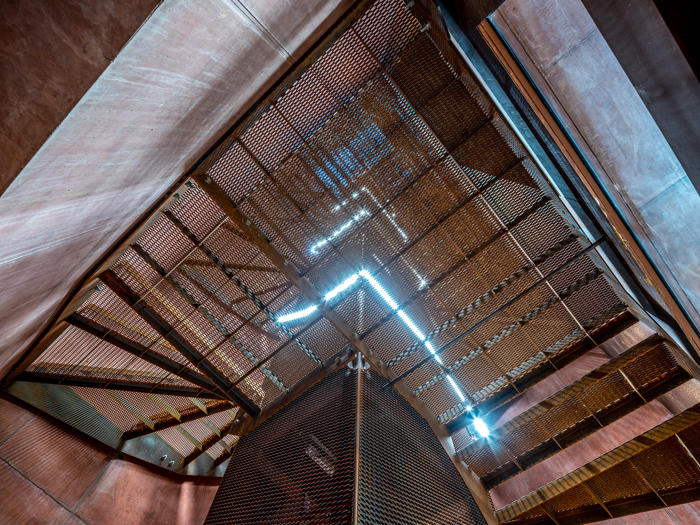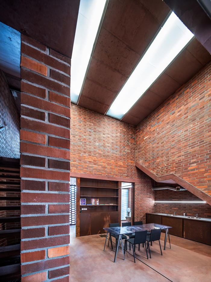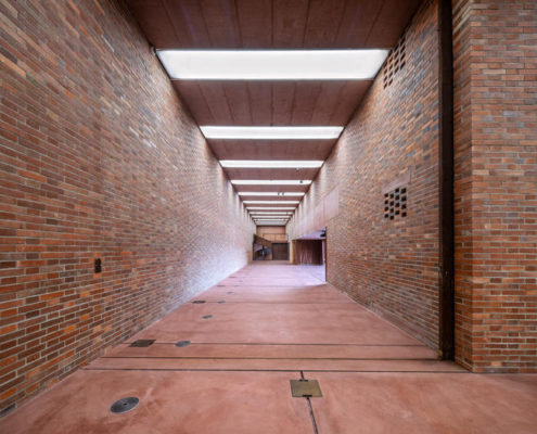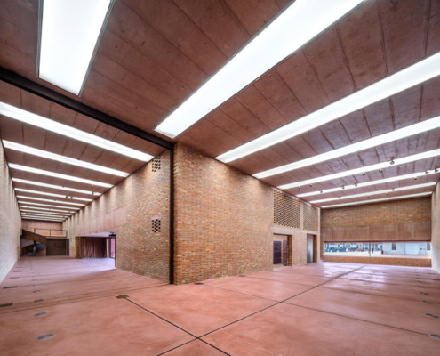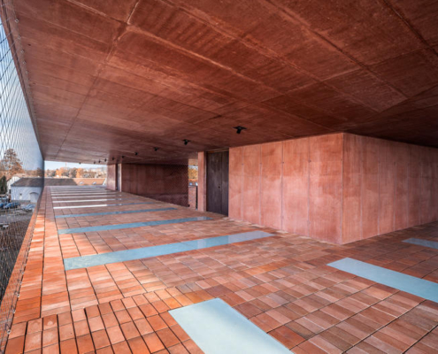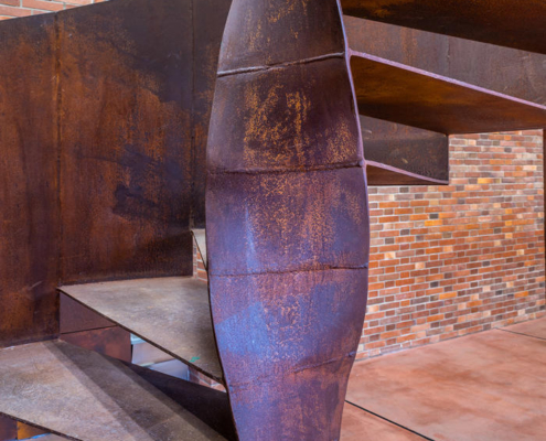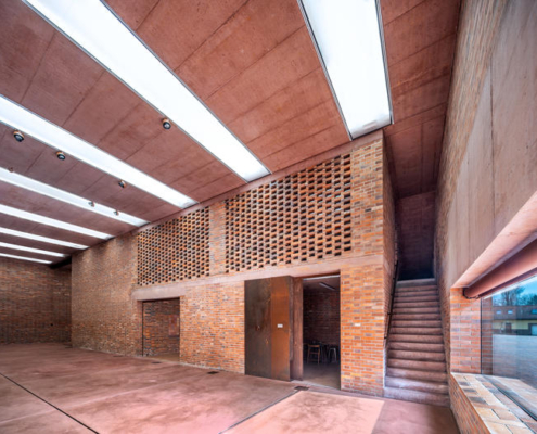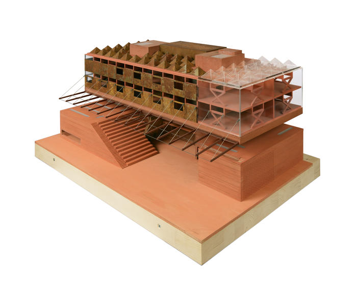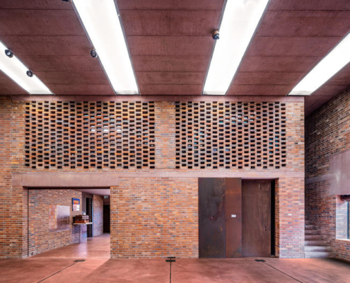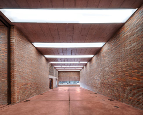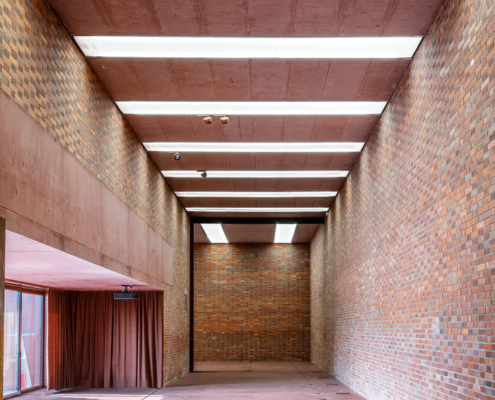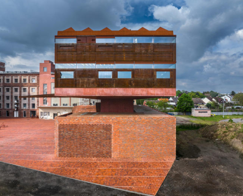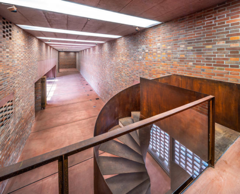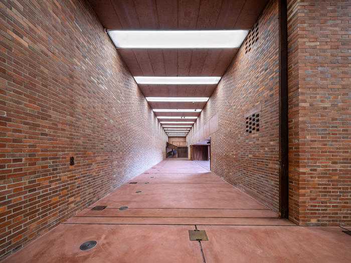 Tamamen tuğladan oluşan galeri, bir tür kaideyi temsil ediyor; çatısı ise kamuya açık bir alan sunuyor. Bu alan, yaz aylarında birçok açık hava etkinliğinin düzenlenebileceği 250 kişilik bir amfi tiyatro ile başka bir boyut kazanıyor. Açık hava sahnesi, atölyenin desteklenen kısmı tarafından örtülüyor ve geri çekilebilir bir panjurla tamamen kapatılabiliyor. Ziyaretçiler, kamusal alandan geçerek doğrudan resepsiyon, vestiyer ve tuvaletlerin bulunduğu fuayeye girebiliyor. Ayrıca, söz konusu alanın tüm çevresini dolaşan ve iki kat üzerinde tasarlanan galeriye doğrudan devam edilebiliyor. Tüm sergi salonlarında öncelikli olarak üstten aydınlatma tercih edilmiş, yalnızca ana alanda bilinçli olarak değirmen kompleksinin ana girişine doğru bakan bir açıklık tasarlanmış.
