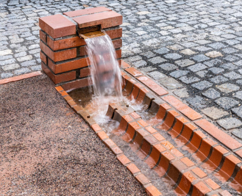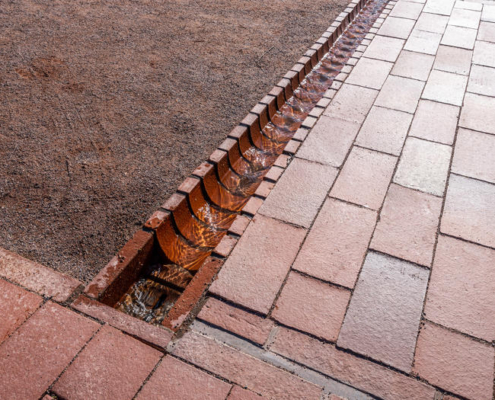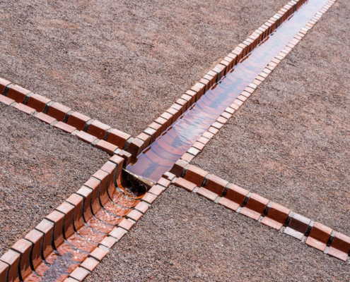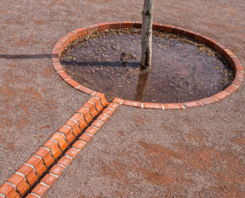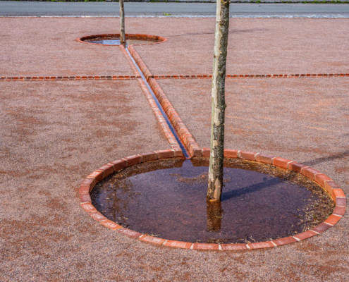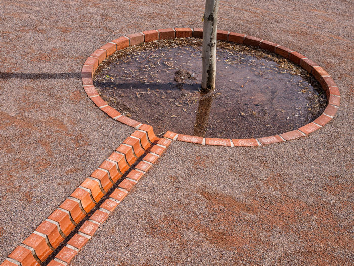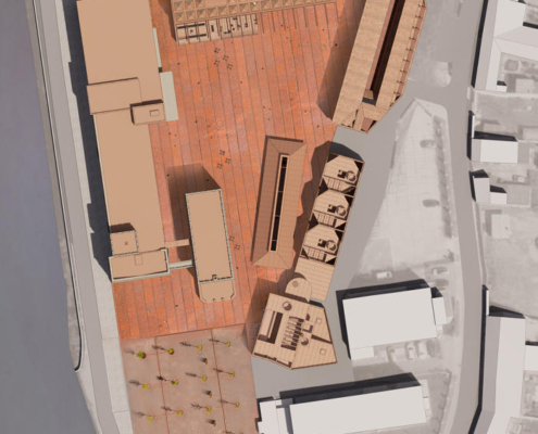 Mevcut binalardan bazılarının kaldırılmasıyla, girişteki kemer ile karakterize olan ön kapı vurgulanmış ve aynı zamanda şehrin tarihi kısmının yanından tüm alanın engelsiz bir şekilde görülmesi sağlanmış. Kasıtlı olarak farklı bir karaktere ve işleve sahip iki yeni kamusal alanın yaratılması, değirmenlerin yeniden canlandırılması açısından temel bir tasarım kararı oluşturuyor. Çınar korusu etrafında tasarlanmış bir meydan, ana girişi tanımlıyor; bu koruluktaki her ağacın sulanması için tuğladan yapılmış bir su kanalı yerleştirilmiş. Öncelikli olarak sessiz bir temsili giriş noktası olarak tasarlanan alanın, pazar gibi programlar için de kullanılması öngörülmüş.