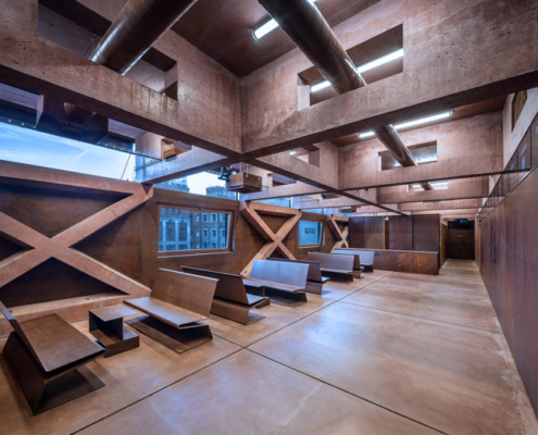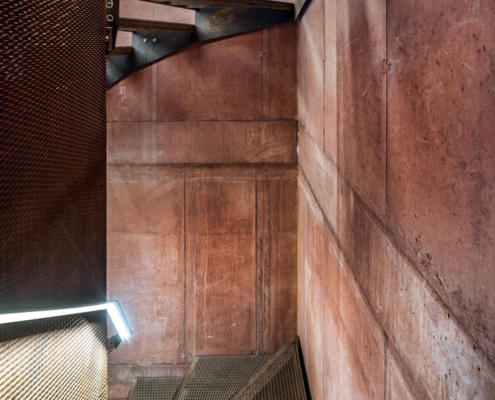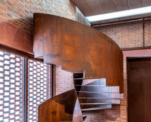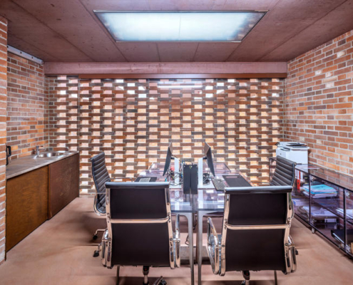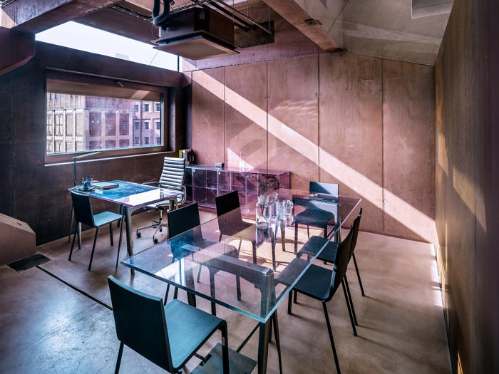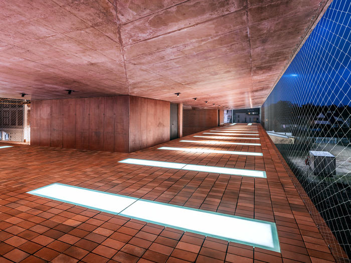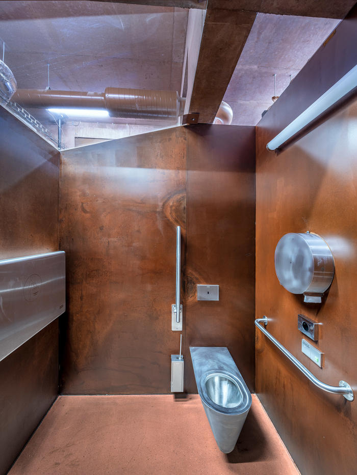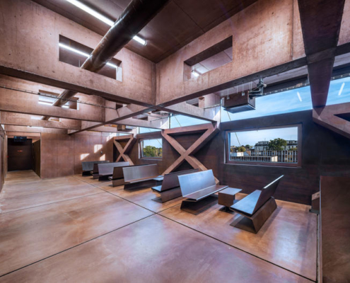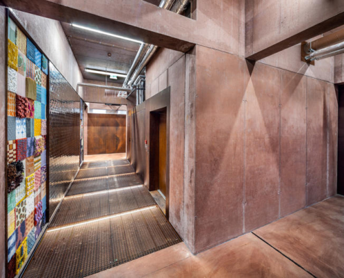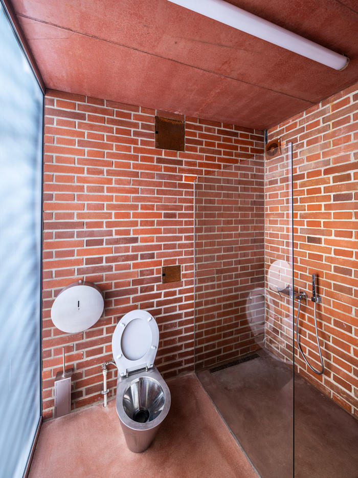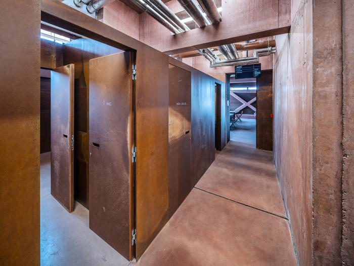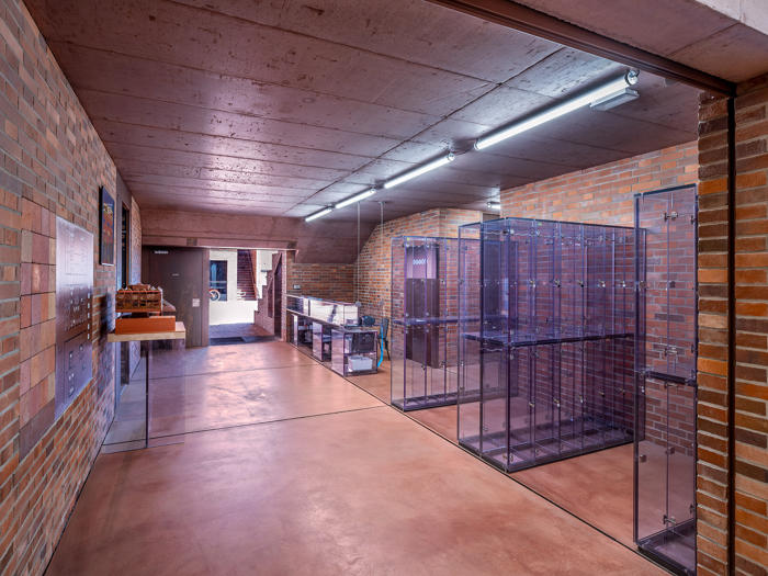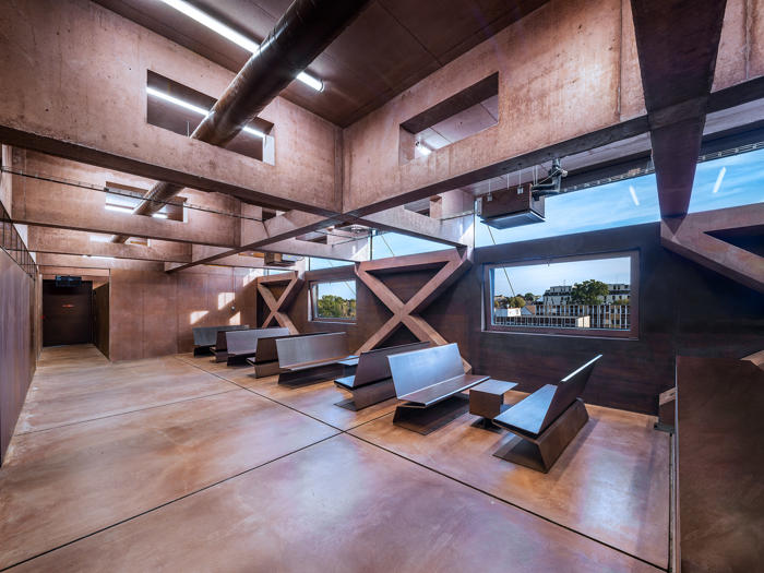 “Çıplak” duvarın kaplanması gerekmiyor ancak dikkatli bir işçilik gerektiriyor. Aynı durum tavan, duvar ve zemin gibi diğer yapısal unsurlar için de geçerlilik taşıyor. Binanın tamamı ziyaretçilerine gerçekte neyin nasıl yapıldığını anlatıyor. Betonun pigmentlerinin karıştırılabilmesi için küp şeklinde neredeyse 30 farklı numune dökülmüş. Atölyelerde ise yapı ve zemin için renkli beton kullanılmış. Atölyelerin yapımında, cepheye yakın kenarlarda çapraz kirişleri destekleyen 3×3 metrelik bir ızgara oluşturan yük taşıyıcı beton kaburgalar kullanılıyor. Çapraz kirişler, aynı zamanda tüm binanın çevresini havalandıran bir tür hibrit delikli duvar oluşturuyorlar. Dış tarafa, hava koşullarına dayanıklı çelik levha ile kaplanmış yalıtımlı hafif paneller yerleştirilmiş.