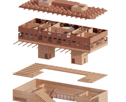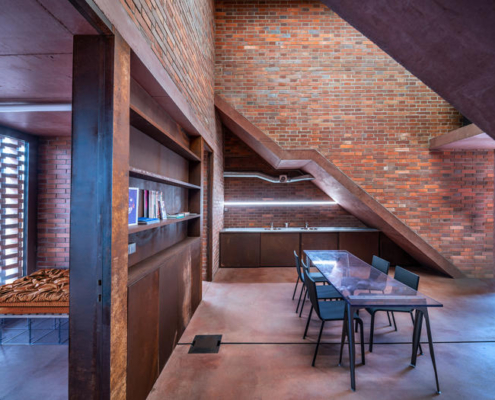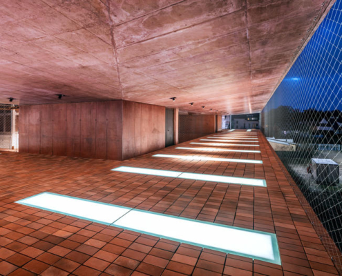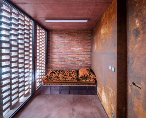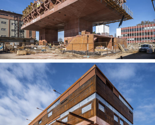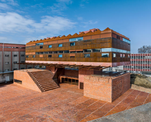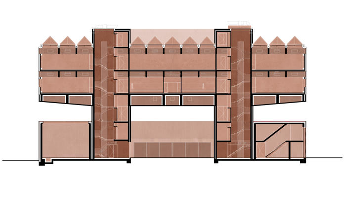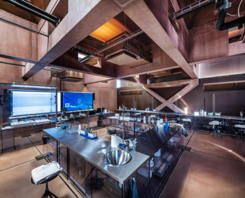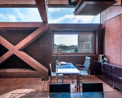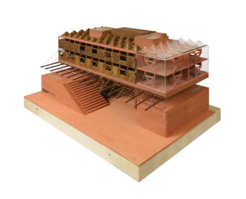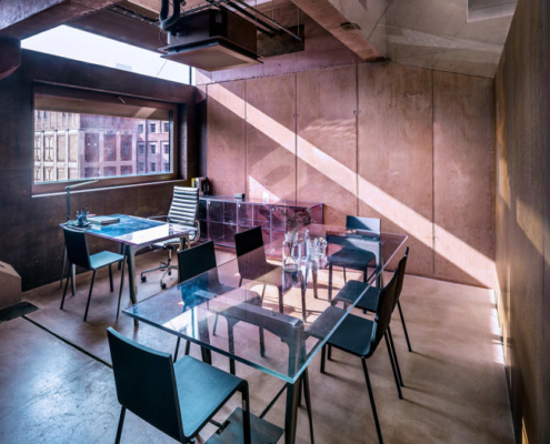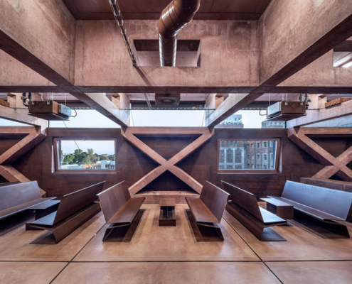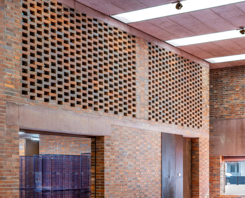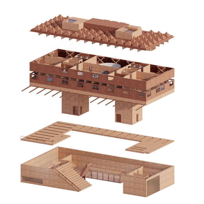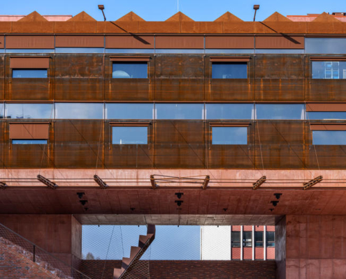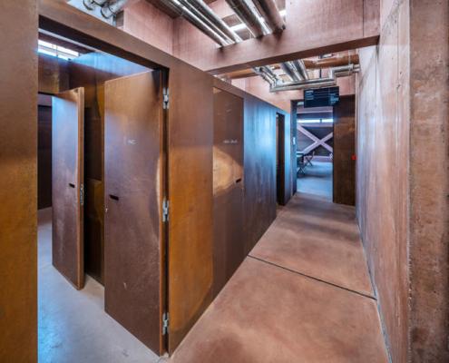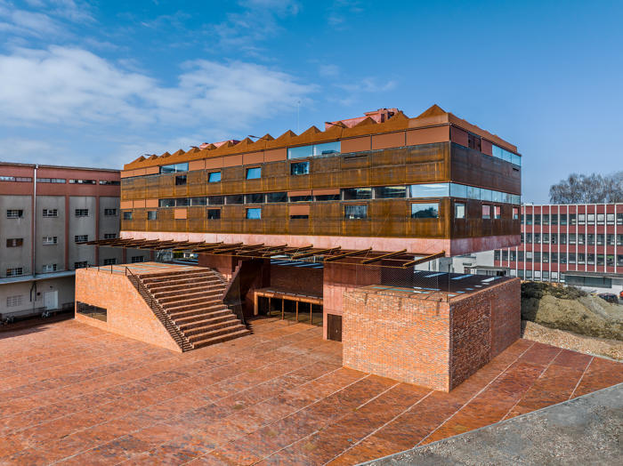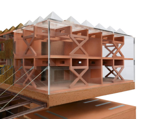 “Çıplak” duvarın kaplanması gerekmiyor ancak dikkatli bir işçilik gerektiriyor. Aynı durum tavan, duvar ve zemin gibi diğer yapısal unsurlar için de geçerlilik taşıyor. Binanın tamamı ziyaretçilerine gerçekte neyin nasıl yapıldığını anlatıyor. Betonun pigmentlerinin karıştırılabilmesi için küp şeklinde neredeyse 30 farklı numune dökülmüş. Atölyelerde ise yapı ve zemin için renkli beton kullanılmış. Atölyelerin yapımında, cepheye yakın kenarlarda çapraz kirişleri destekleyen 3×3 metrelik bir ızgara oluşturan yük taşıyıcı beton kaburgalar kullanılıyor. Çapraz kirişler, aynı zamanda tüm binanın çevresini havalandıran bir tür hibrit delikli duvar oluşturuyorlar. Dış tarafa, hava koşullarına dayanıklı çelik levha ile kaplanmış yalıtımlı hafif paneller yerleştirilmiş.