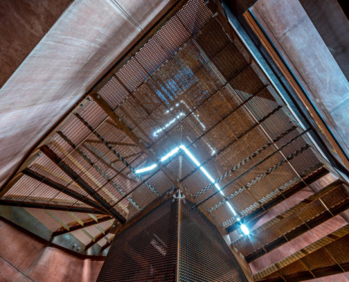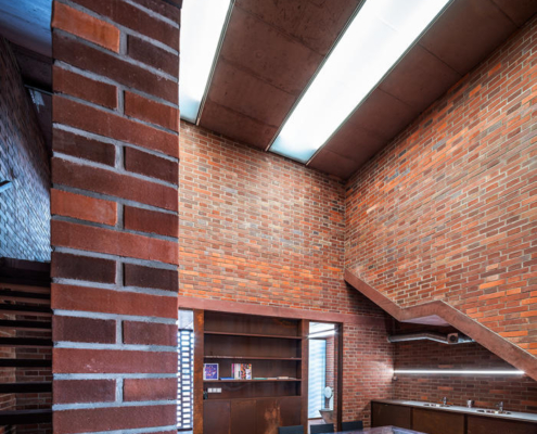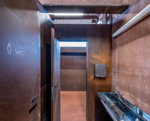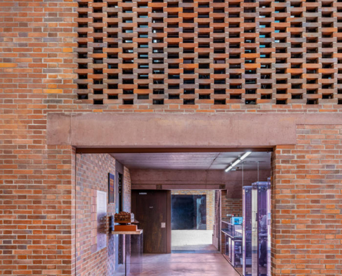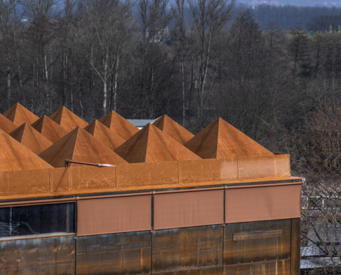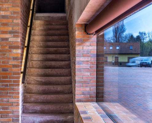 Mimar Josef Gočár, projeyi doğru temsil eden bir mimari ifadenin geliştirilmesinde strüktür ve malzeme tasarımının önemini vurguluyor. Yığma taşıyıcı duvarlar tuğladan, kabuk ise hava koşullarına dayanıklı çelik sac kaplamadan oluşuyor. İç ve dış mekanda tutarlı bir malzeme seçimi yapılmış. Alt kısmı tuğladan oluşan galeri, değirmenlerin endüstriyel yapısını takip etmeye olanak tanıyor. Sıvanmamış tuğla işçiliği sadece anıt listesindeki bir binaya referans olmuyor, aynı zamanda mekanın şekillendirilmesinde önemli bir rol oynayan duvarın kendisinin olağan bir etkisini sunuyor.