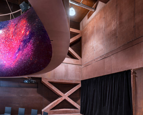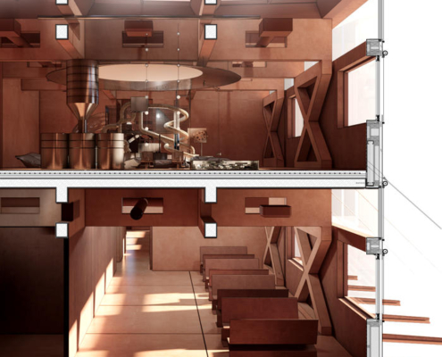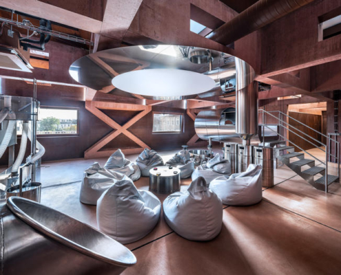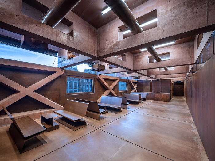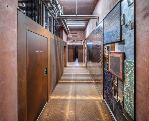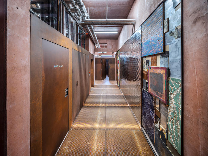 Daha iyi bir oryantasyon için UMPRUM (Prag Sanat, Mimarlık ve Tasarım Akademisi) öğretmenleri ve öğrencileriyle iş birliği yaparak, bireysel atölye çalışmalarına yanıt veren yaratıcı bir şekilde kurgulanan nişler tasarlanmış. Ahşap, tekstil, metal ve grafik matrislerden kolajlar oluşturulmuş. Çatının bir bölümünde ise düşey merdivenlerden biriyle erişilebilen bir makine ve kazan dairesi bulunuyor.