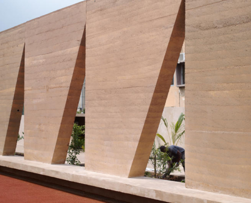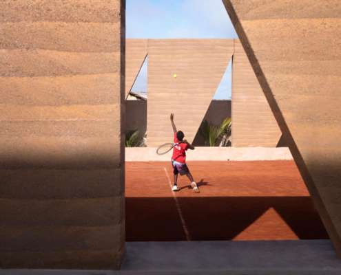 Uluslararası standartlara göre inşa edilen kil tenis kortu, profesyonel düzeyde çiftler maçlarına olanak tanıyacak biçimde tasarlanmış. Aynı zamanda topluluktaki çocuklara ücretsiz dersler verilerek spora erişim destekleniyor. Gölgeli ve yerleşik yüzer oturma birimi, oyuncuların ve izleyicilerin antrenmanları izlemelerine, dinlenmelerine ve değerlendirme yapmalarına olanak tanıyor. Soyunma odaları, gölgeli oturma alanları, açık hava hazırlık tezgahları ve barbekü alanı gibi yardımcı mekanlar, alana sakin bir biçimde entegre edilmiş. Duş alanları doğal ışık alıyor, sade detaylarla tasarlanıyor ve manzarayı günlük rutine dahil eden bitkilendirilmiş bir niş içeriyor. Avlu, 4 metre yüksekliğinde ön döküm sıkıştırılmış toprak panellerden oluşan ritmik bir çitle çevreleniyor ve hem koruyucu hem de geçirgen bir sınır oluşturuyor. Yerel olarak üretilen bu çit, izolasyon yaratmadan mahremiyet sağlıyor, görsel süreklilik ve geçirgenlik sunuyor. İnce ritmi ve heykelsi formu, çapraz rüzgarları azaltıyor ve alan boyunca hareket eden gölge desenleri üretiyor. Bu kompozisyon, yapıya güçlü bir mekansal varlık kazandırırken heykelsi zarafeti koruyor.