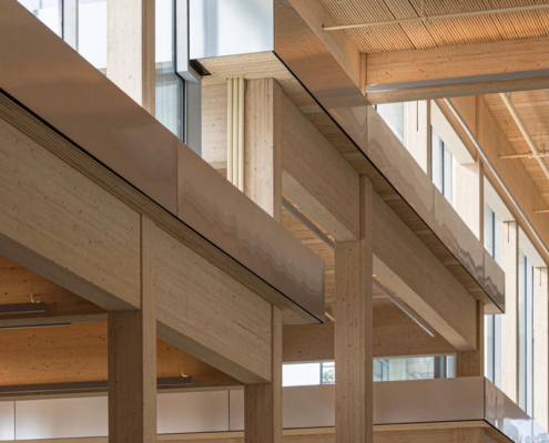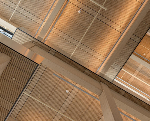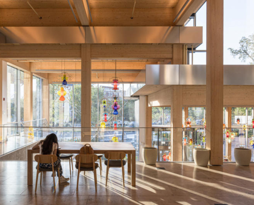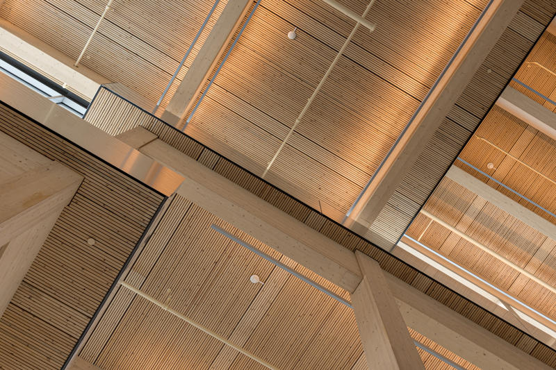 Merkezin kalbinde yer alan geniş atrium, BIG’in tanımladığı “yaşayan oda” işlevini üstleniyor. Bu alan, dört kat boyunca uzanan merkezi merdivenle bağlanıyor ve çevresinde dinlenme, çalışma, oyun, sergi ve müzik gibi farklı aktiviteler için tasarlanmış çok işlevli alanlar sıralanıyor. Ahşap kirişler, kütleler arası açıklıklarda sıcak bir akustik atmosfer yaratıyor; ışığın tüm yönlerden içeri süzülmesi, mekâna geçirgen bir karakter kazandırıyor.