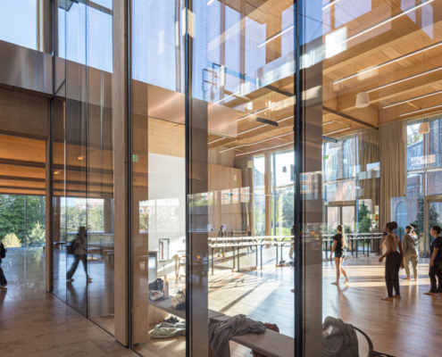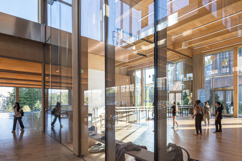 Rockwell Group’un iç mekan düzeni, öğrencilerin günlük ritimlerine uyum sağlayacak esnek alanlar oluşturmayı hedefliyor. Masif ahşap yapının sıcak tonları, kireçtaşı yüzeyler ve beyaz meşe marangozluk detaylarıyla bütünleşerek bütüncül bir malzeme dili oluşturuyor. Katlar arasında farklı tipolojilerde dinlenme alanları, çok amaçlı odalar, yaratıcı atölyeler, dans ve prova stüdyoları ile dijital medya merkezi yer alıyor.
