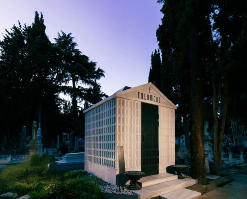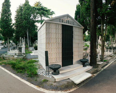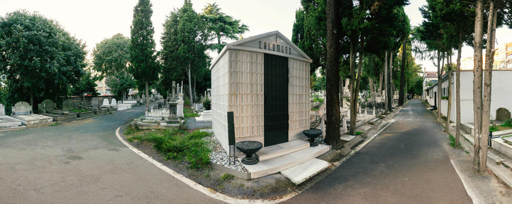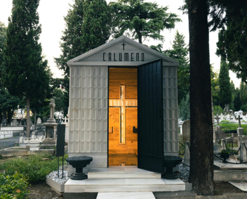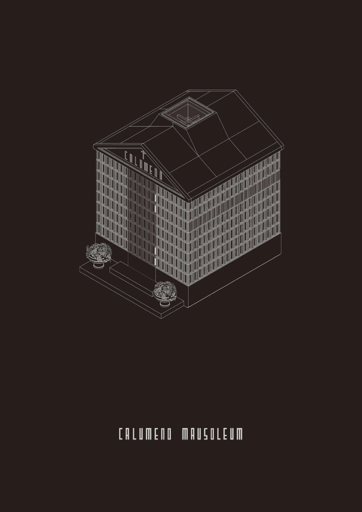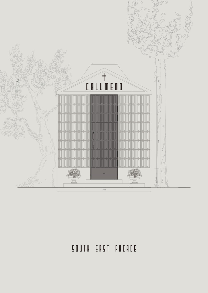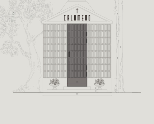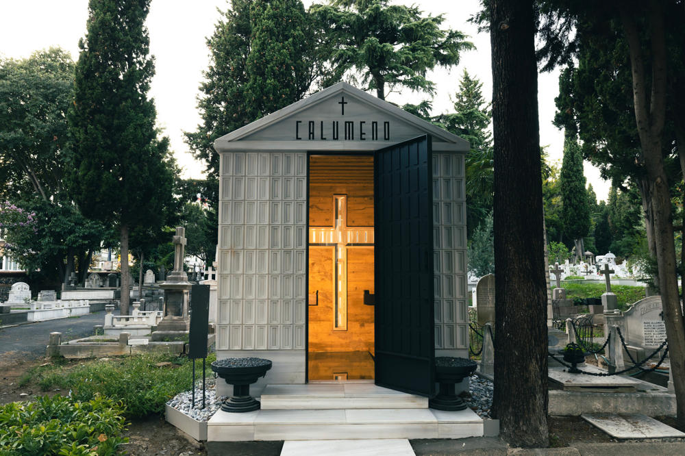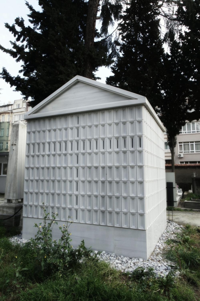 Levanten kökenli Calumeno ailesi için tasarlanan mozole, 3 metre x 3 metre taban alanına oturan ve 4 metre yüksekliğe sahip bir kütle. Ana taşıyıcı sistemi betonarme perdelerden oluşmakta olup, dış cephe kaplamasında 40 mm kalınlığında Marmara mermeri kullanılmış. Bu mermer paneller, derinlemesine oyulmuş kasetlerden meydana gelerek yapıya hafifletilmiş bir strüktürel ifade kazandırıyor. Mozolenin toprak altı kotunda konumlanan bir mezar odası, tabutların muhafaza edilmesi için tasarlanmış olup, bu alanın oluşturulabilmesi adına 3 metre derinliğinde bir kazı işlemi gerçekleştirilmiş.