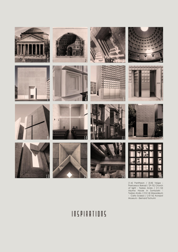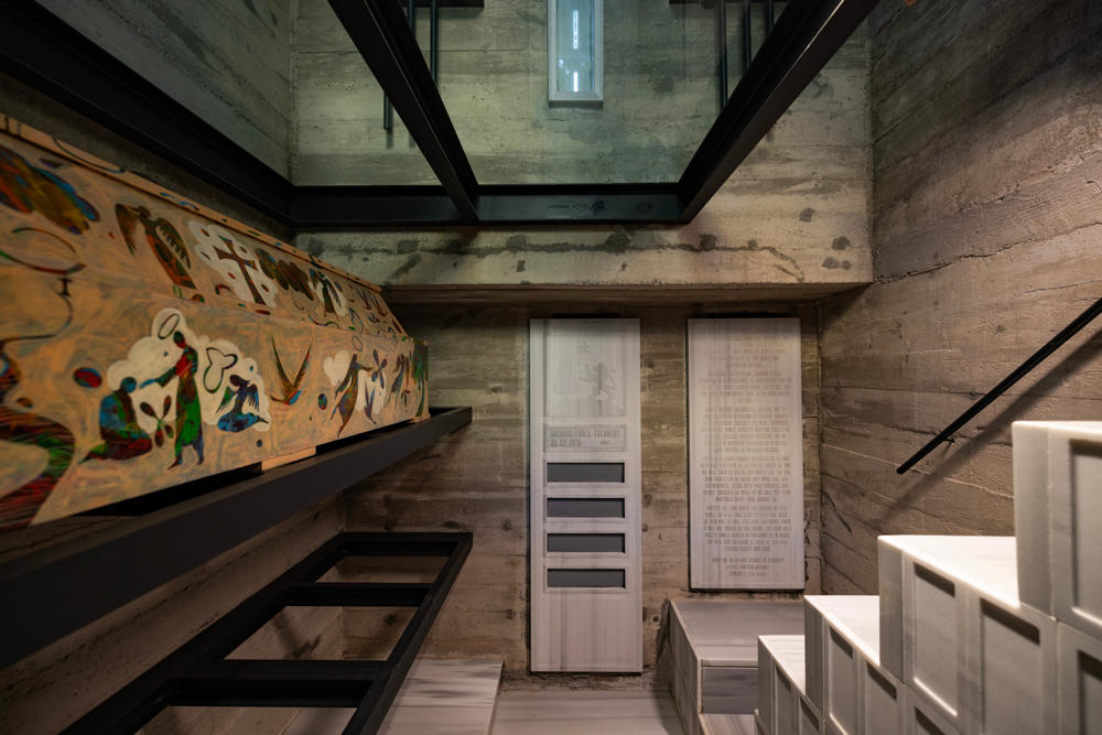 Venedikli mimar Carlo Scarpa’nın Brion Mezarlığı’nda geliştirdiği brüt beton kademeler, Calumeno Mozolesi’nin tavanında kubbeleşen ve tepe ışıklığına yönelen geçişlerde kritik bir referans noktası olmuş. Mozoledeki bu tür detayların, modern ve klasik İtalyan mimarisine yapılan bilinçli göndermelerle şekillendirilmesi, Levanten kimliği ile doğrudan ilişki taşıyor.