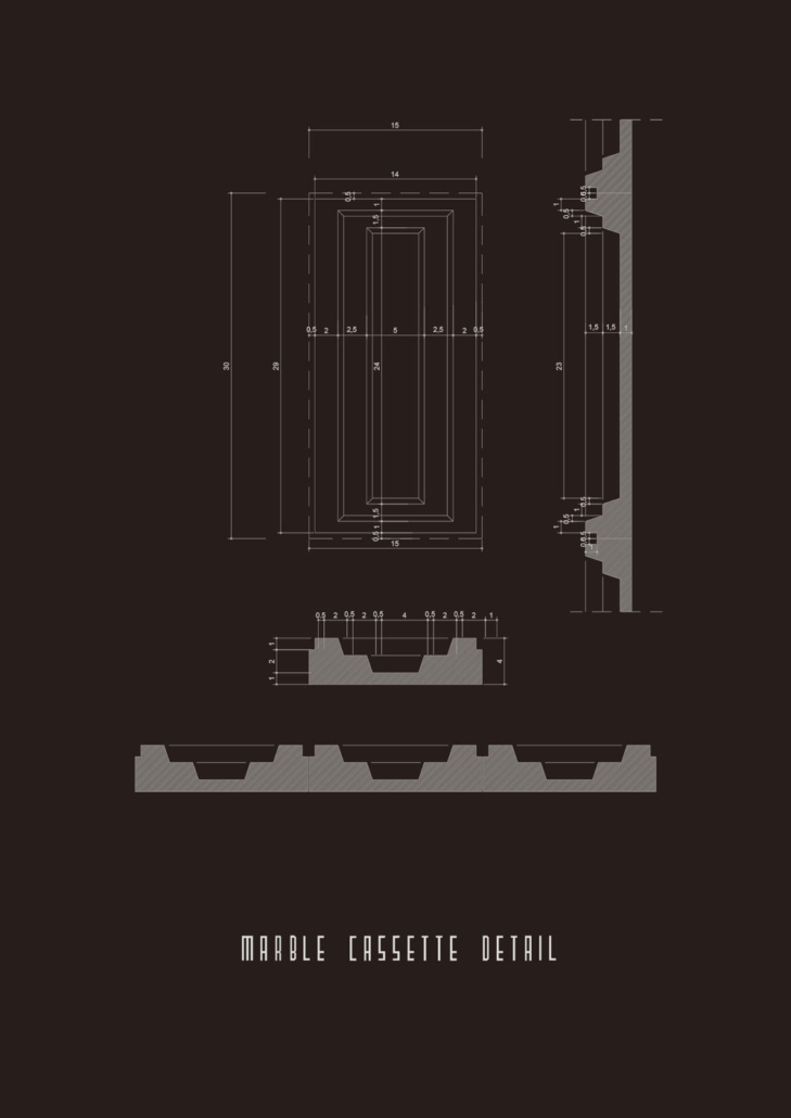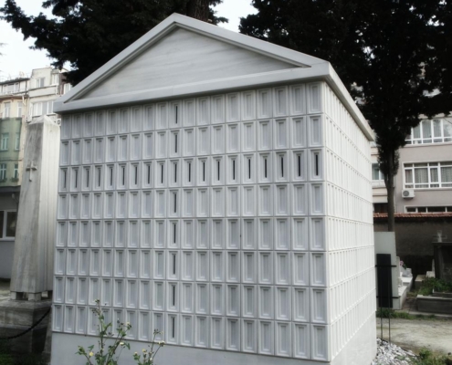 Feriköy Mezarlığı, yaklaşık bir asır öncesine tarihlenen, ince işçilikle biçimlendirilmiş birçok mezar taşı, sütun, fresk ve anıt heykellere ev sahipliği yapıyor. Bu yapılar, dönemin zanaatkar ruhunu ve mimari detaylara verilen önemi gözler önüne seriyor. Ancak, çağdaş inşaat tekniklerinin ve üretim süreçlerinin değişmesiyle birlikte bu tür detayların aynı incelikte yeniden üretimi günümüzde mümkün değil veya farklı metotlarla ele alınıyor. Bu bağlamda, “Günümüz inşaat teknolojileriyle Feriköy Mezarlığı bağlamında bir mozole nasıl tasarlanabilir?” sorusuna yanıt arayan proje, zanaatkarlığı çağdaş üretim teknikleriyle buluşturmayı amaçlıyor. Anıtsal bir ifade taşıyan mozole, mezarlık dokusu ile uyumlu, ancak daha sade, sağlam, güçlü ve geometrik bir düzen içinde şekillendirilmiş. Cephelerde kullanılan modüler taş birimleri, klasik mozole anlayışını dönüştüren bir prototip oluşturma hedefinin temel çıkış noktasını oluşturmuş. Mermer kasetlerin iç kısımlarının oyulması, bu tasarımın özgün bir ifadesi olarak ön plana çıkıyor. Mermer üzerinde cnc makineleri ile yapılan sulu oyma işlemi 40 mm kalınlığındaki mermerleri 15×30 cm’lik kasetler haline getirmiş.
