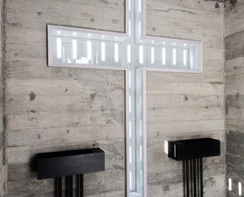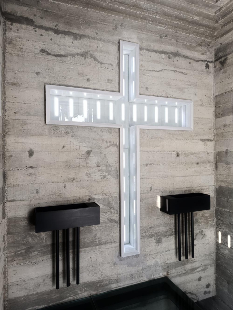 Mozolenin iç mekanında ışık kullanımını sınırlandıran bir yaklaşım benimsenmiş, ancak mermer kasetlerin en ince noktalarında ışık yarıkları bırakılarak doğal ışığın içeri süzülmesine olanak tanınmış. Apsiste konumlanan haç biçiminde ışık yarıkları, Tadao Ando’nun 1999 tarihli Işık Kilisesi’nden esinlenerek oluşturulmuş. Işığın soyut ifadesi, iç mekanda ziyaretçiyi duygusal ve mekansal bir deneyime davet eden temel tasarım öğelerinden biri haline gelmiş.