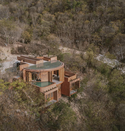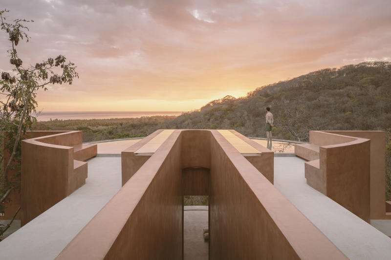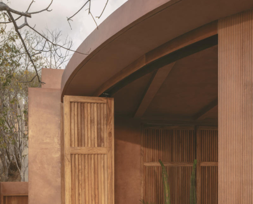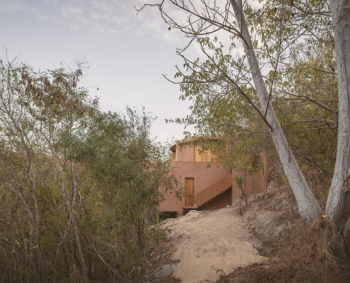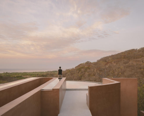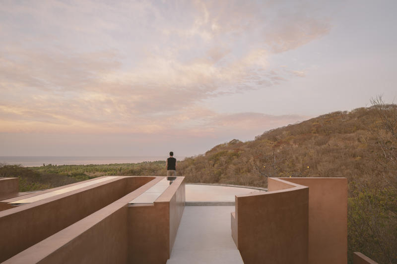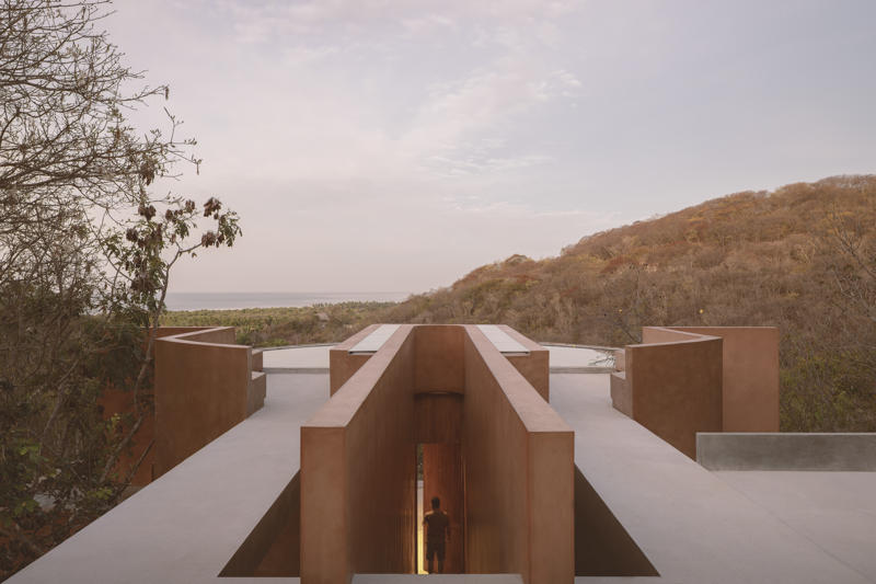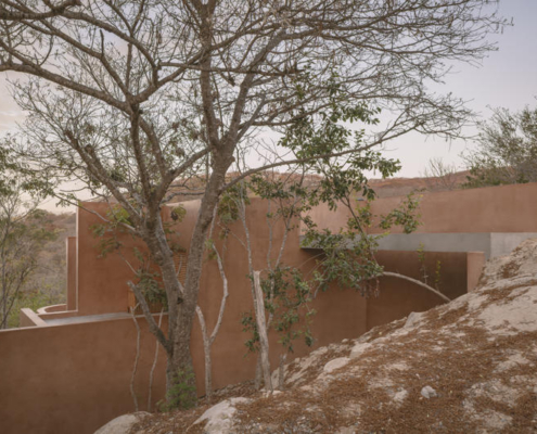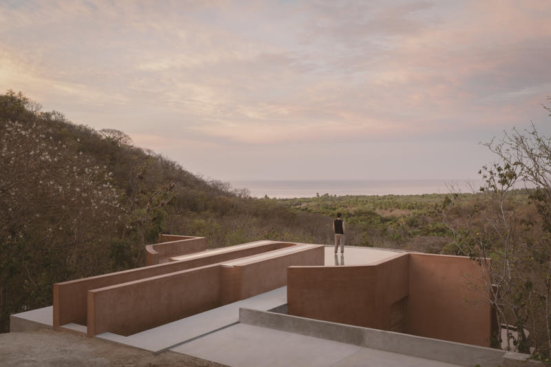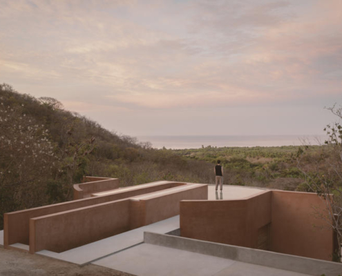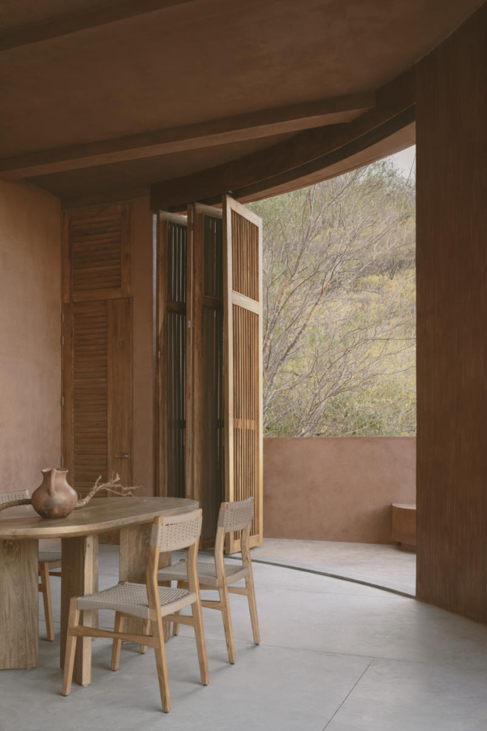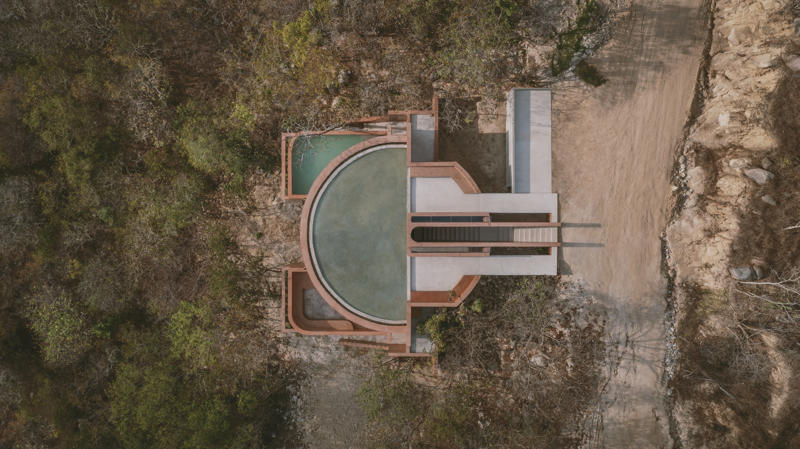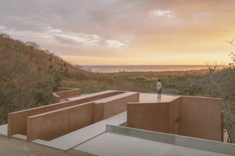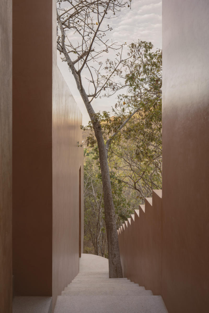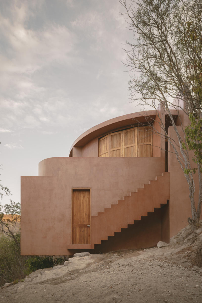 En alt katta yer alan yatak odaları, ağaç tepeleriyle iç içe geçerek iç mekân ile dış dünya arasında mahrem ve şiirsel bir bağ kuruyor. Kullanılan toprak tonlarındaki malzemeler, gün batımının sıcak renklerini çağrıştırırken, aynı zamanda bir yengeç kabuğunu andıran biçimiyle yapıyı bölgenin kurak doğasıyla görsel olarak bütünleştiriyor. Yapı boyunca farklı noktalarda konumlandırılan su ögeleri ise, Oaxaca’nın ünlü Hierve el Agua’daki taşlaşmış şelalelerini anımsatıyor.