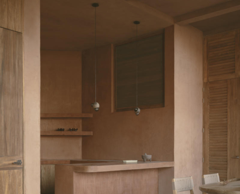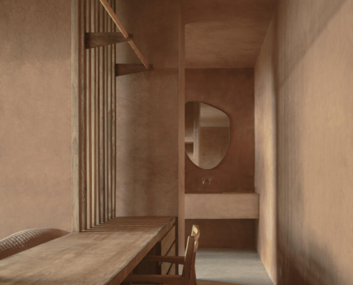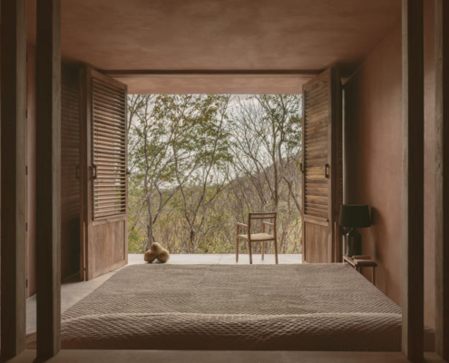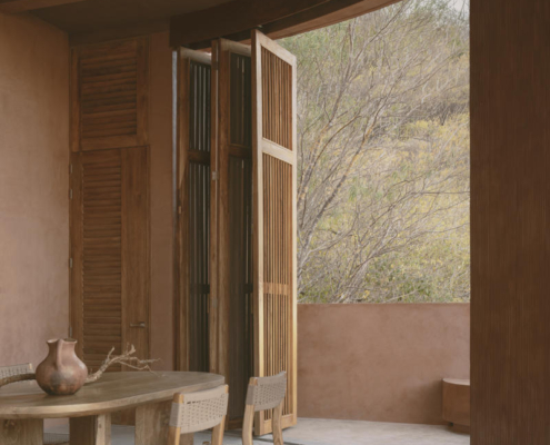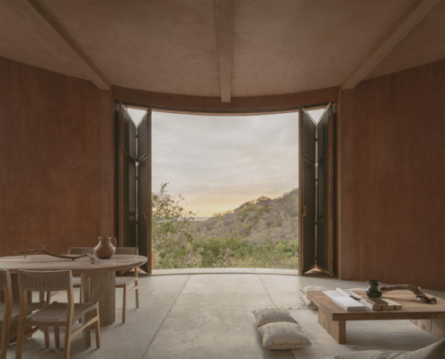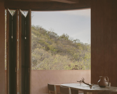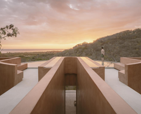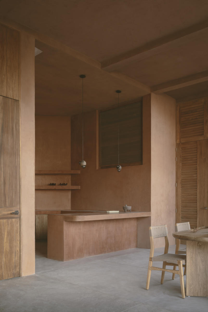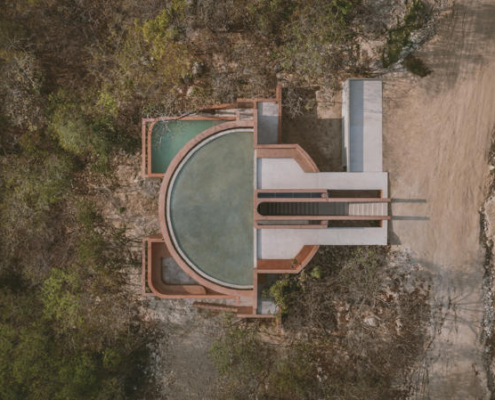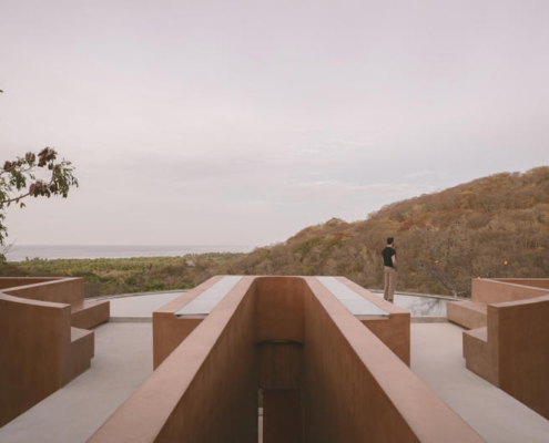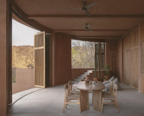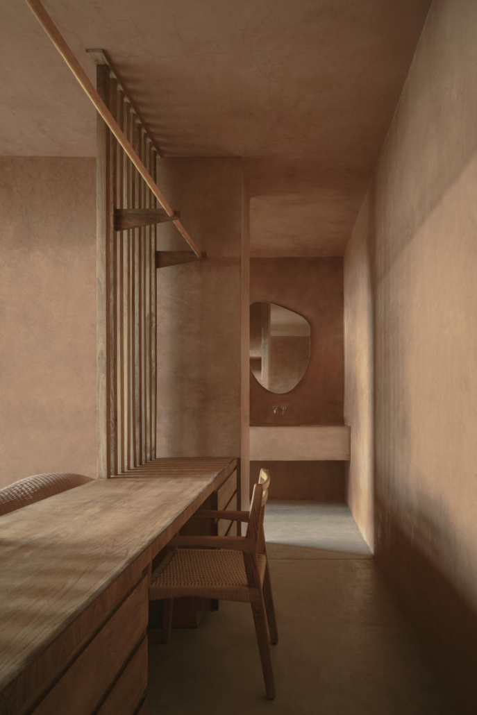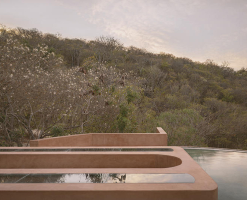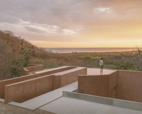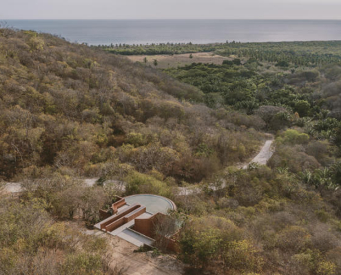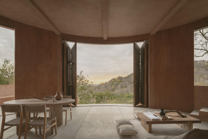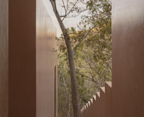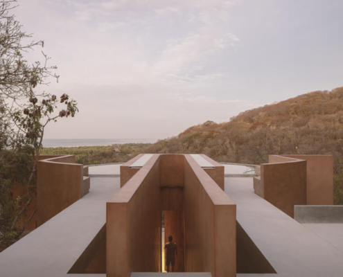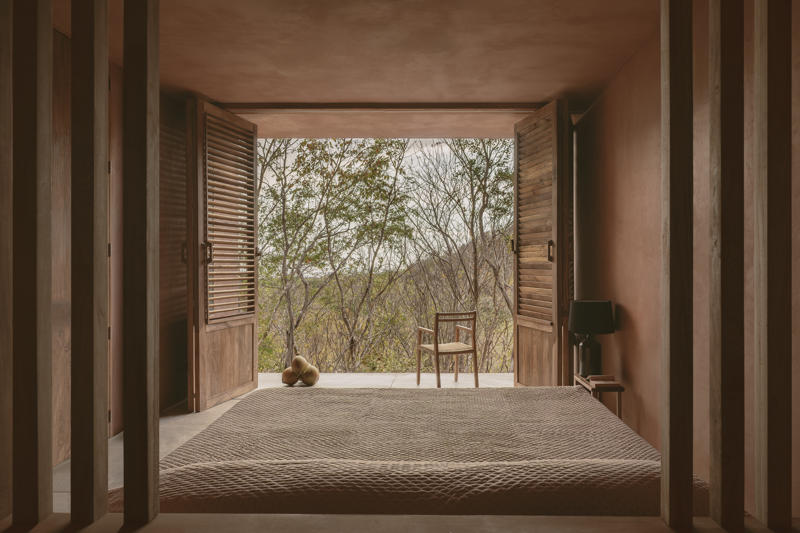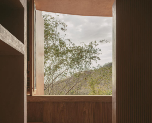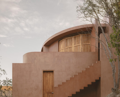 En alt katta yer alan yatak odaları, ağaç tepeleriyle iç içe geçerek iç mekân ile dış dünya arasında mahrem ve şiirsel bir bağ kuruyor. Kullanılan toprak tonlarındaki malzemeler, gün batımının sıcak renklerini çağrıştırırken, aynı zamanda bir yengeç kabuğunu andıran biçimiyle yapıyı bölgenin kurak doğasıyla görsel olarak bütünleştiriyor. Yapı boyunca farklı noktalarda konumlandırılan su ögeleri ise, Oaxaca’nın ünlü Hierve el Agua’daki taşlaşmış şelalelerini anımsatıyor.