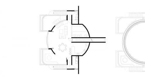 Ana giriş üst katta yer alıyor. Bu seviyede bir teras ve havuz ziyaretçileri karşılıyor. Su yüzeyi, çevredeki ormanı ve gün batımının kızıl tonlarını yansıtırken, alt kattaki sosyal alanlara ferahlık ve serinlik sağlıyor. Aynı zamanda huzurlu ve düşünsel bir atmosfer yaratarak doğa ile mimariyi derin bir şekilde bağlayan duyusal bir deneyimin başlangıç noktasını oluşturuyor.