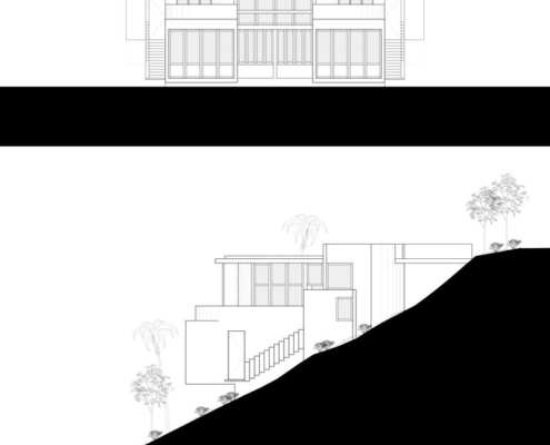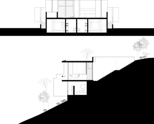 Teras seviyesinden aşağıya inen yürüyüş yolu, bir mağaraya doğru yönlendirilmiş hissi yaratıyor; geçit daralıyor, beden mekanla sıkı bir ilişki kuruyor. Yolun sonunda, aniden yükselen çift hacimli bir sosyal alana geçiliyor; burada büyük açıklıklar vadileri ve denizi çerçeveleyerek dramatik manzaralar sunuyor. Bu seviyede çalışma alanı, mutfak, yemek bölümü, oturma odası, havuz ve ateş çukuru yer alıyor; hepsi birlikte yaşamı teşvik eden, çevresiyle etkileşim kuran ve farklı kullanımlara göre yeniden düzenlenebilen alanlar. Proje, arazinin doğal eğimini takip eden kademeli tasarımıyla topoğrafyaya uyum sağlıyor. Yapılar, her mekandan maksimum manzara elde edecek şekilde konumlanmış.