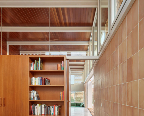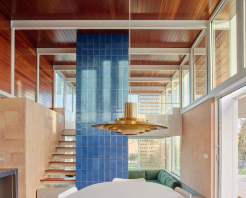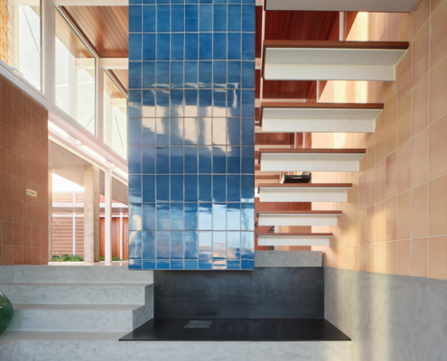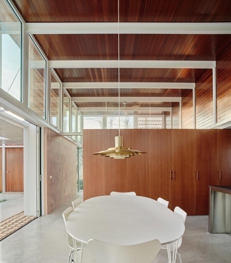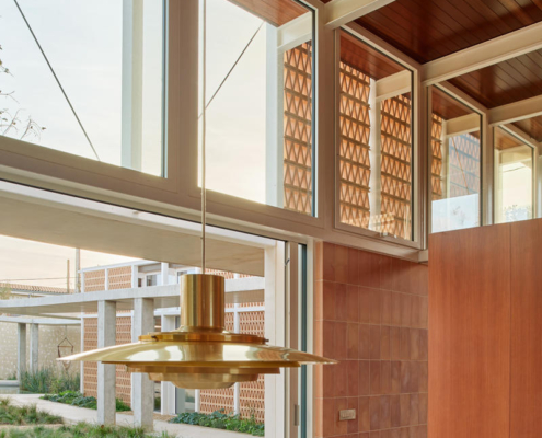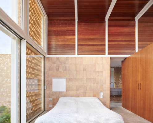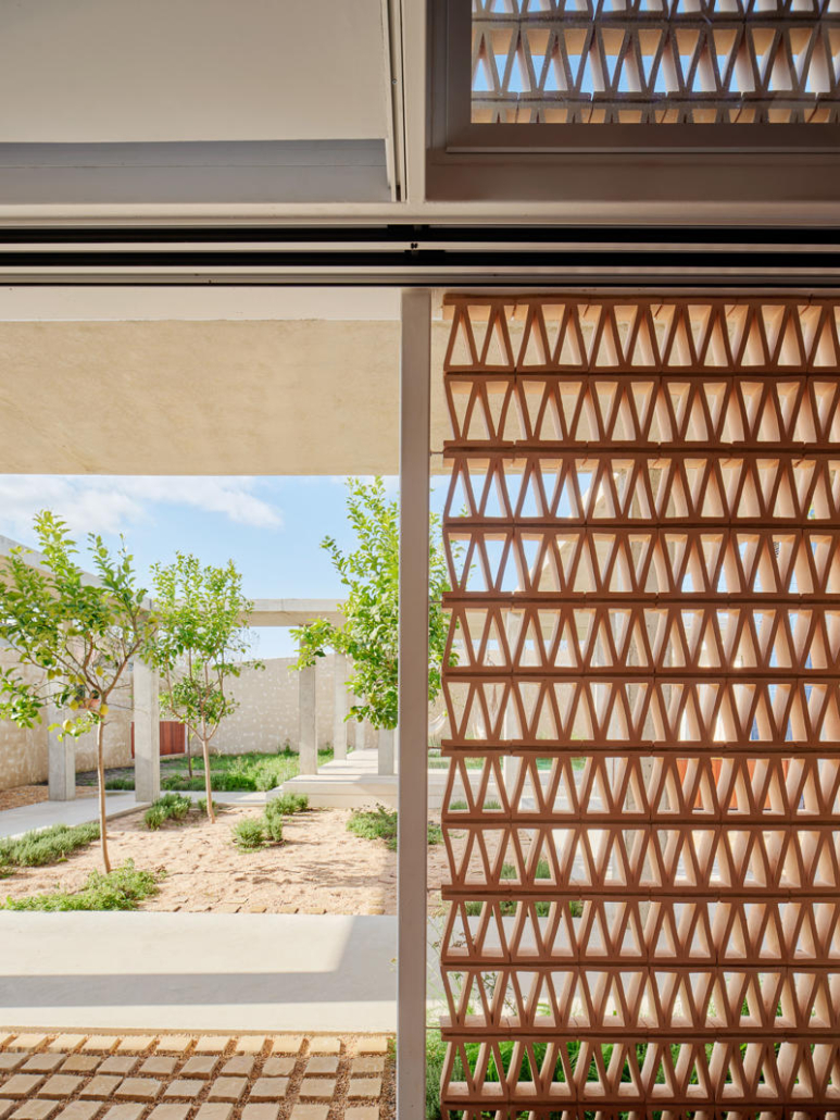 Ev; seramik kafes örgüler, cam, çelik ve ahşap gibi geçirgen ve saydam elemanlardan oluşuyor. Bu sayede esinti, ışık, gölge ve ses serbestçe dolaşabiliyor. Yapı, adeta maddeden çok havadan inşa edilmiş hissi uyandırıyor.