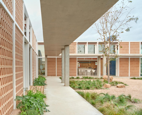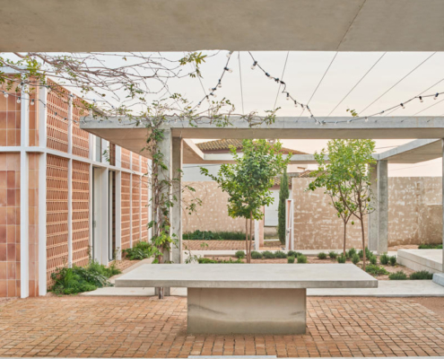 Üç avlu merkezinde kurgulanan tasarım, bir Roma villasını çağrıştırıyor. İlk avlu, bir köy meydanı gibi tanımlanıyor ve ortasında yer alan ağaç ile doğal bir canlılık taşıyor. İkinci avluda yer alan havuz, yansıtıcı bir su yüzeyini andırıyor. Bitkilerle çevrelenmiş olan bu alan, Roma “domus”larındaki yağmur suyunu toplamak ve iç mekanın iklimini düzenlemek için kullanılan sığ havuz olan “impluvium”a referans veriyor. Üçüncü avlu ise aromatik bitkilerle dolu, manastır revaklarını anımsatan kokulu bir bahçe olarak kurgulanmış. Bu duvarlar, avlular ve mekansal düzenlemeleriyle yapı; neşeli, samimi ve dingin bir atmosfer oluşturuyor. Ana yapı malzemesi olan beton, dayanıklılığı simgelerken; avluların etrafını saran kolonlarda kullanımıyla antik kalıntıları anımsatan bir izlenim yaratıyor.