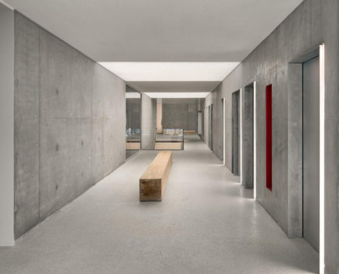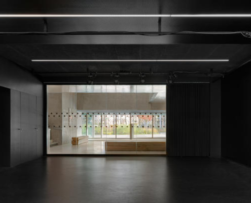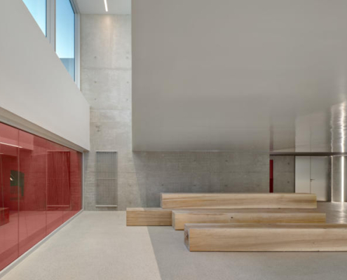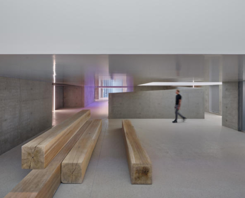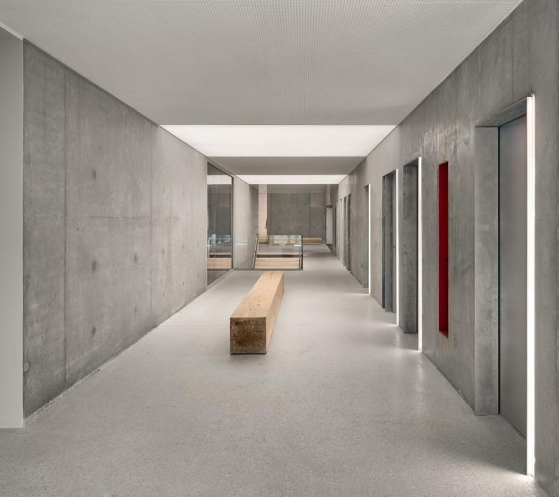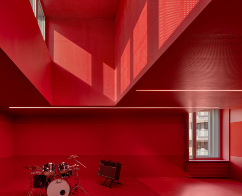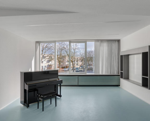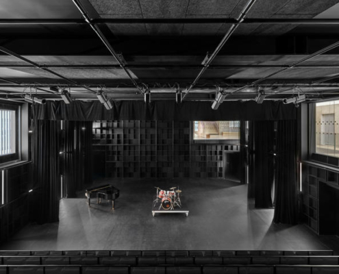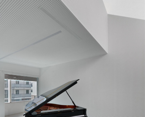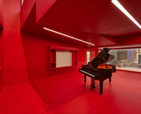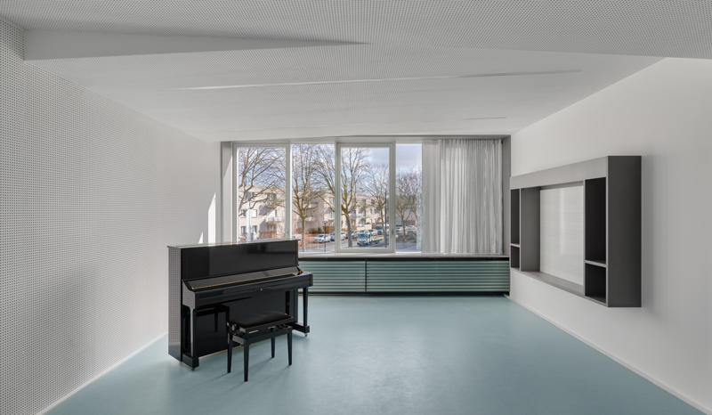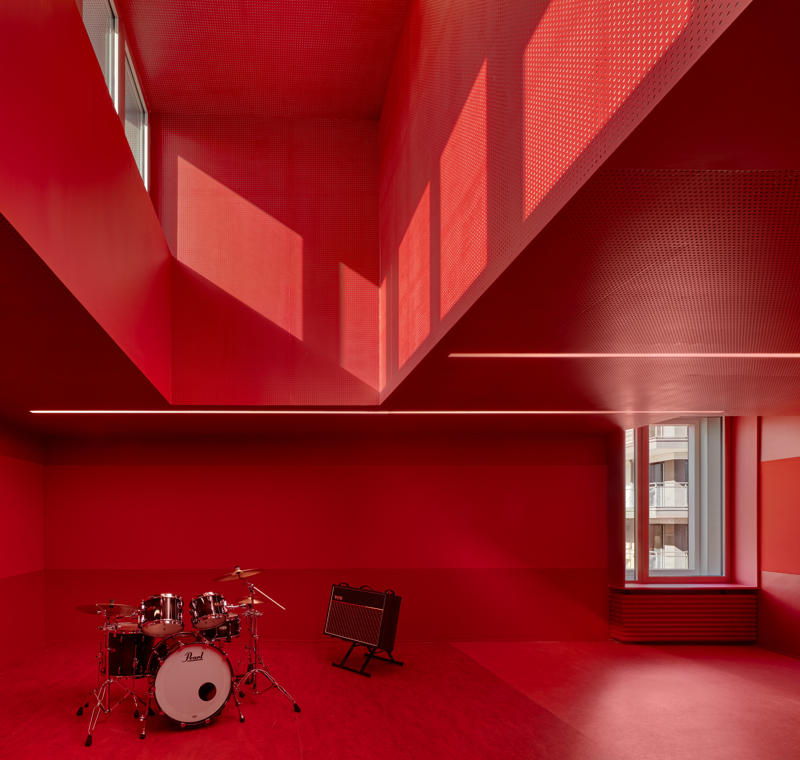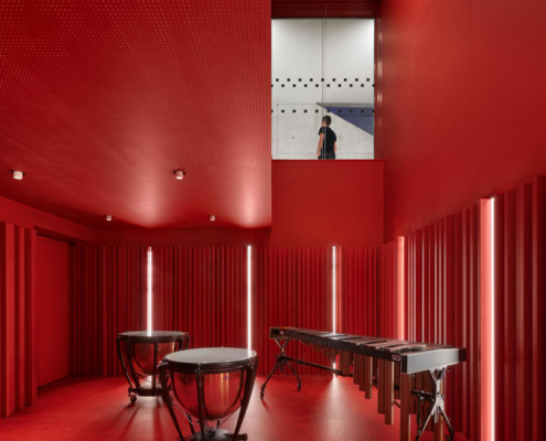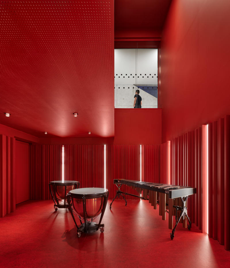 Giriş salonuna adım atıldığında, ziyaretçilerin iki kat yüksekliğinde tavanı olan ve alt katta bulunan enstrümanları görebileceği mağara gibi bir oditoryum ve perküsyon odası olmak üzere iki yüksek bodrum katı bulunuyor. Koridorlar kontrastlarla karakterize edilmiş: Çıplak beton duvarlar, parlak zeminler ve tavanlarla yan yana duruyorlar. Mahaller, tüm katlarda büyük masif ahşap eklemelerle süslenmişler ve bu da ortak kullanım alanlarını davetkar hale getiriyor.