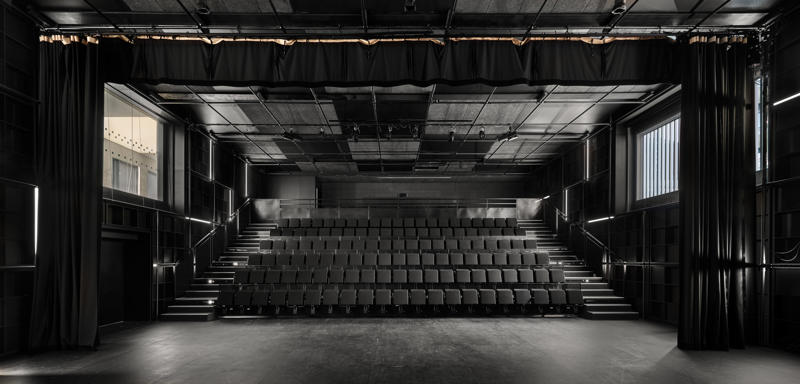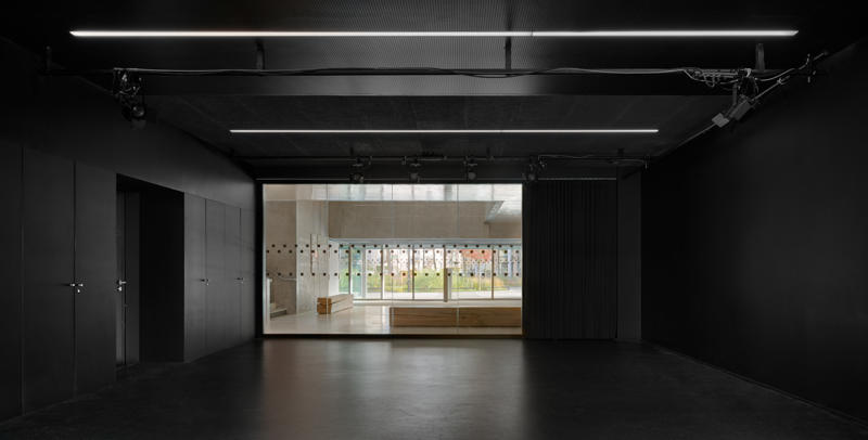 Binanın dış cephelerinde ışığı yansıtan şeffaf cam paneller ve dikey çizgili yüzeyler kullanılmış. Çeşitli dokular yan yana sergilenerek binanın gerçek ölçeğini bulanıklaştırıyor ve yapıya alışılmamış bir hava ve farklı yorumlama olanakları kazandırıyor. Dört katlı yapıda, drama odaları, büyük bir kara kutu oditoryumu, farklı boyutlarda müzik odaları, bir kayıt stüdyosu, soyunma odaları bulunan üç dans odası ve bir yer altı otoparkı yer alıyor. Mekansal program, şehri veya binanın ana bölümlerini gören, geniş ve samimi alanlar sunan düzensiz bir eksen boyunca yayılmış.