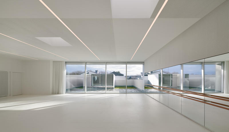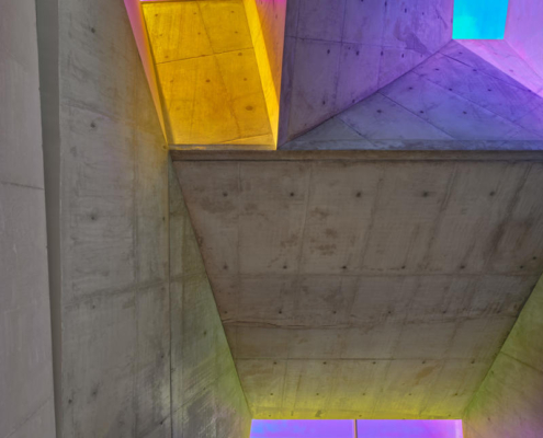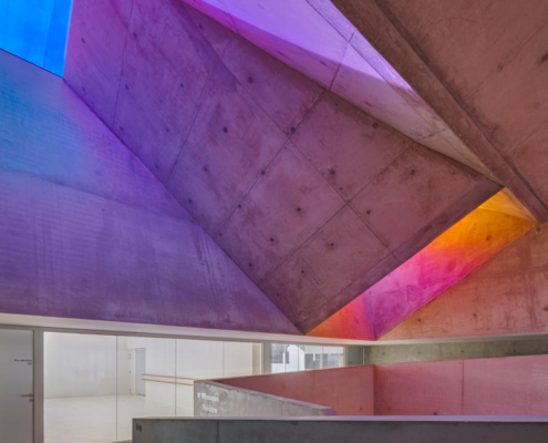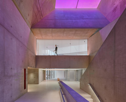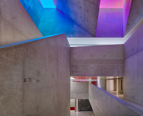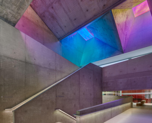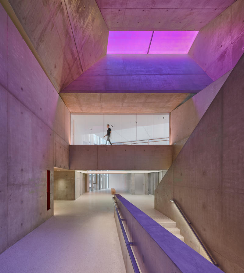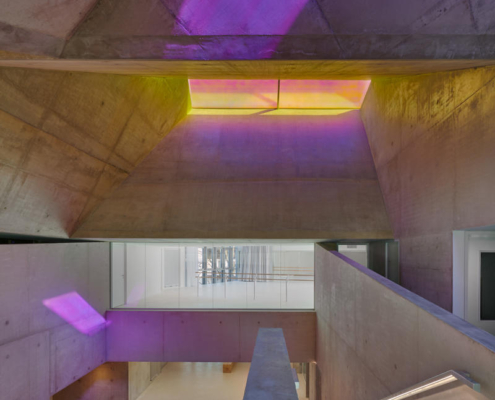 Yapının uzun kesiti, tüm bu alanlar arasında yaratılan bağı en iyi şekilde anlatan temsili sunuyor. Üç büyük tavan penceresi, her yönden doğal ışığı daha iyi içeri almak için çarpıtılmış tavanı vurguluyor. Bu atriyumda, ışık ve dans odalarına doğru uzanan, diyagonal olarak açılan devasa bir merdiven yükseliyor. Büyük cam paneller, dikroik filmlerle kaplanmış. Renkleri, ziyaretçilerin konumuna ve güneşin konumuna göre değişiyor. Mekanlar, sürekli değişen renkleri yayan bu dev kaleydoskopla birbirine bağlanıyor.