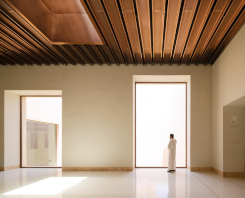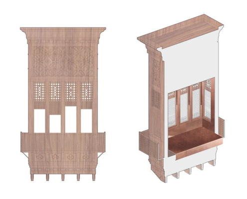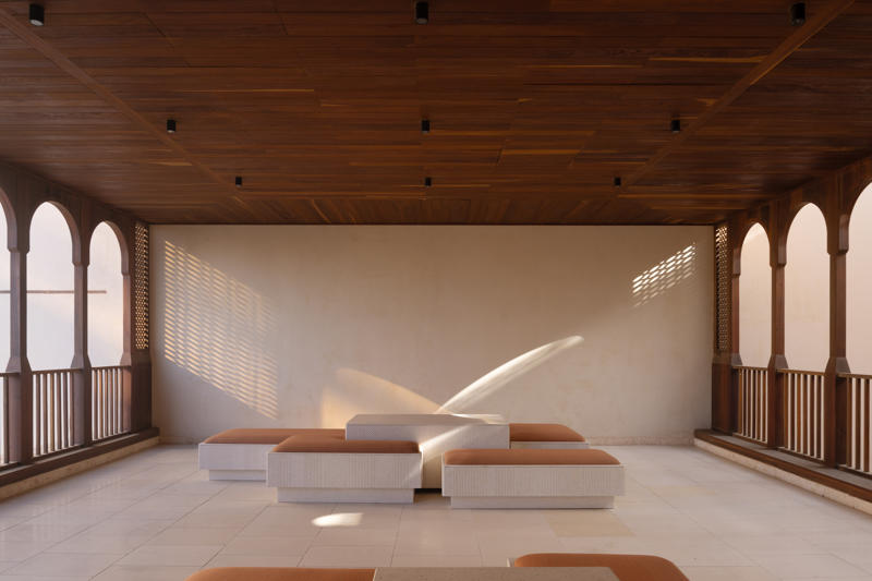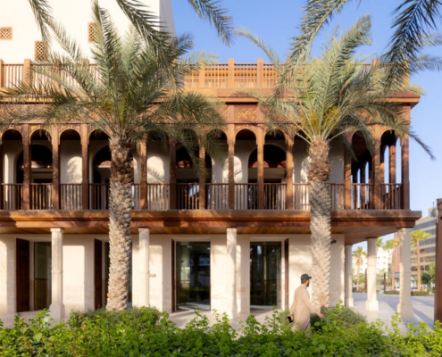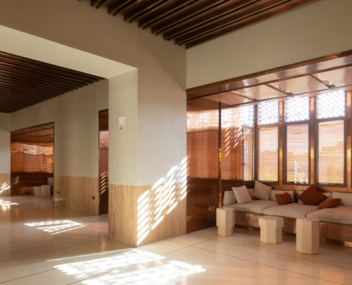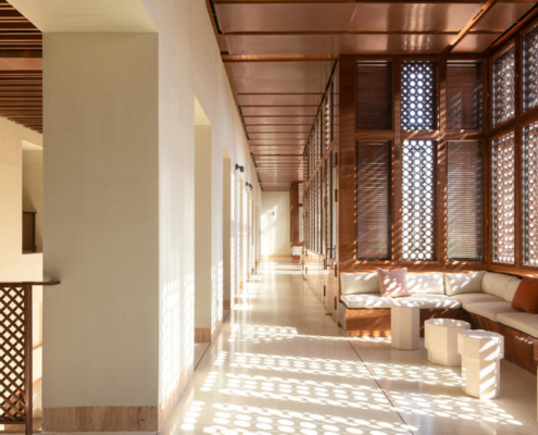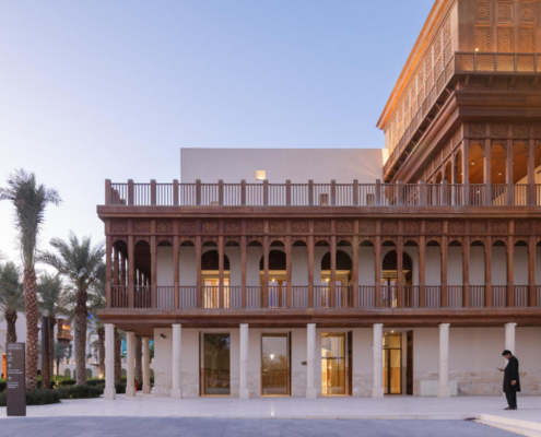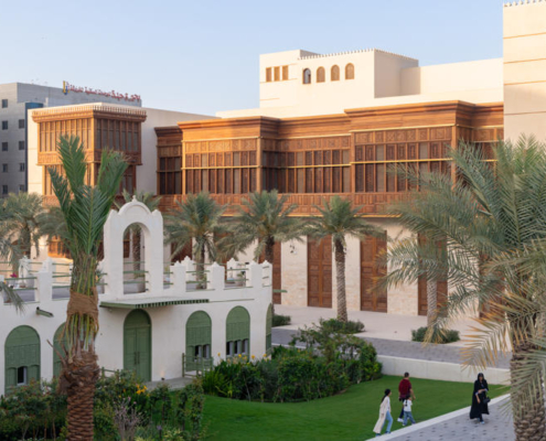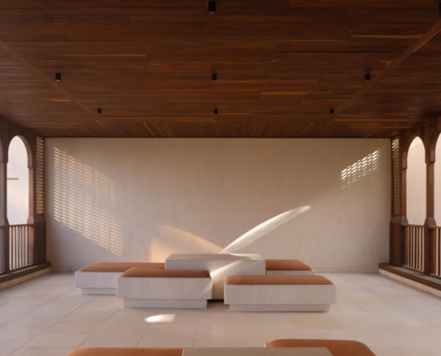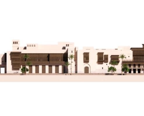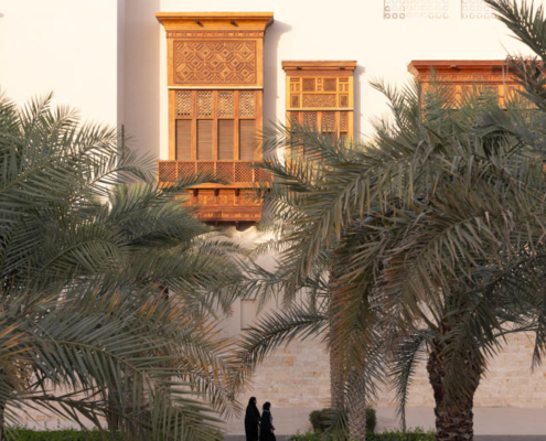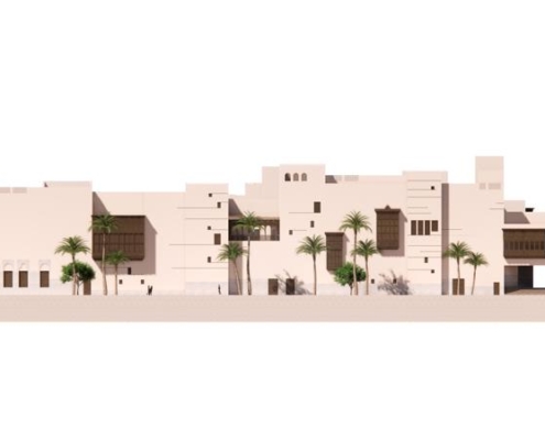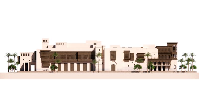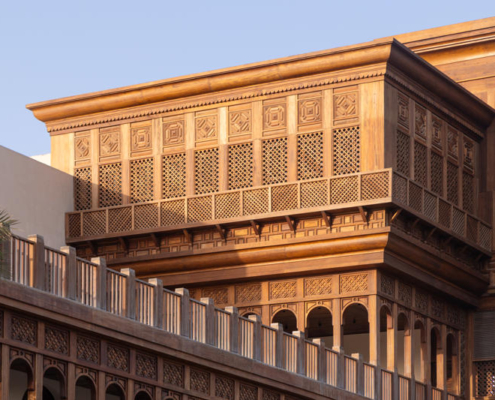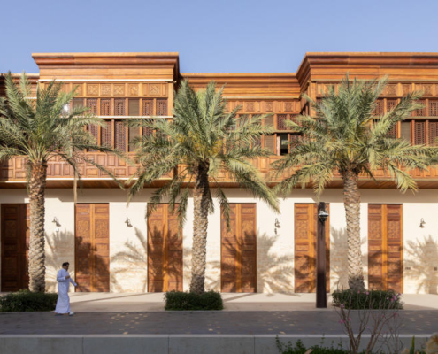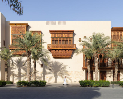 Dış cephede ise Cidde’nin el işçiliğiyle şekillenen geleneksel yüzeyleri, modern üretim teknikleriyle yeniden yorumlanıyor. Kütle ve şeffaflık arasındaki ilişki, eski kent dokusunun ritmini çağrıştırırken yapıların çağdaş karakterini de vurguluyor. Yerel, el yapımı ahşap işçilik ile ileri teknolojili imalat yöntemlerinin bir arada kullanılması, bütün projenin mimari dilini belirleyen bir ustalık dengesi oluşturuyor.