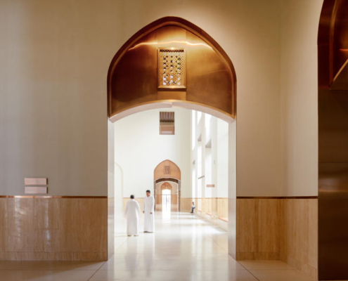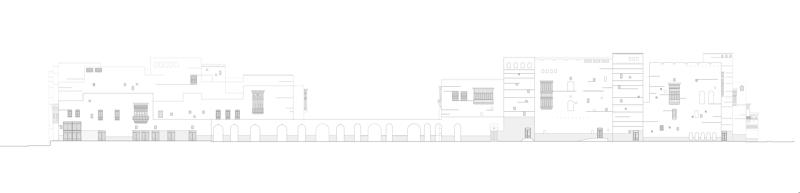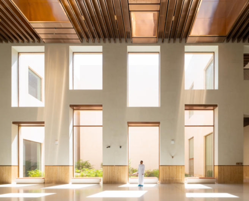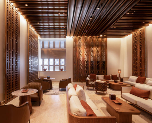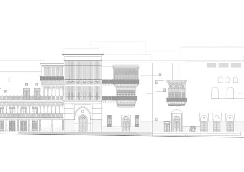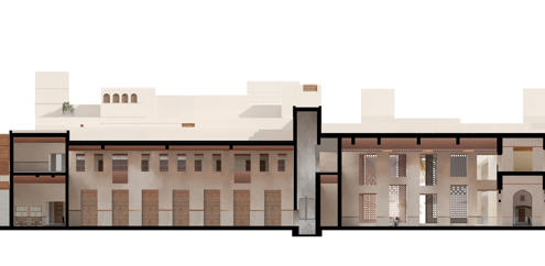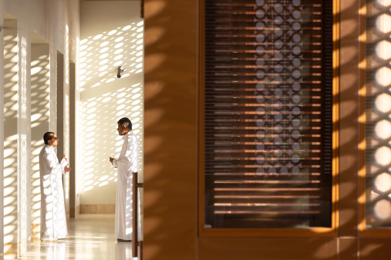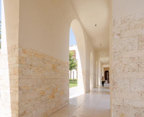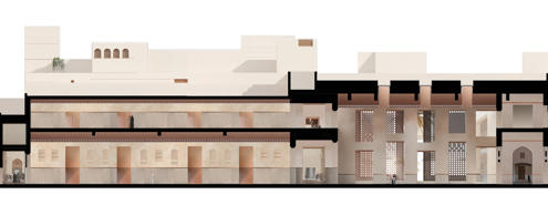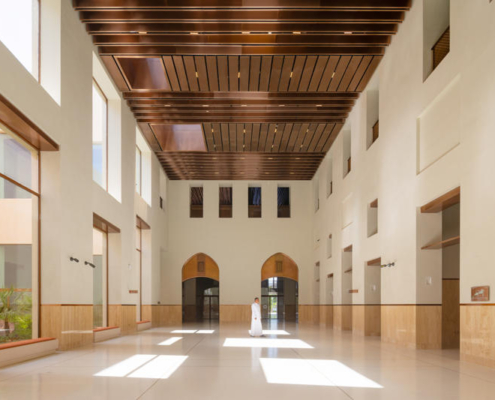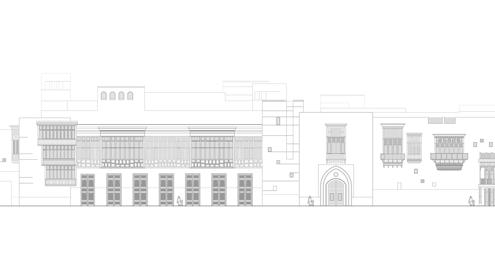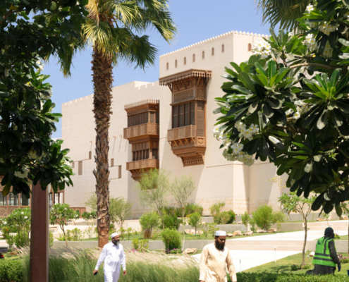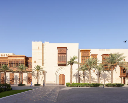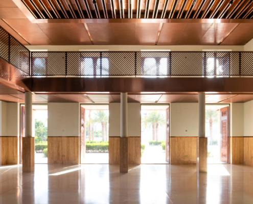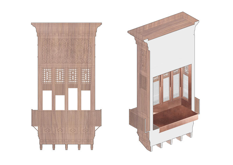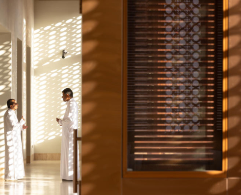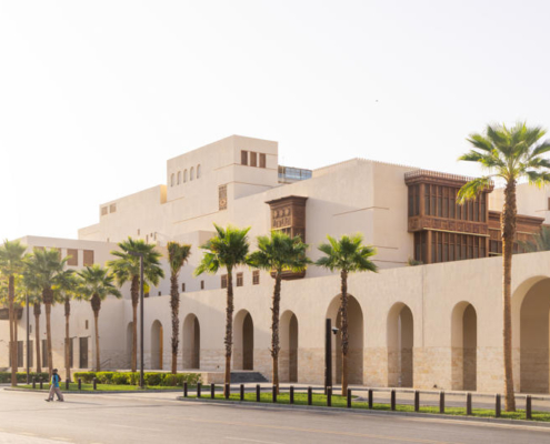 Dış cephede ise Cidde’nin el işçiliğiyle şekillenen geleneksel yüzeyleri, modern üretim teknikleriyle yeniden yorumlanıyor. Kütle ve şeffaflık arasındaki ilişki, eski kent dokusunun ritmini çağrıştırırken yapıların çağdaş karakterini de vurguluyor. Yerel, el yapımı ahşap işçilik ile ileri teknolojili imalat yöntemlerinin bir arada kullanılması, bütün projenin mimari dilini belirleyen bir ustalık dengesi oluşturuyor.