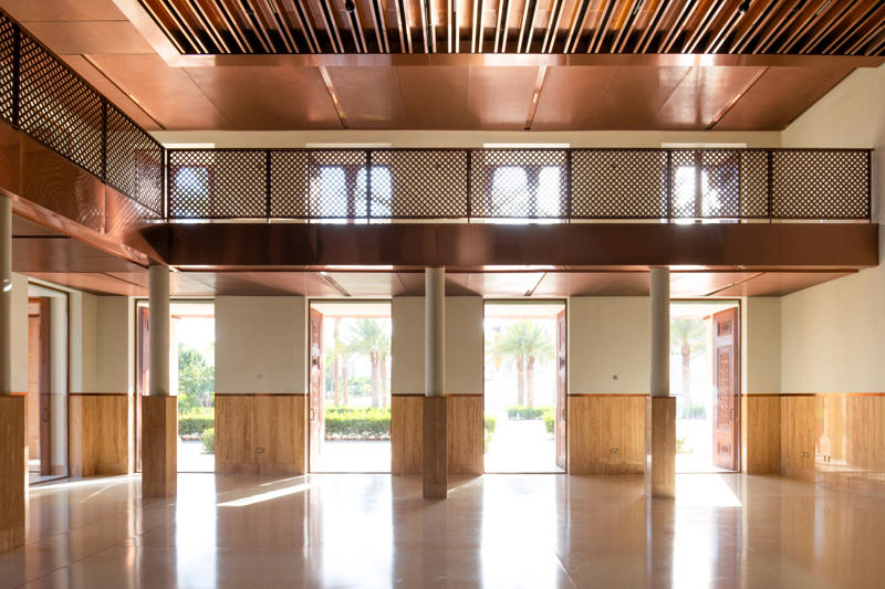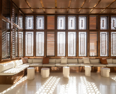 Tasarım, Cidde’nin mimari kimliğinden derin izler taşıyor. Kentin geleneksel ahşap kafes elemanı olan “roshan”, projede yenilikçi ve çağdaş bir yorumla ele alınmış. İç mekanda bakır yüzeyler üzerine kurulan roshan dokusu gün boyunca ışığı toplayıp dağıtarak sıcak ve ileriye dönük bir atmosfer yaratıyor. Bu güçlü malzeme tercihi, yüzyıllardır kullanılan bir tipolojiyi çağdaş bir ışık ve desen peyzajına dönüştürüyor.