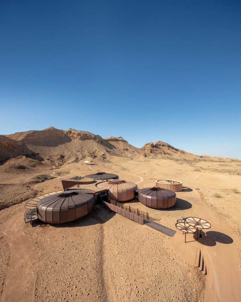 Hopkins Architects tasarımı Buhais Ziyaretçi Merkezi, tarih öncesi bir deniz yatağında çölün ortasında konumlanıyor. Ziyaretçi merkezinin mimarisi, yaklaşık 65 milyon yıl öncesine ait fosilleşmiş deniz kestanelerinin yuvarlak ve kabuklu formundan esinleniyor. Yapı, bronz renkli çelik panellerle kaplı dört adet dairesel, betonarme kapsülün bir araya gelmesiyle oluşuyor. Ziyaretçiler, köprüyle ulaşılan resepsiyon alanından içeri giriyor ve burada jeolojik evrimi anlatan sergi alanlarına adım atıyor. Yapı toprağın ve taşın hafızasına kulak veren bir anlatı mekanına dönüşüyor.