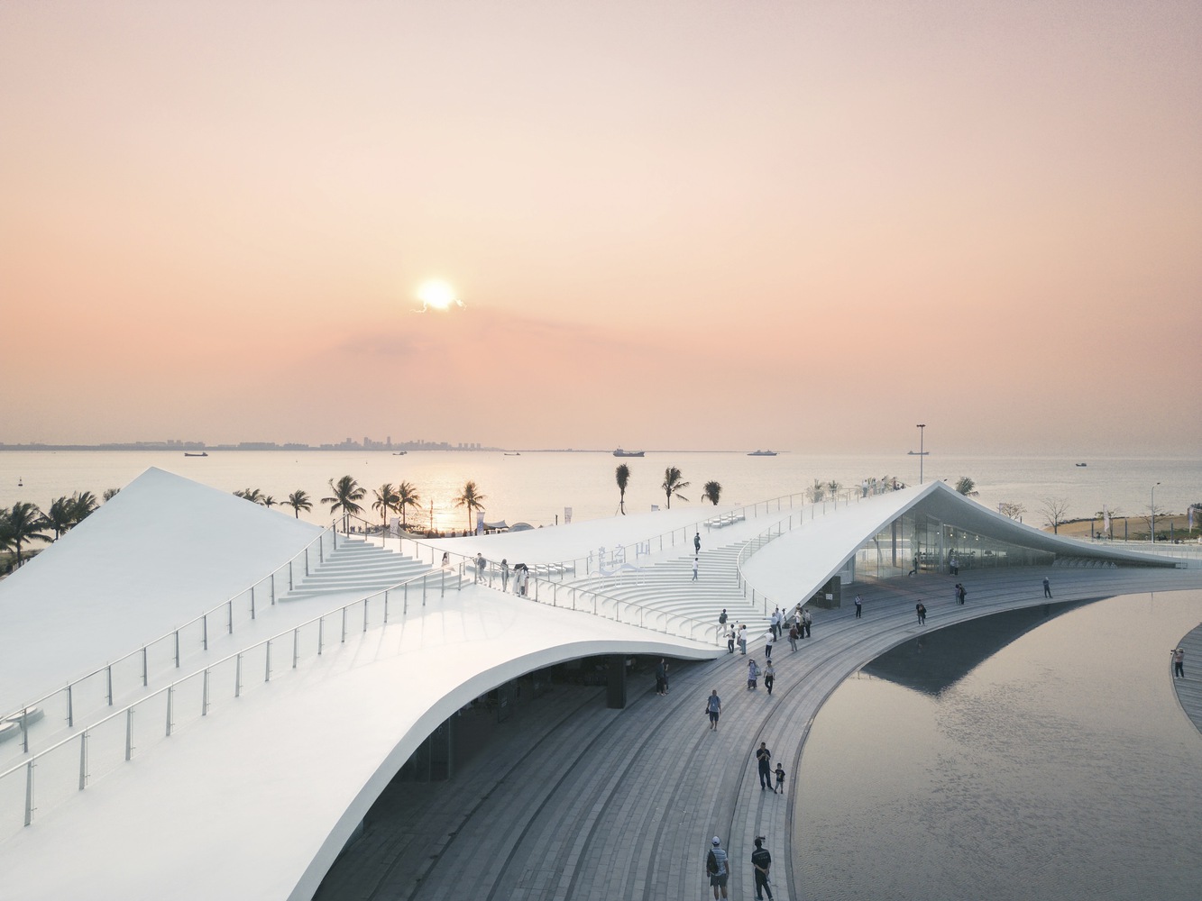 Sou Fujimoto Architects imzalı Haikou Bay Sahil Durağı (Sky Mountain), yalnızca bir bekleme noktası değil; doğayla şehir arasında dolaşan ziyaretçiler için sosyal karşılaşmalara, keşfe ve dinlenmeye alan tanıyan bir odak noktası olarak kurgulanmış. Gökyüzü Dağı adını taşıyan yapının formu, doğal bir vadinin yumuşak kıvrımlarını çağrıştırıyor. Bu tasarım yaklaşımı çatı yüzeyini adeta kıyıya doğru alçalan bir peyzaj öğesine dönüştürüyor. Açık plan içerisinde tüm işlevlerin bir araya getirildiği yapı, kullanıcıların akışkan biçimde hareket edebileceği bir platform sunuyor.