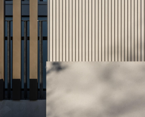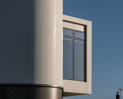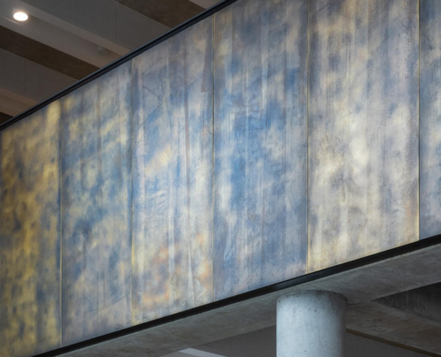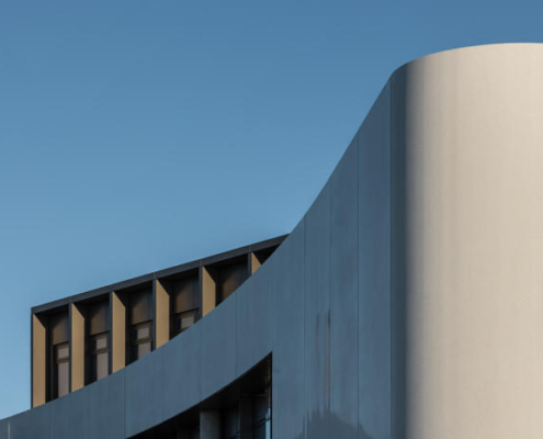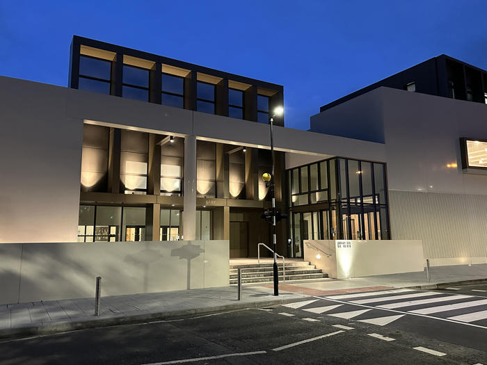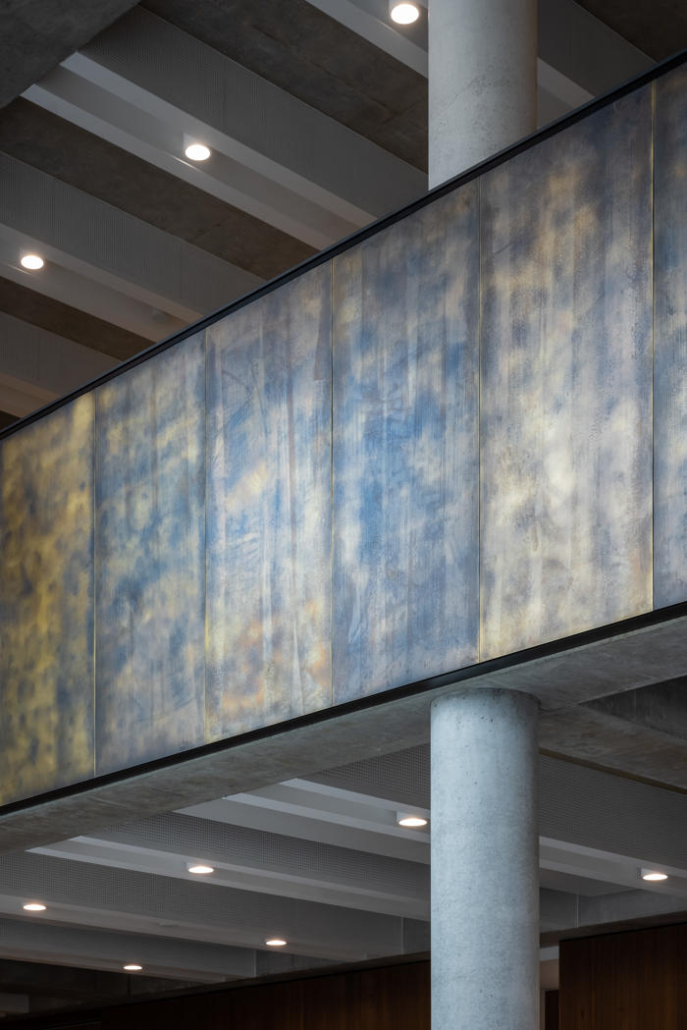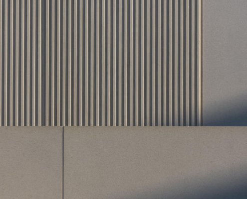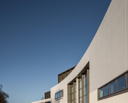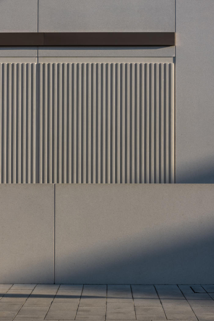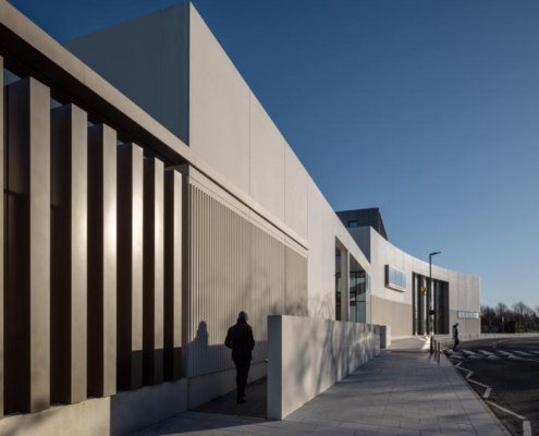 Açık renkli, cilalı yeniden yapılandırılmış taş cephe, prekast beton panellerle bütünleşmiş. Bu malzeme, binanın akıcı dış formunun oluşturulmasını sağlarken, aynı zamanda ince detaylı yüzeyler ve yivli dokular elde edilmesine olanak tanımış ve şehir içinde anlamlı ve uyumlu bir kamusal mimari örneği yaratmış. Metal aksamlar ve cam sistemler bronz renkli toz boyalı alüminyumdan yapılmış; çevredeki zemin yüzeylerde ise İrlanda kireçtaşı kullanılmış.