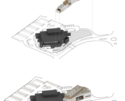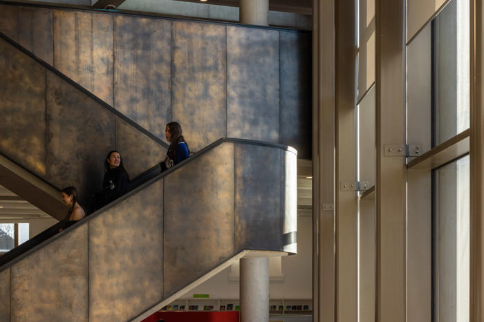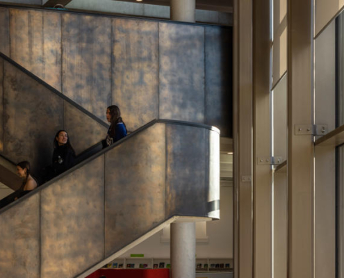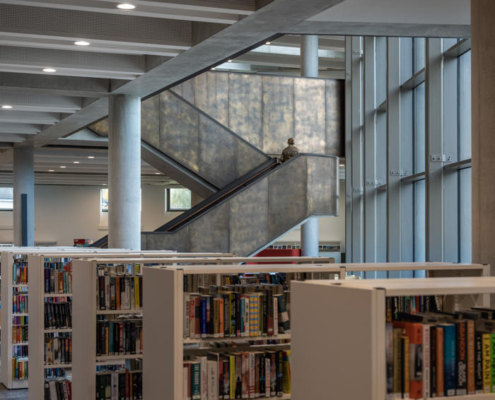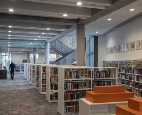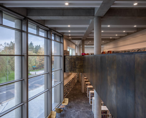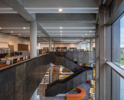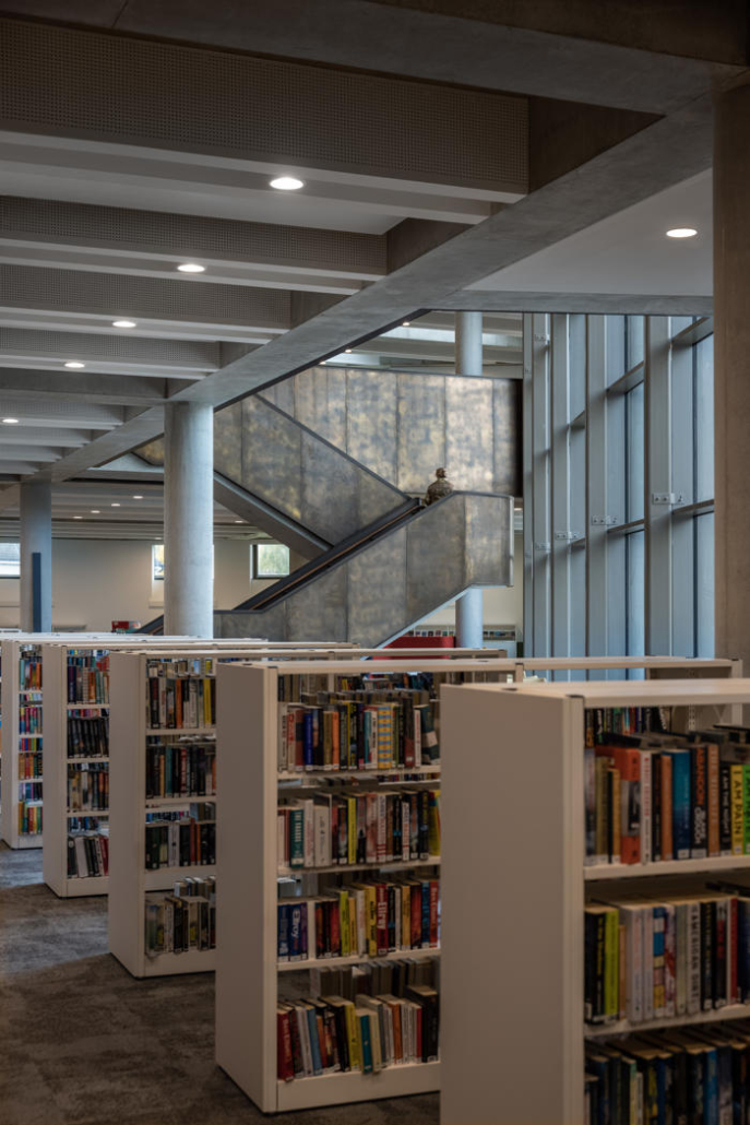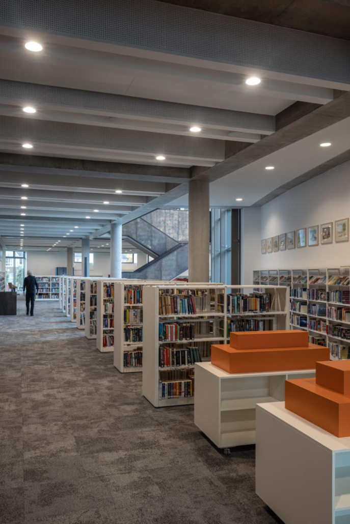 Yeni yapı, tüm bina kompleksini birleştiren 10 metre yüksekliğinde, dalgalı ve kavisli, yeniden yapılandırılmış taş bir cepheyle sarılmış. Ana cephedeki dev pencere, gündüz saatlerinde kütüphane içinden ve ana merdivenden karşıdaki Manastır Parkı’na manzaralar sunarken; akşam karanlığı çöktüğünde cam yüzeyler adeta çözülüyor ve kütüphanenin ışıltısı dışarıya yansıyor. İki katlı kütüphane, 73.000’den fazla kitap, çeşitli yayınlar, arşivler ve diğer medyaları içeren koleksiyonuyla yeni kompleksin en büyük bölümünü oluşturuyor. İç mekan açık ve şeffaf şekilde tasarlanmış; planda ortalanmış büyük boşluk ve Manastır Parkı’na bakan halka açık merdiven ile katlar ve kütüphane bölümleri arasında görsel ve fiziksel geçirgenlik sağlanmış. İlçe Kütüphane Hizmetleri, kütüphanenin üzerinde yer alan esnek bir ofis bloğuna yerleştirilmiş, Súil Sanat Galerisi ise ona bitişik bir heykel avlusuyla birlikte kütüphanenin ana girişinin karşısında konumlandırılmış.