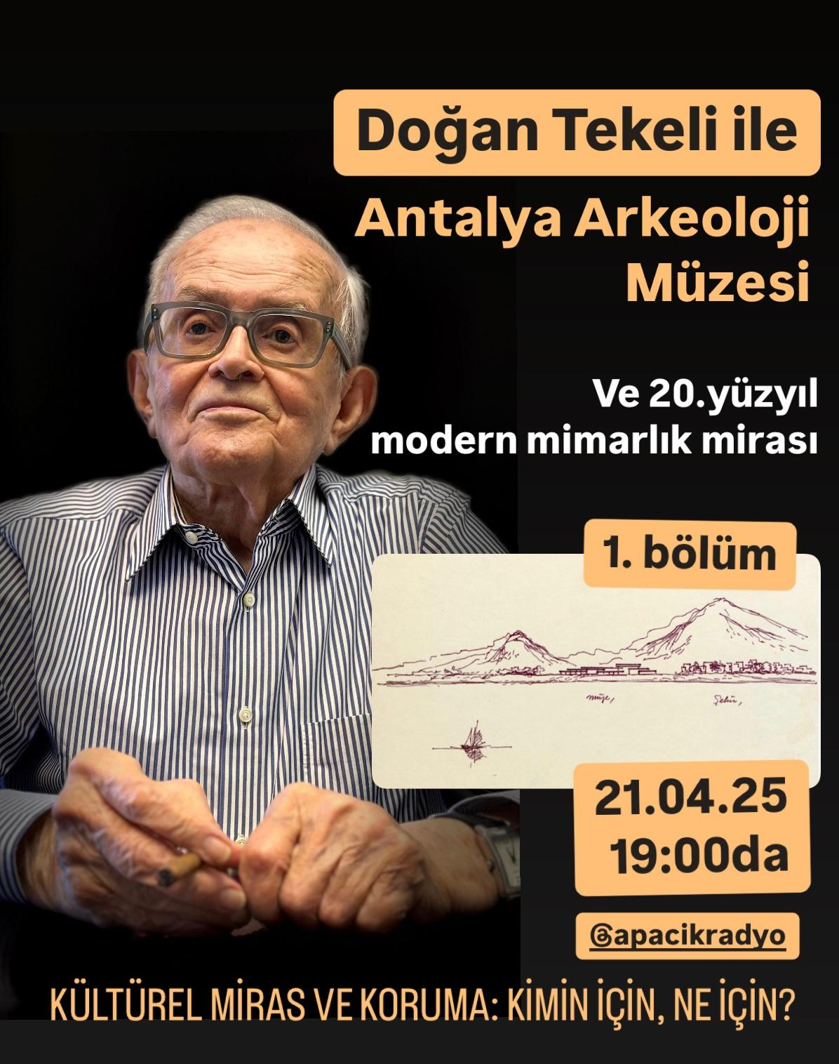 Bu akşam programa konuk olacak olan değerli Doğan Tekeli, Antalya Arkeoloji (Bölge) Müzesi projesinin, o dönem ortakları Sami Sisa ve Metin Hepgüler ile birlikte tasarımcısı ve müellifi. Bu kez eser Doğan Tekeli’nin kendisinden dinlenecek; bu yıkım kararı ve bizzat üretimde bulunduğu, önemli aktörlerinden biri olduğu dönem olan 20. yüzyıl mimarlık mirasının Türkiye’de korunması, korunamaması meselesi ile birlikte alınacak.